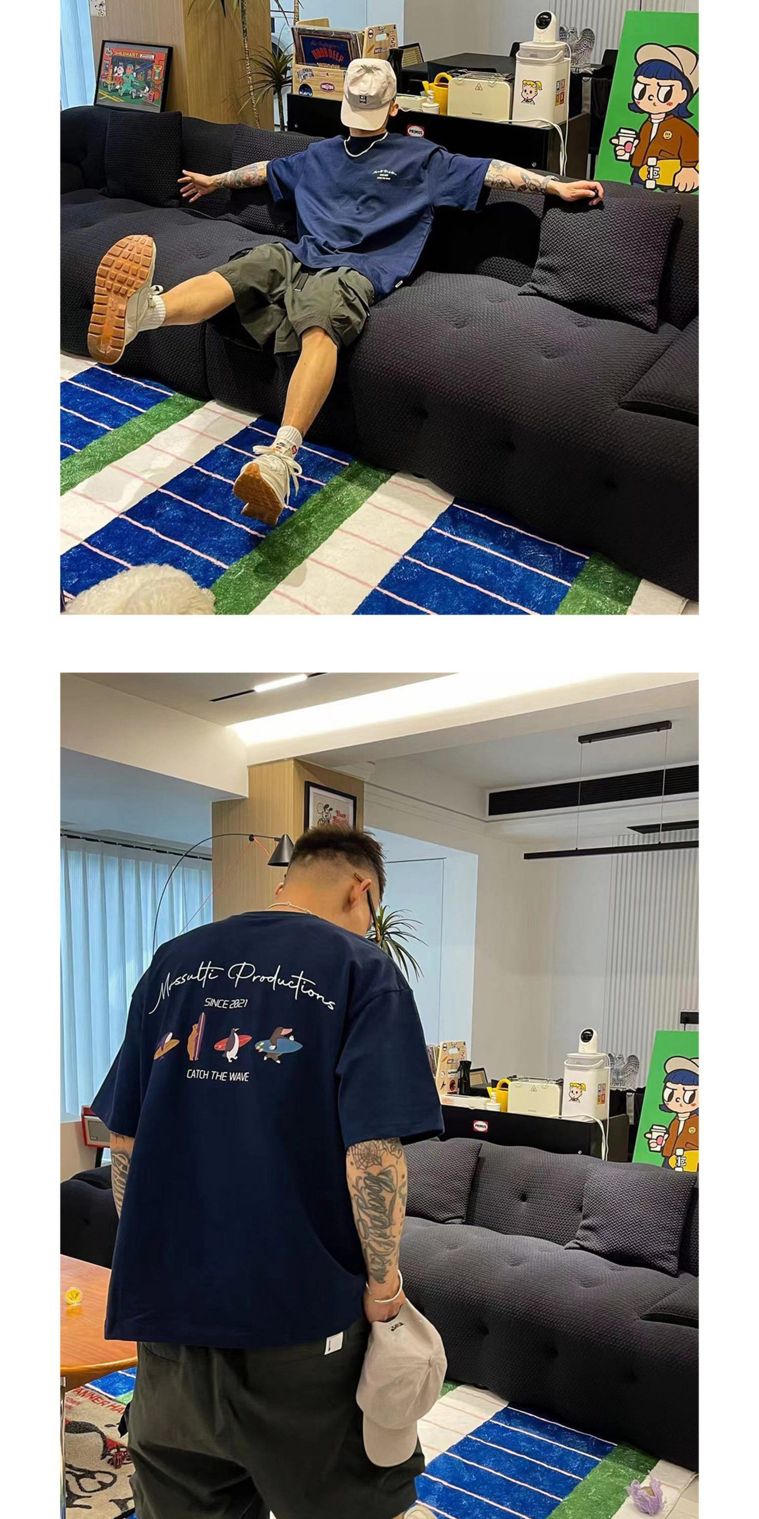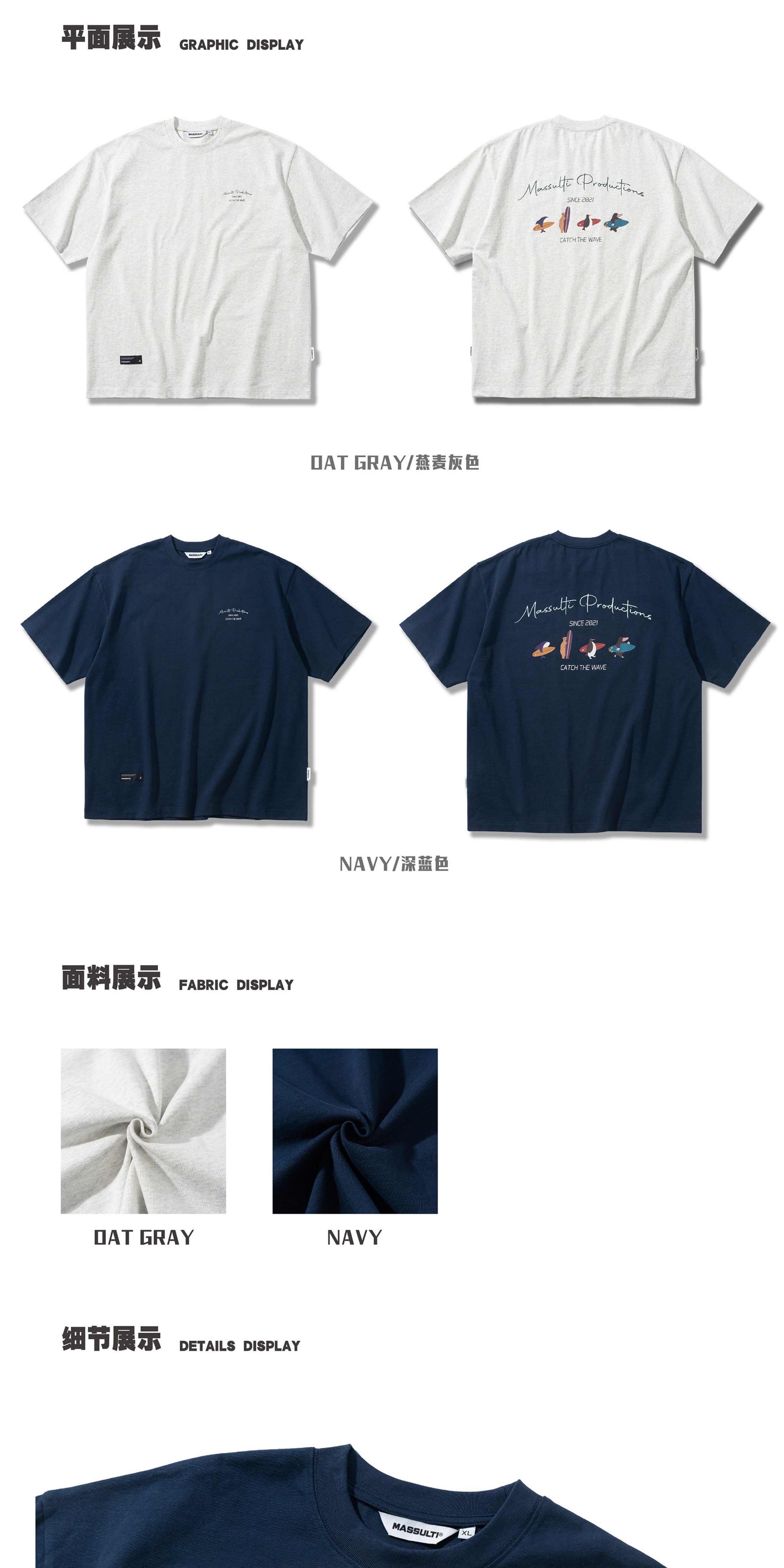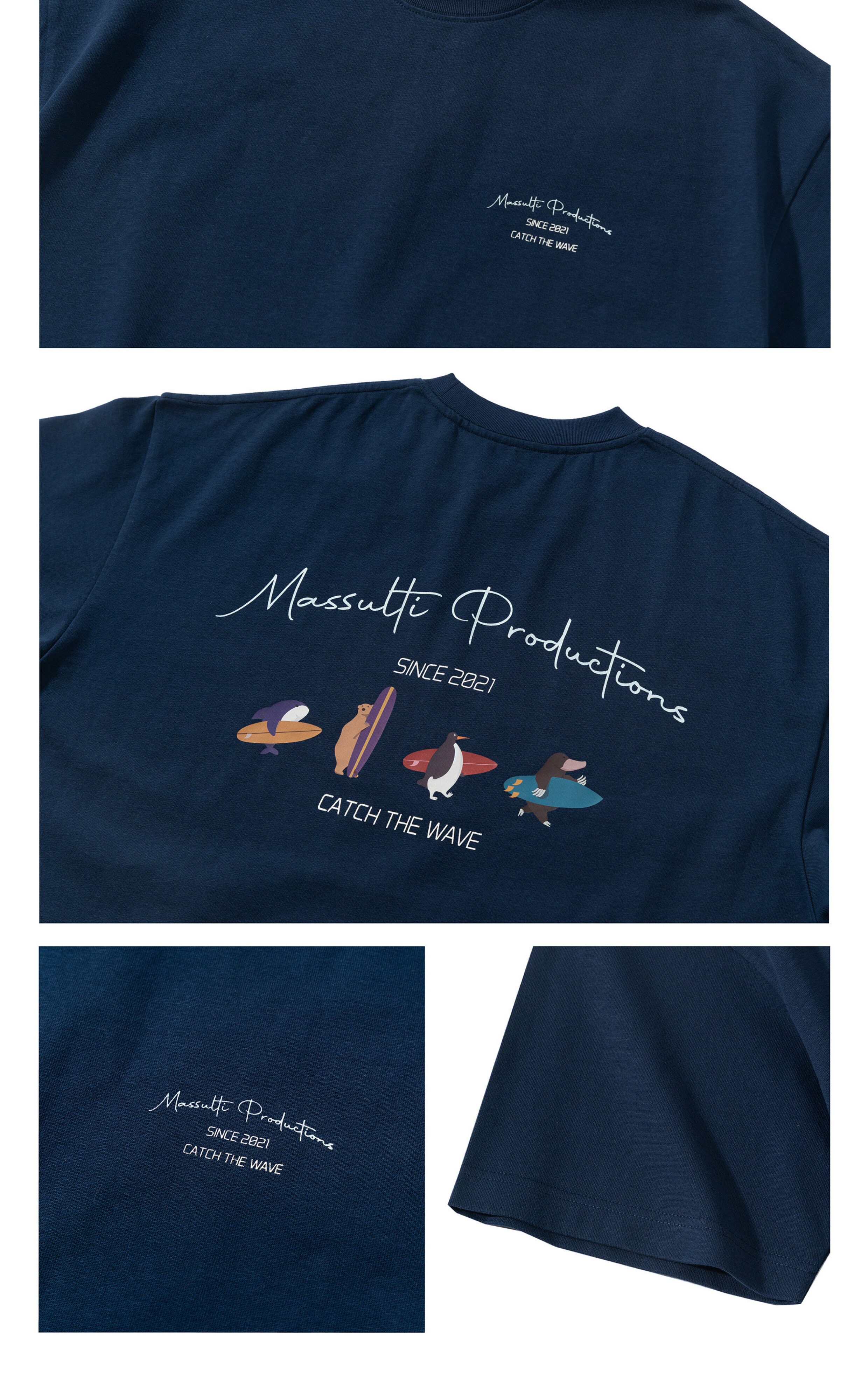 Massulti Japanese Style Summer New Fun Surf Print Loose Tee Base Layer Pure Cotton Heavyweight Short-Sleeve T-Shirt