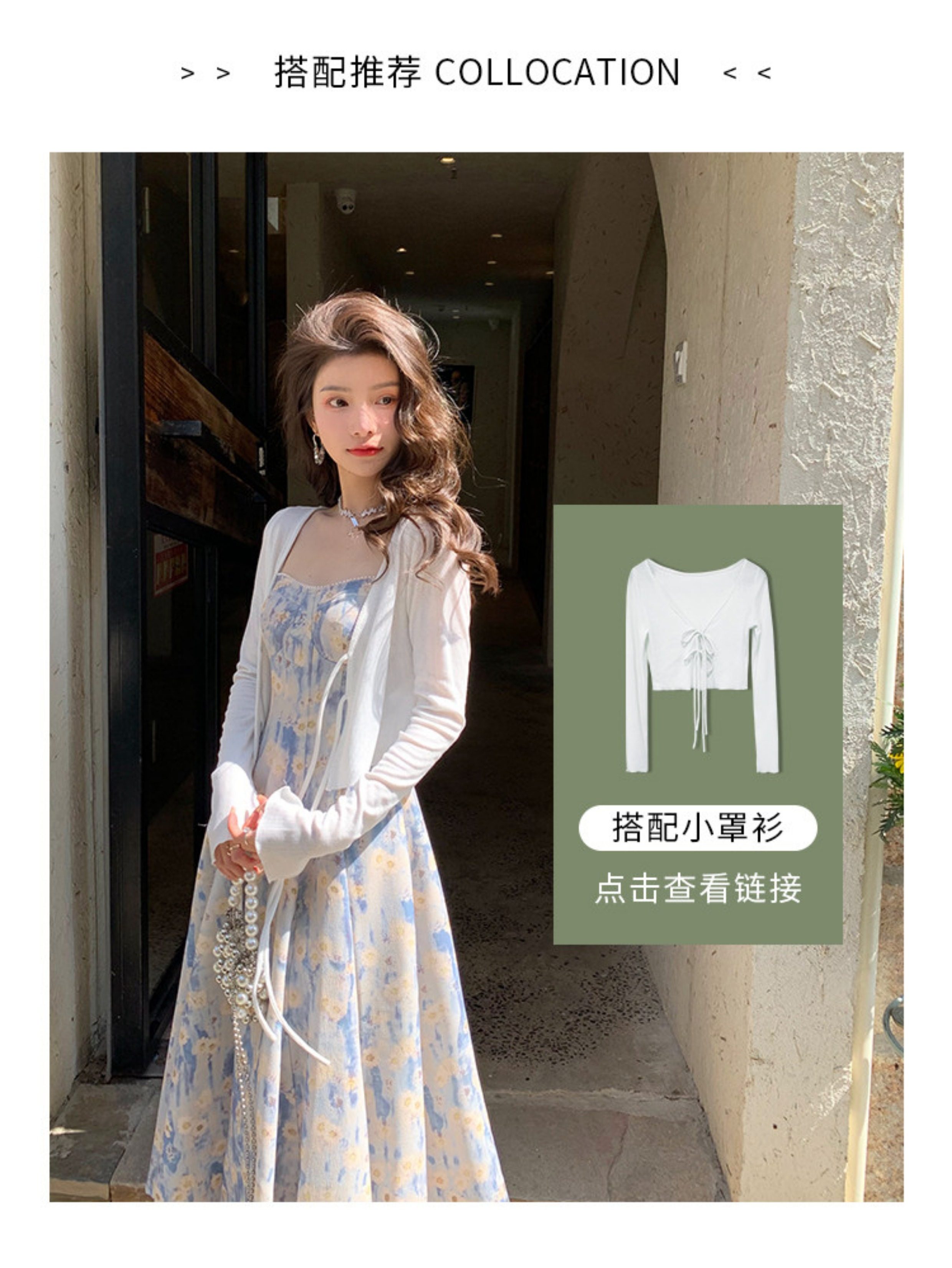Deng Liuli French-Style Blue Oil Painting Long Dress Seaside Vacation Beach Dress Large Swing Skirt Floral Spaghetti Strap Dress Women's Summer