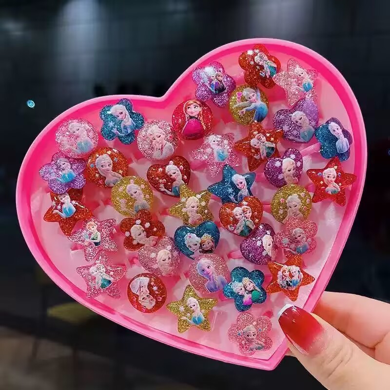 Children's Ring Cartoon Golden Sand Ice and Snow Princess Cartoon Ring Baby Kindergarten Little Girl Diamond Gift Gift Box