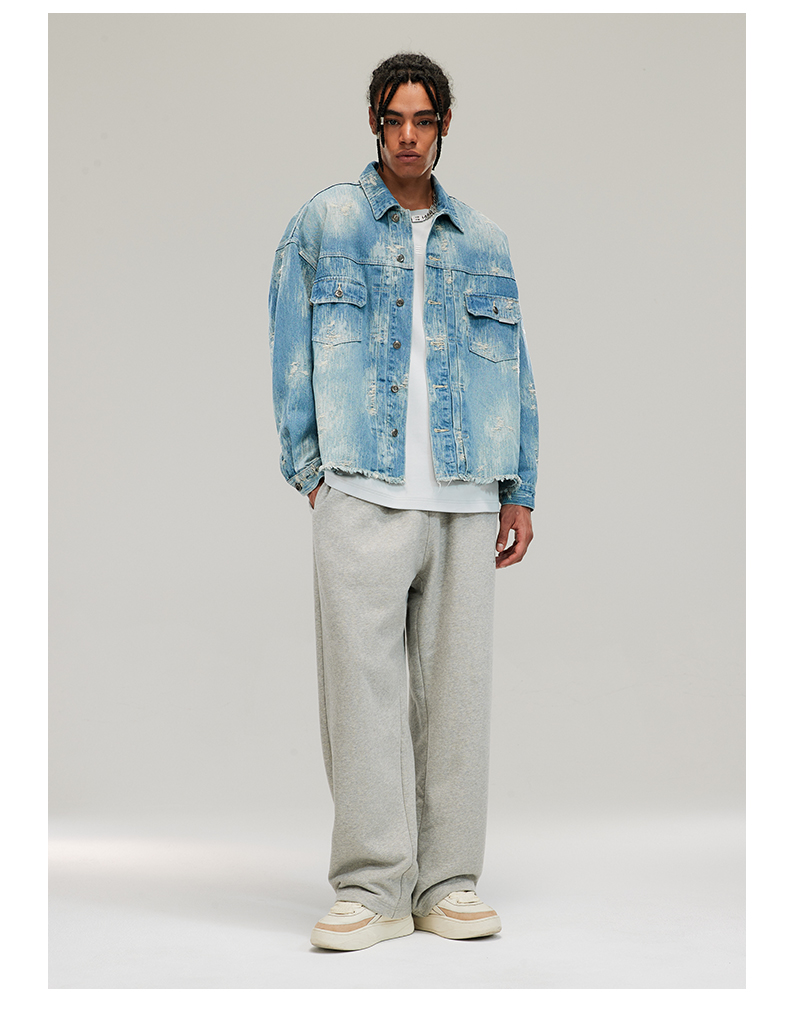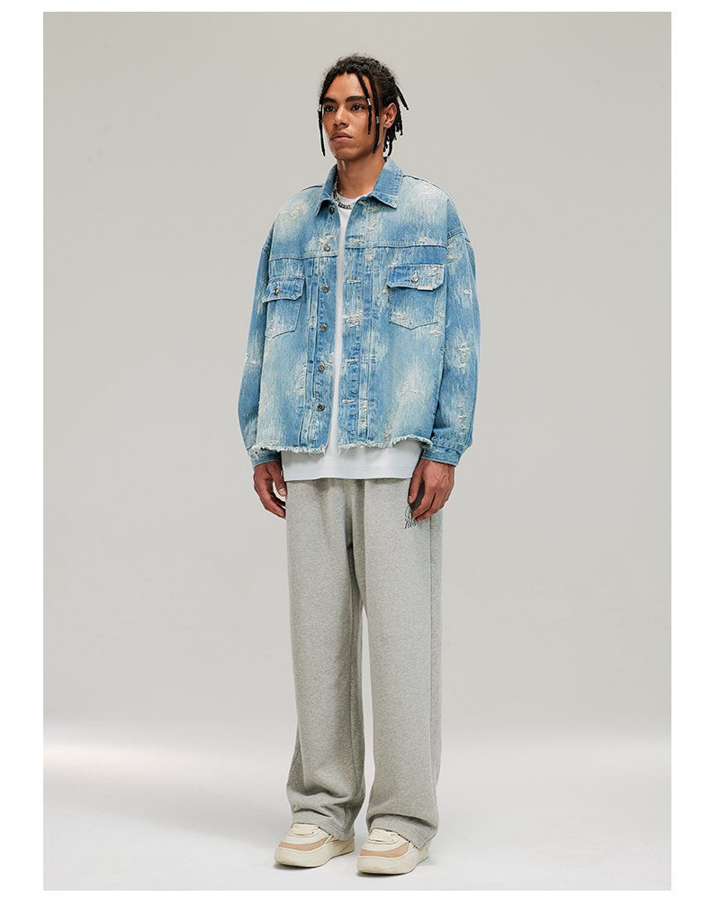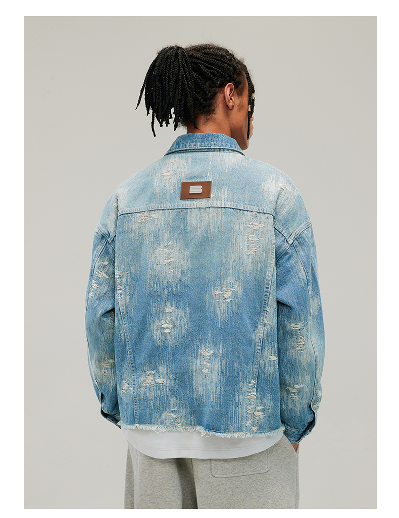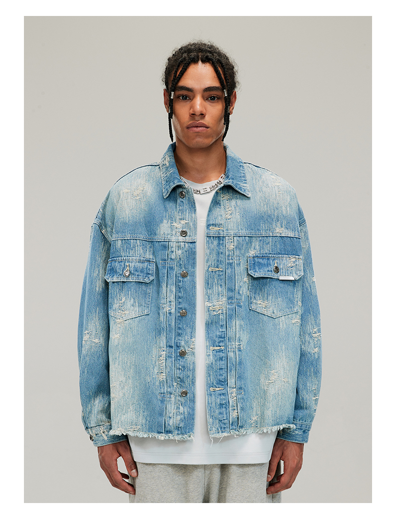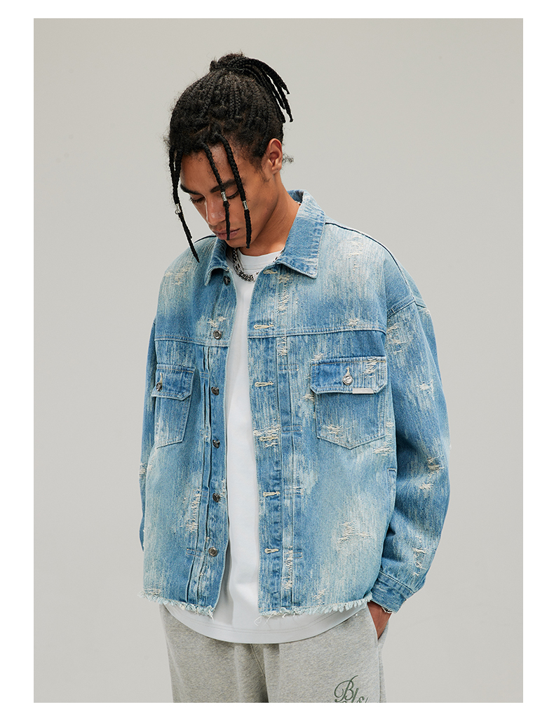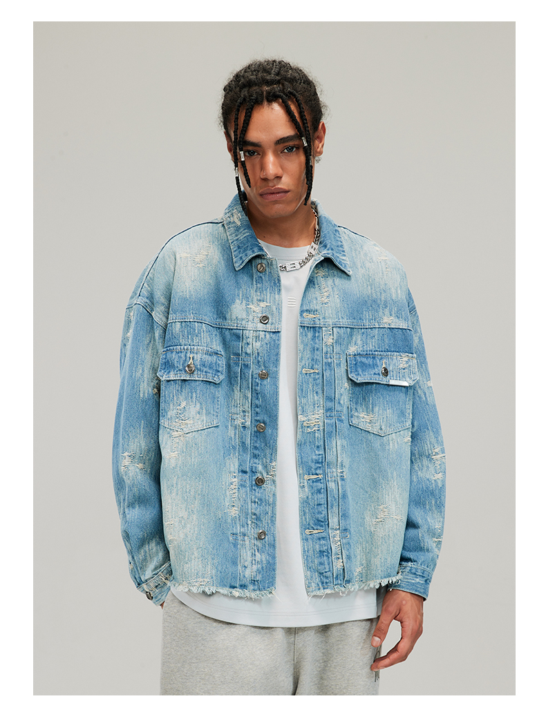 Boneless Washed Distressed Hem Raw Edge Textured Denim Jacket Autumn American Style Trendy Brand Top for Men
