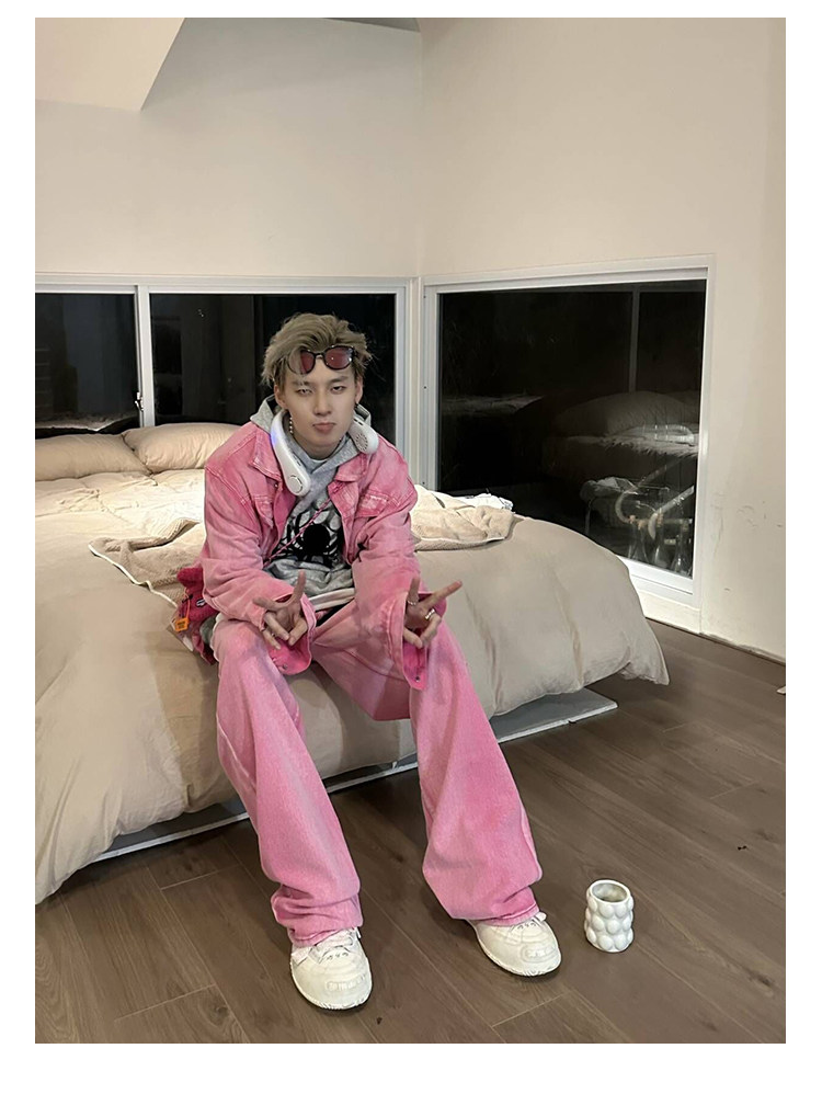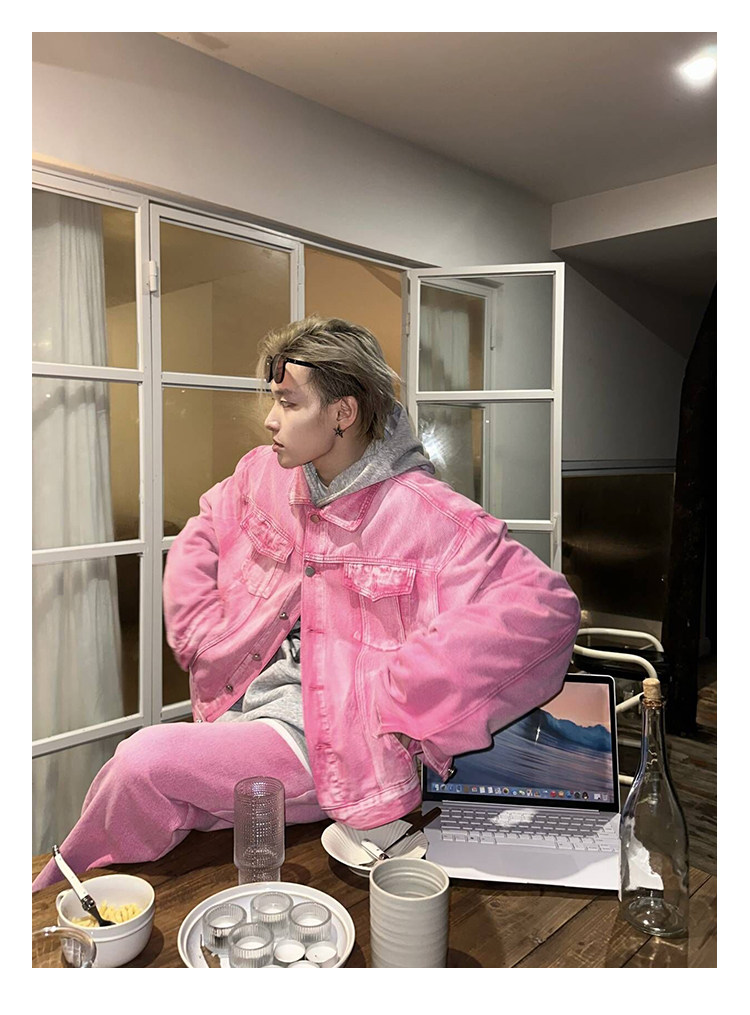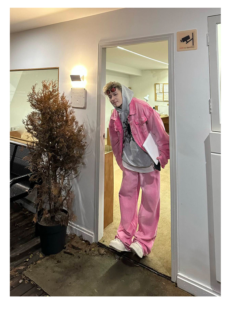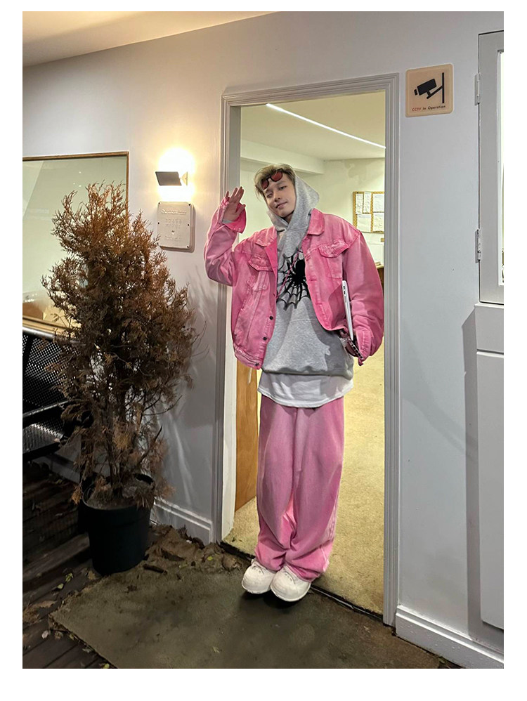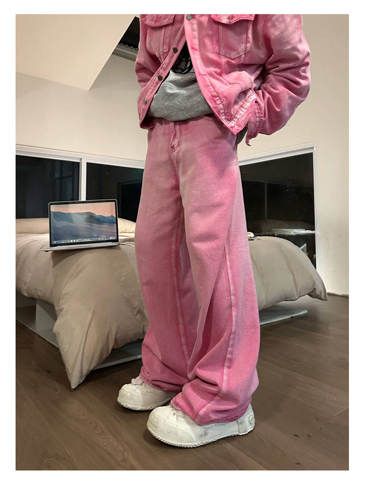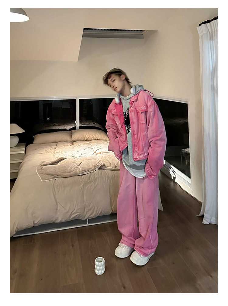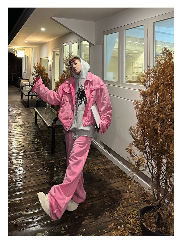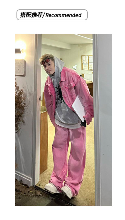 Necoyep Autumn American Retro Distressed Pink Denim Jacket and Pants Set for Men, Two-Piece Set