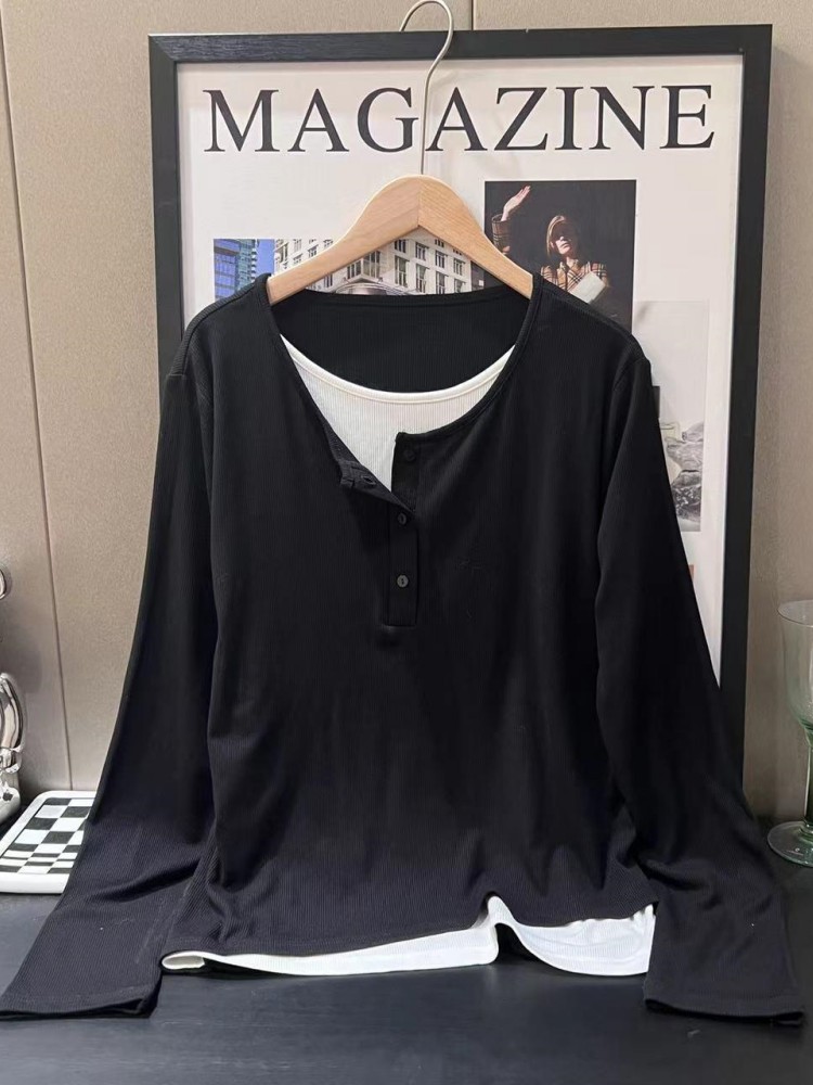 Plus Size Women's Regular Shoulder Fake Two-Piece Top, New Spring and Autumn Style, Slimming Long-Sleeve Inner Knit Base Shirt T-Shirt for Fat Women