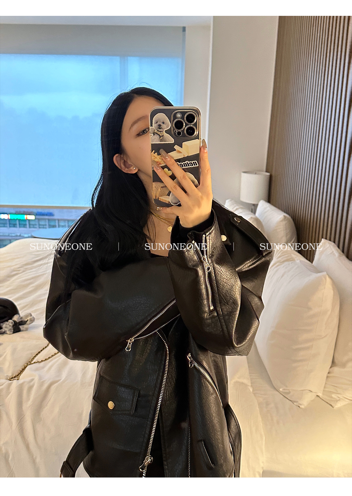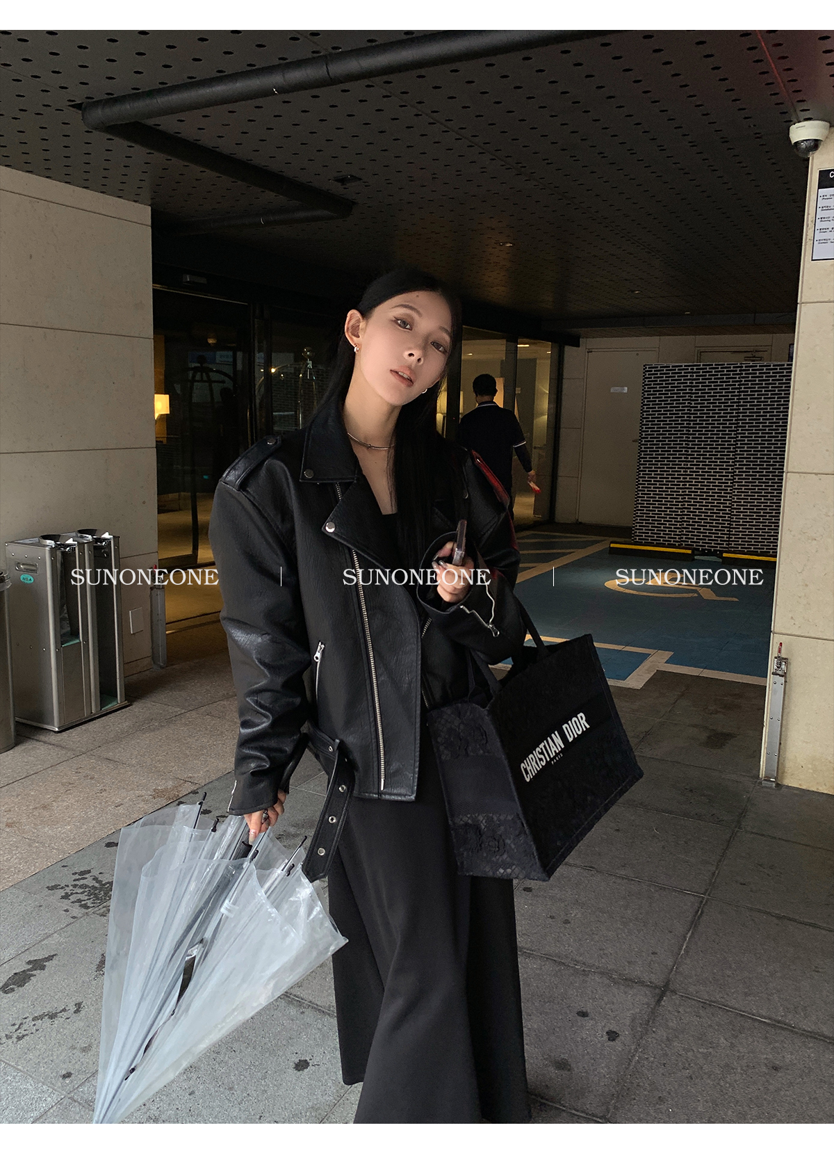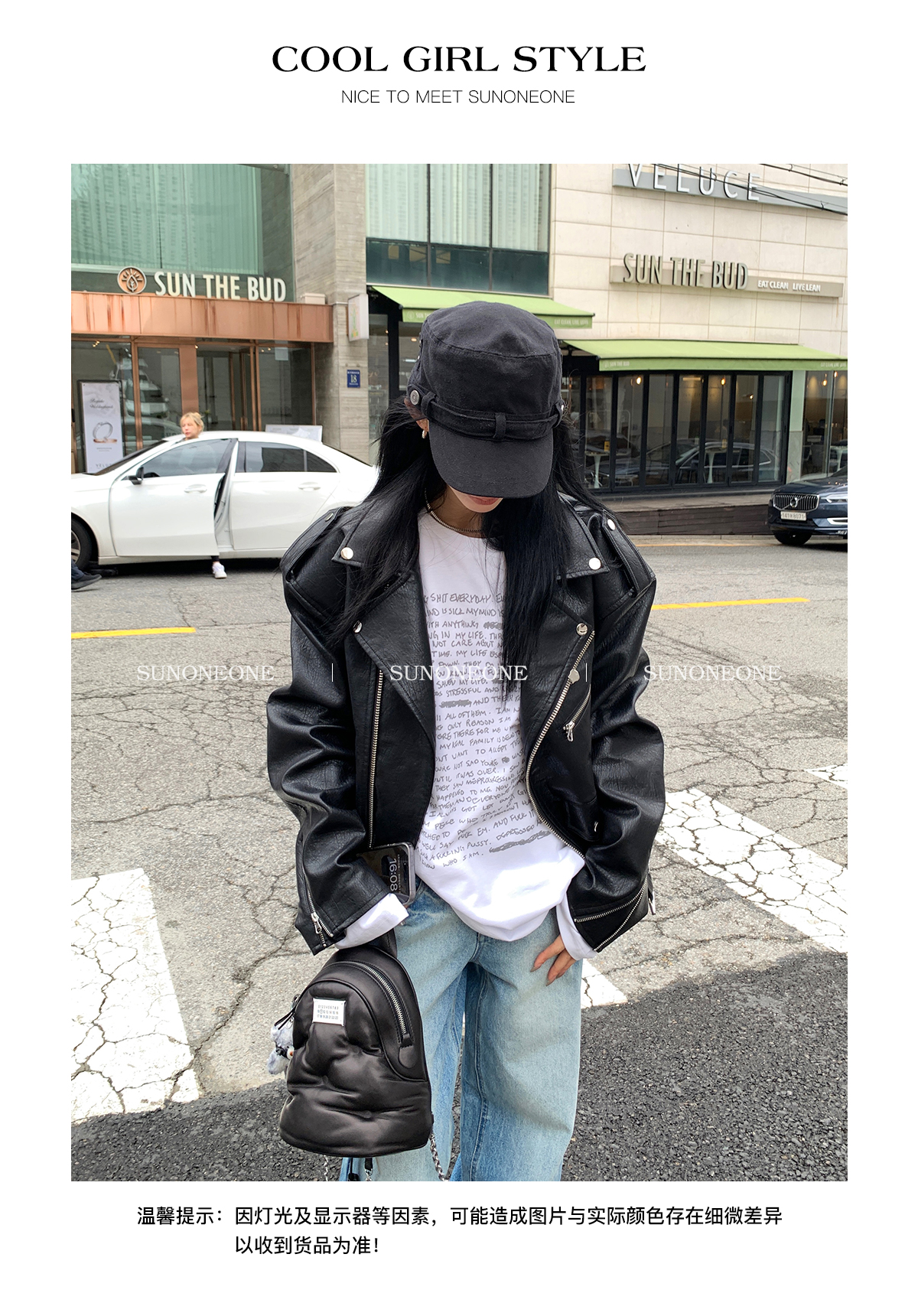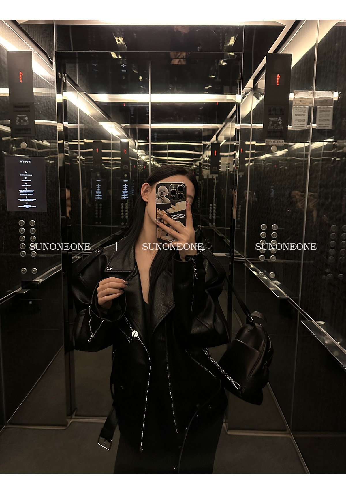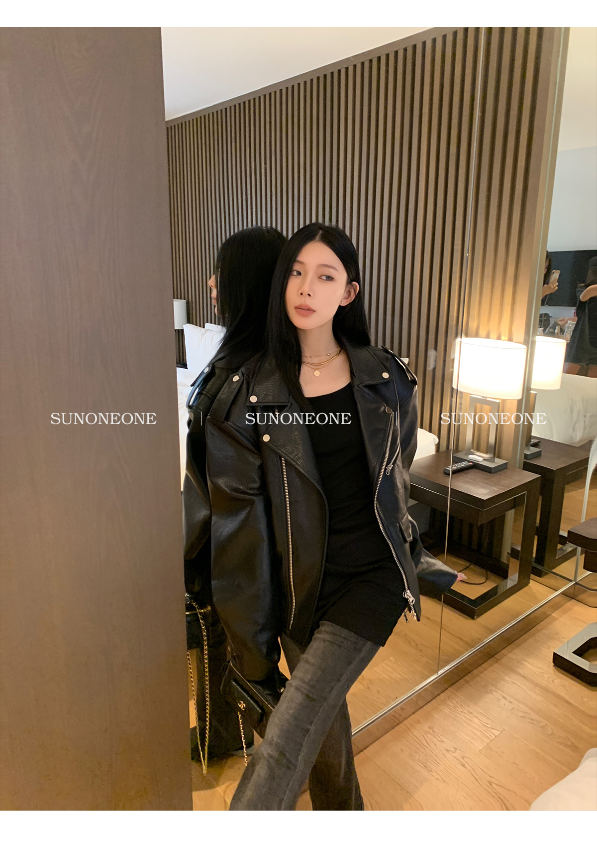 Sunoneone Heavy-Duty Pu Leather Motorcycle Jacket for Women, Autumn and Winter Vintage Black Leather Coat, Loose Long-Sleeve Slimming Top