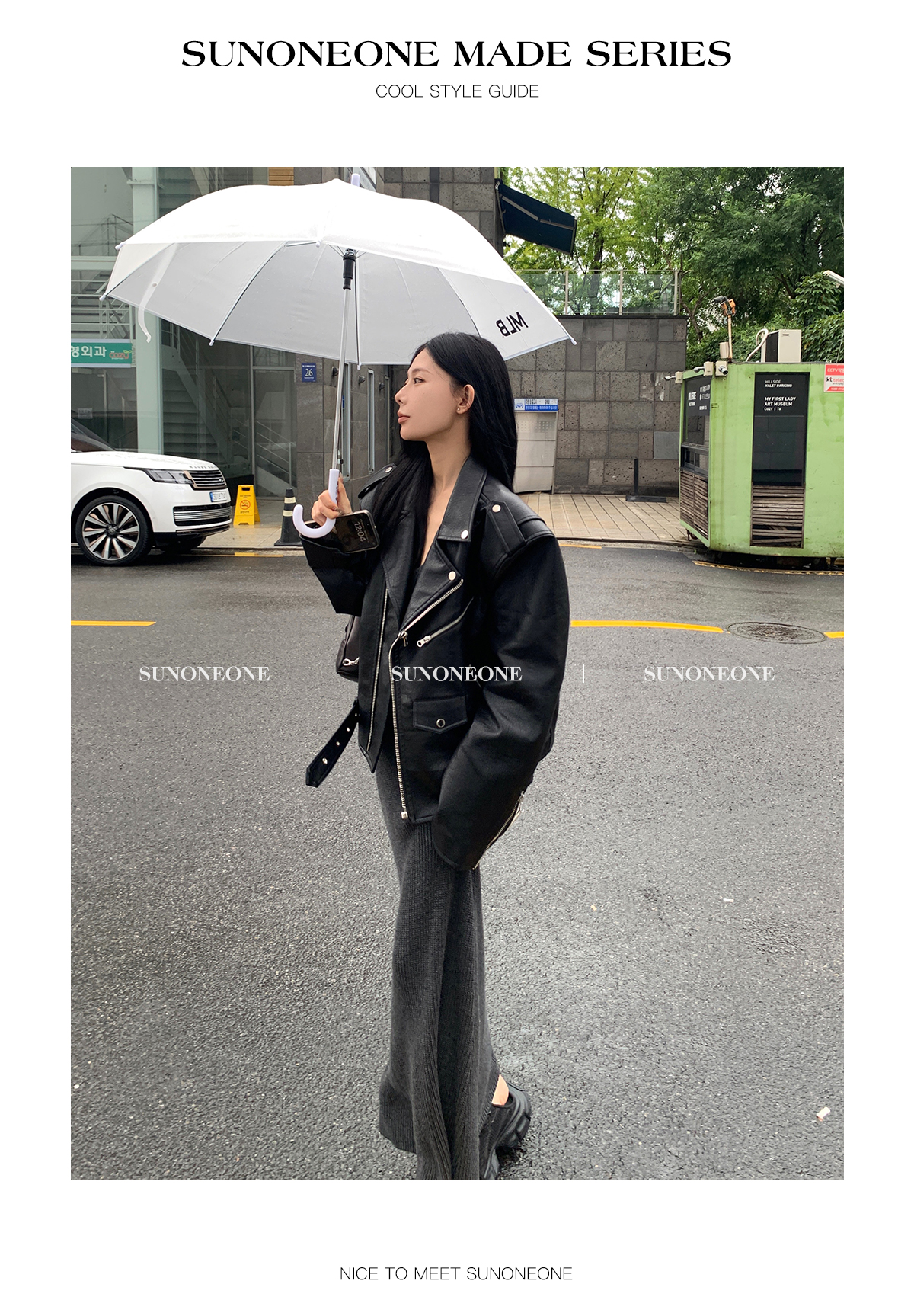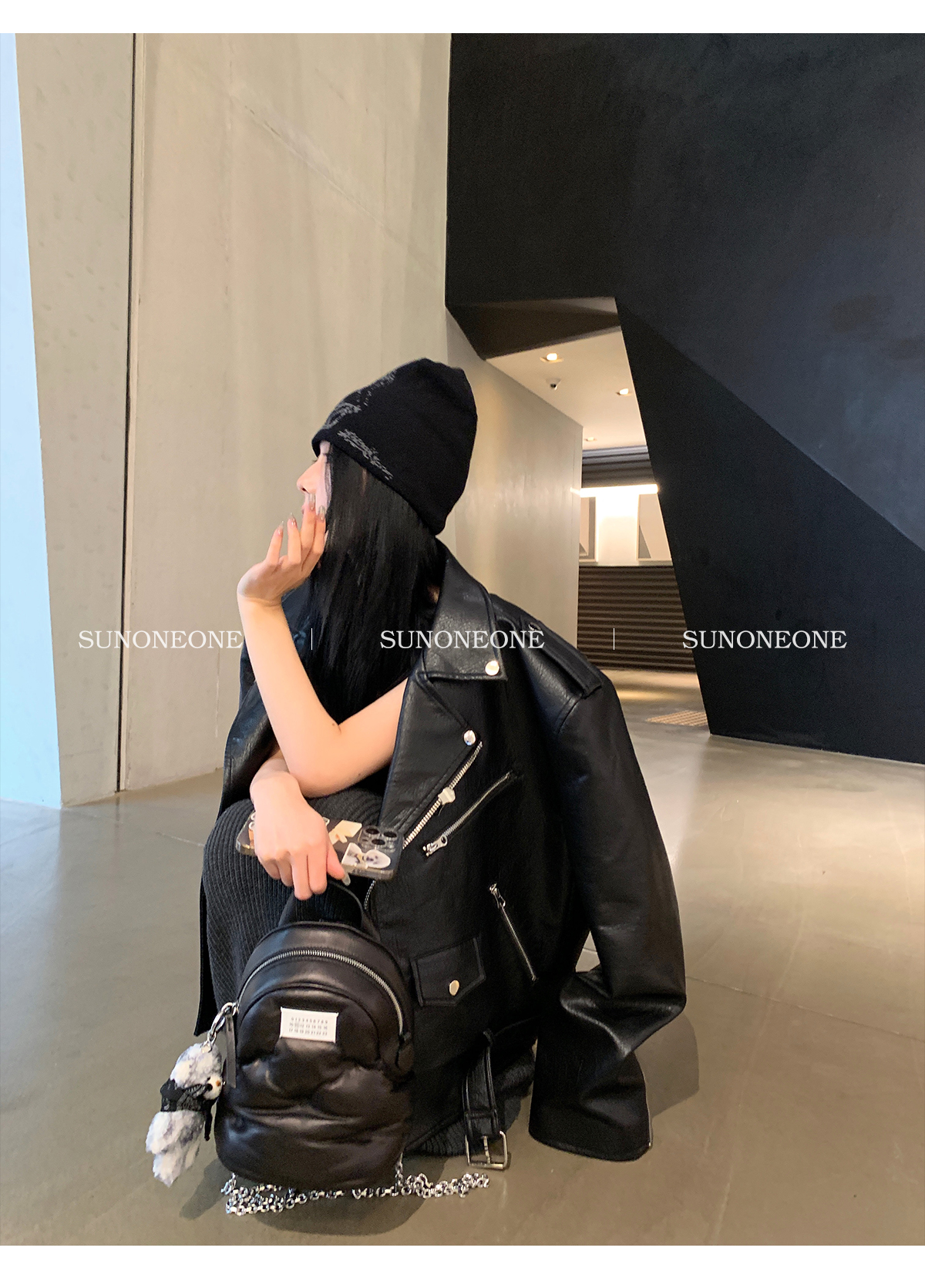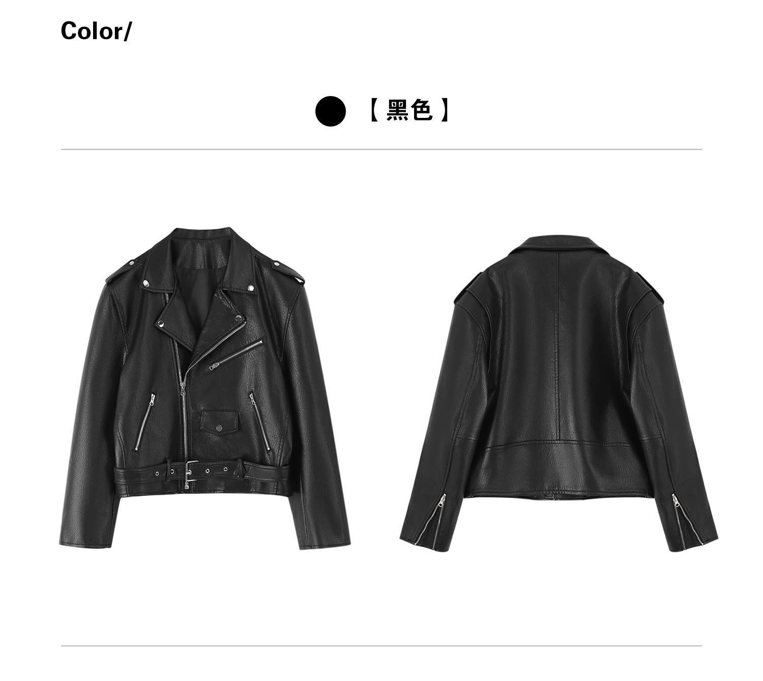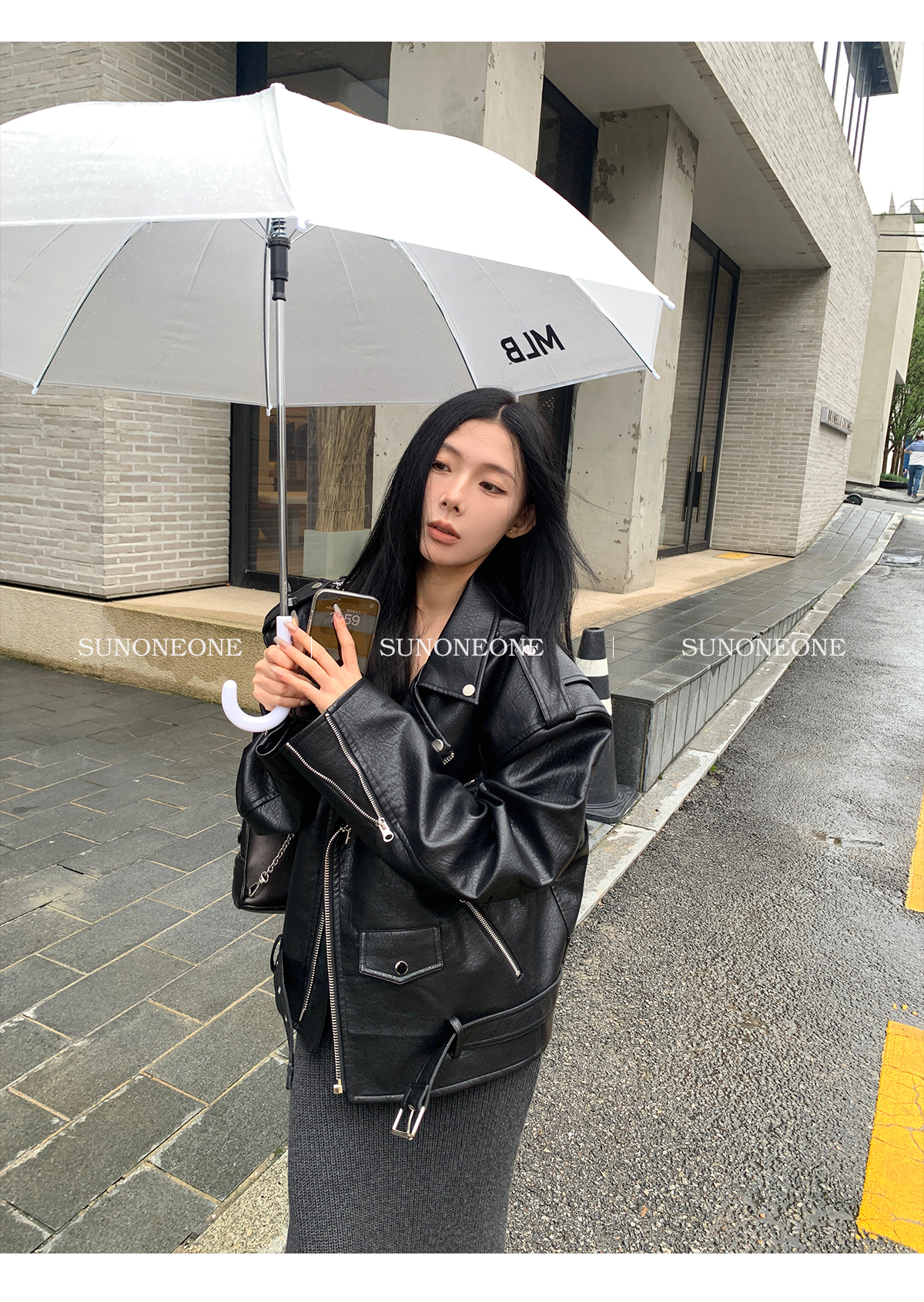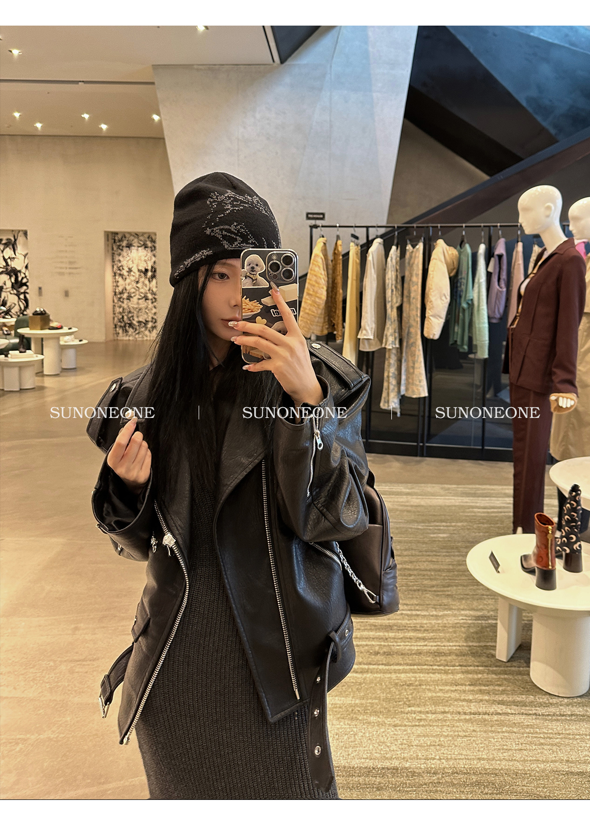 Sunoneone Heavy-Duty Pu Leather Motorcycle Jacket for Women, Autumn and Winter Vintage Black Leather Coat, Loose Long-Sleeve Slimming Top