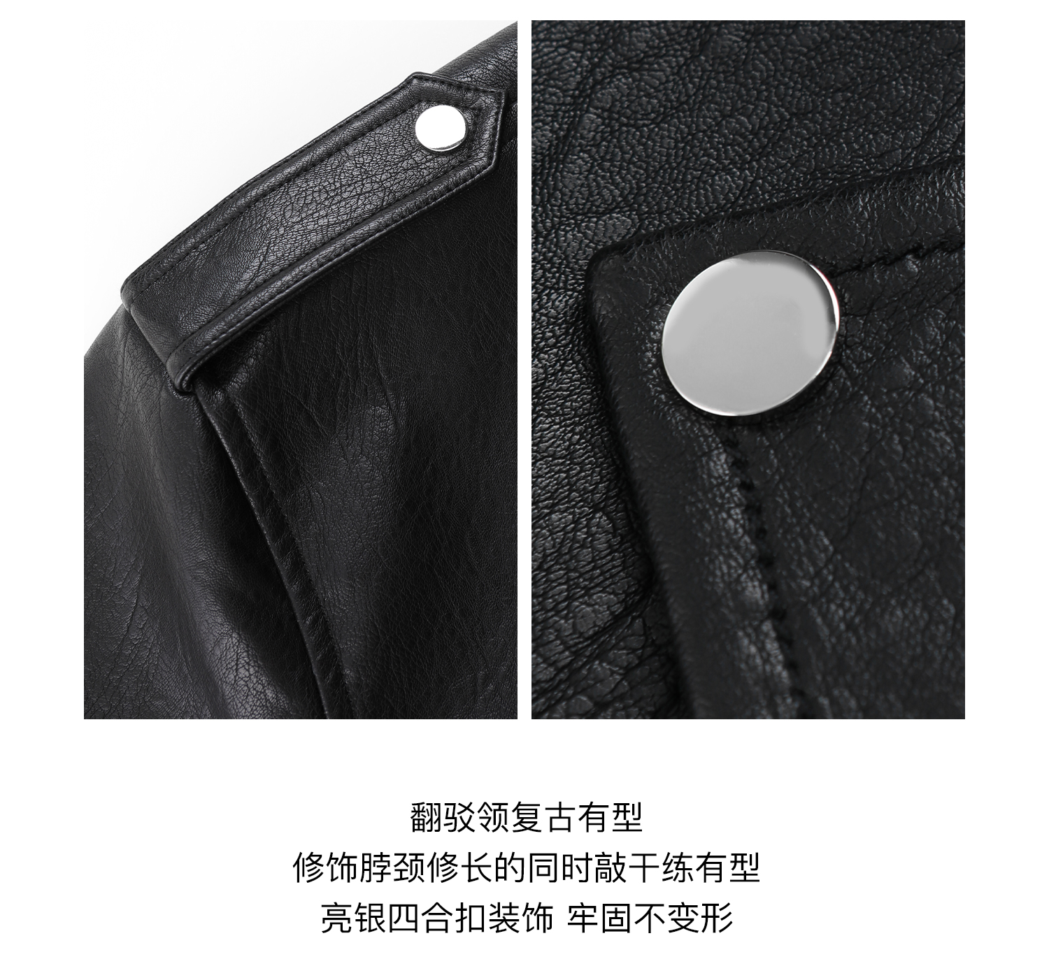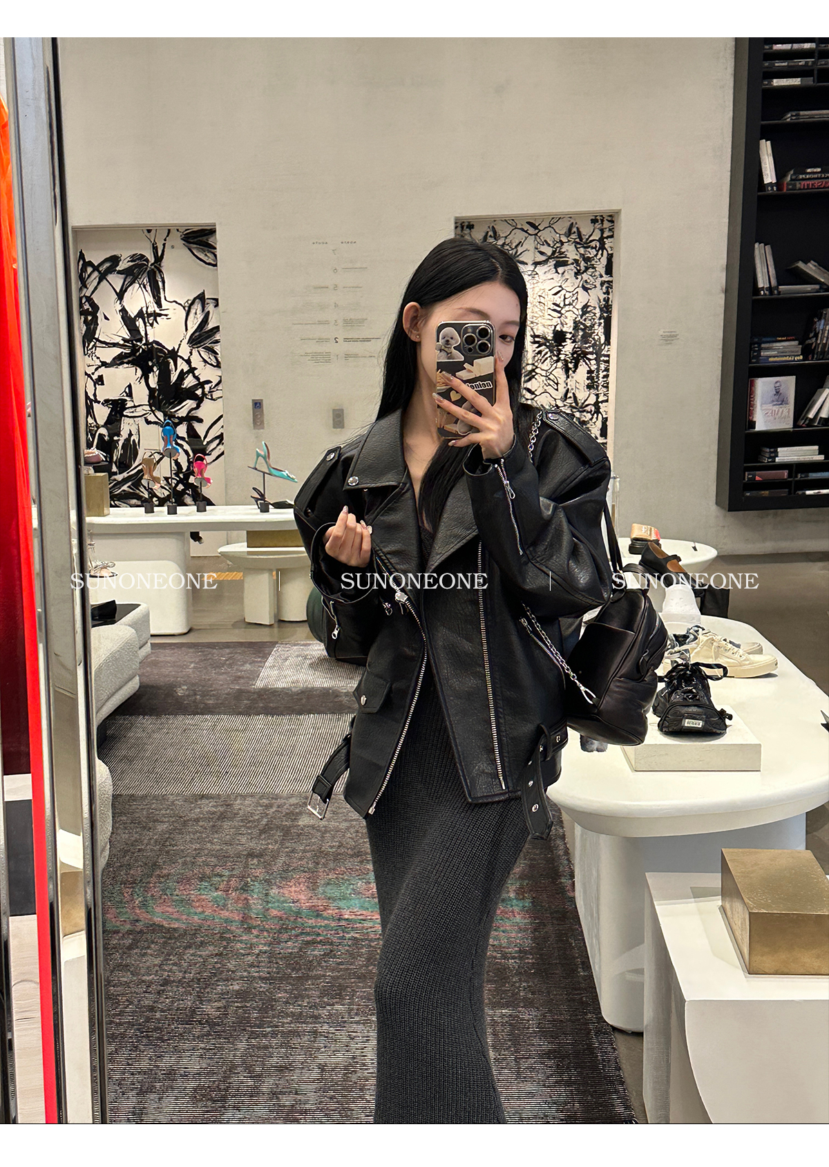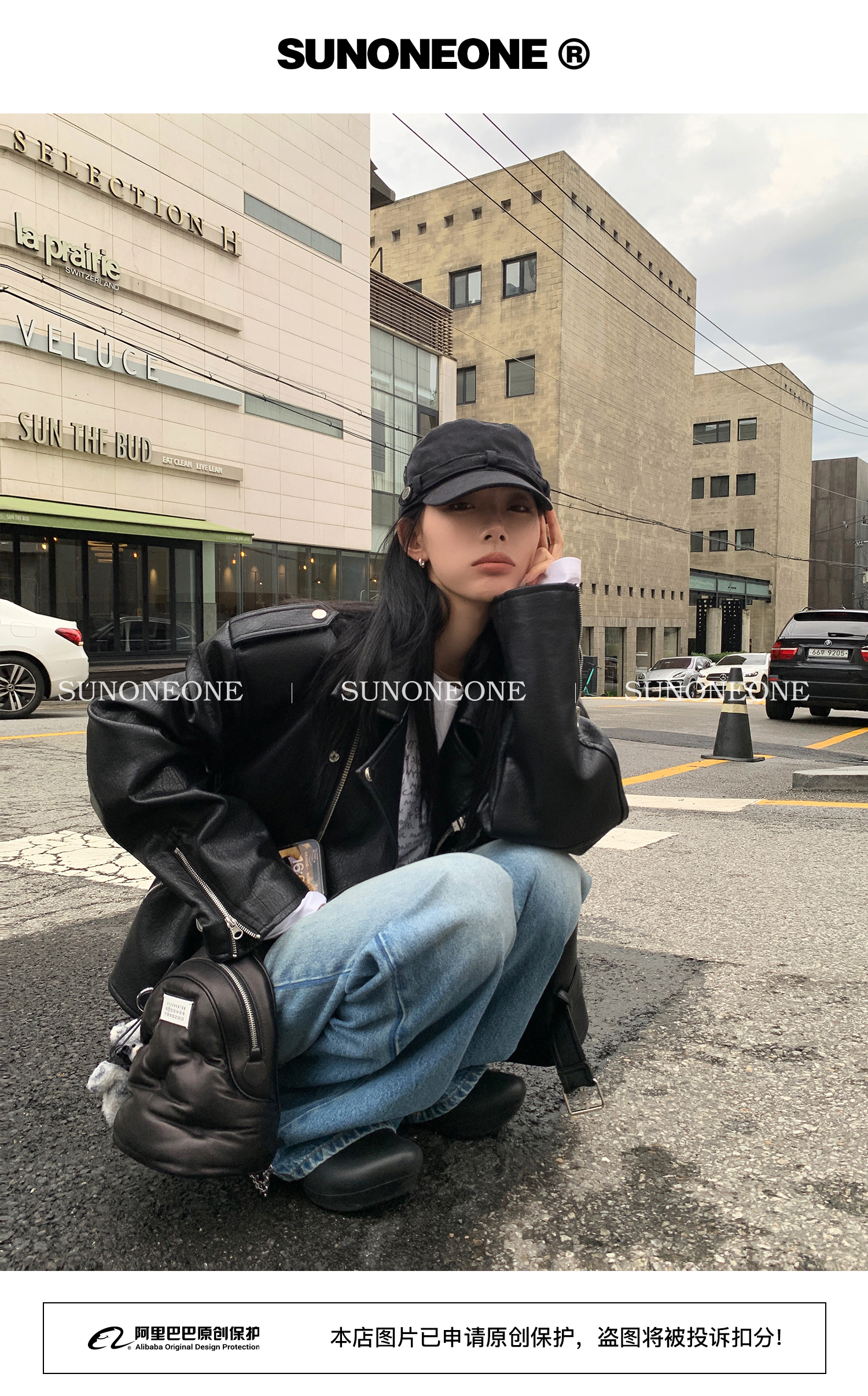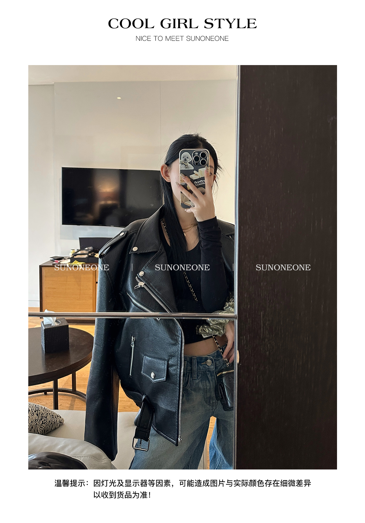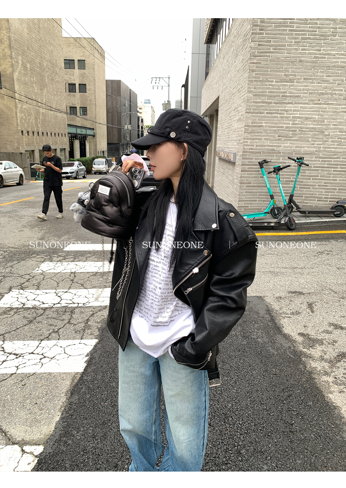 Sunoneone Heavy-Duty Pu Leather Motorcycle Jacket for Women, Autumn and Winter Vintage Black Leather Coat, Loose Long-Sleeve Slimming Top