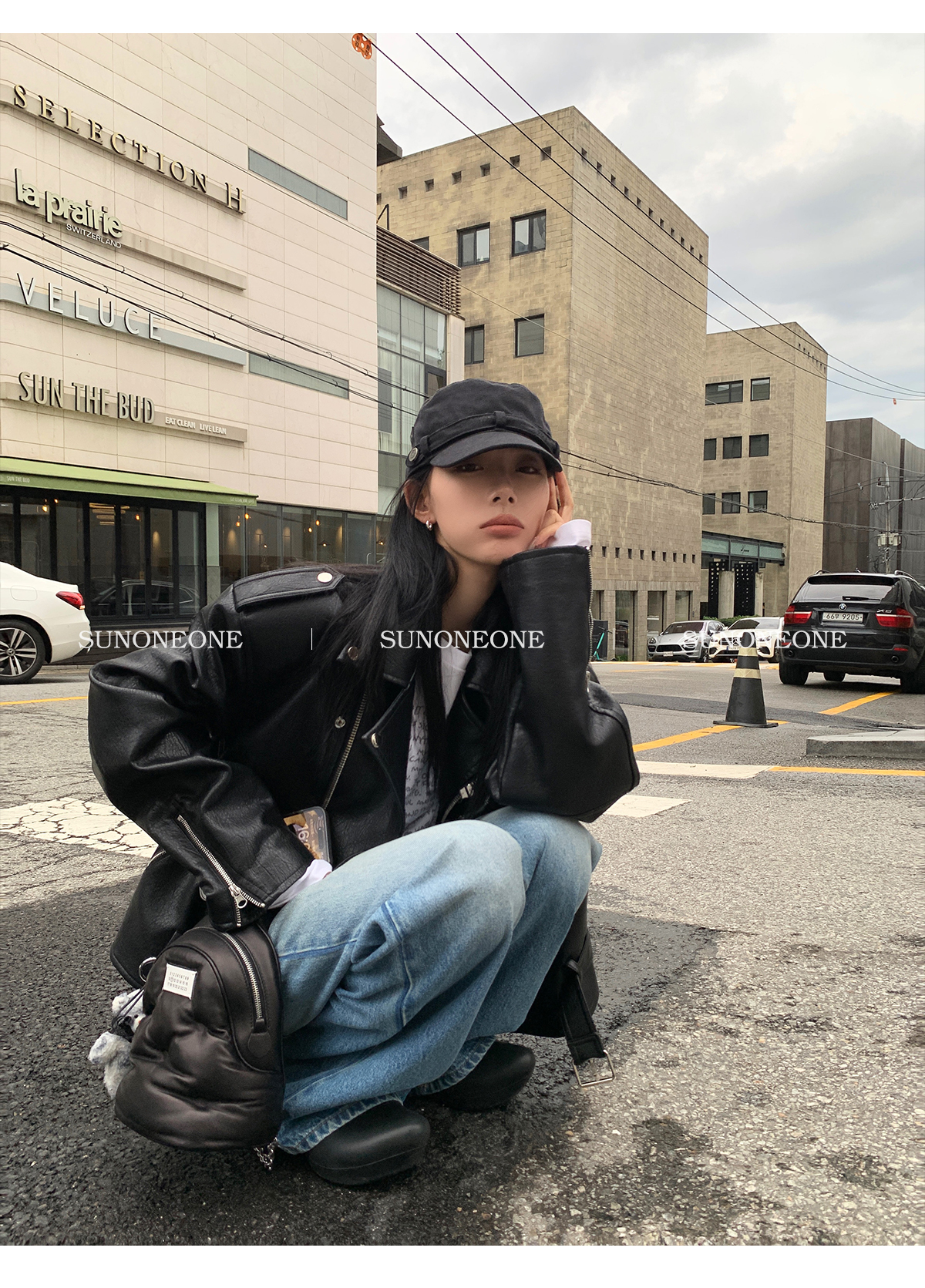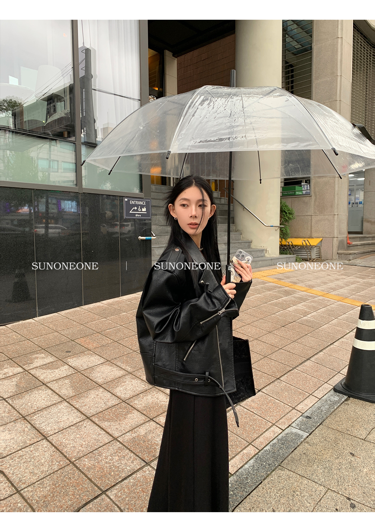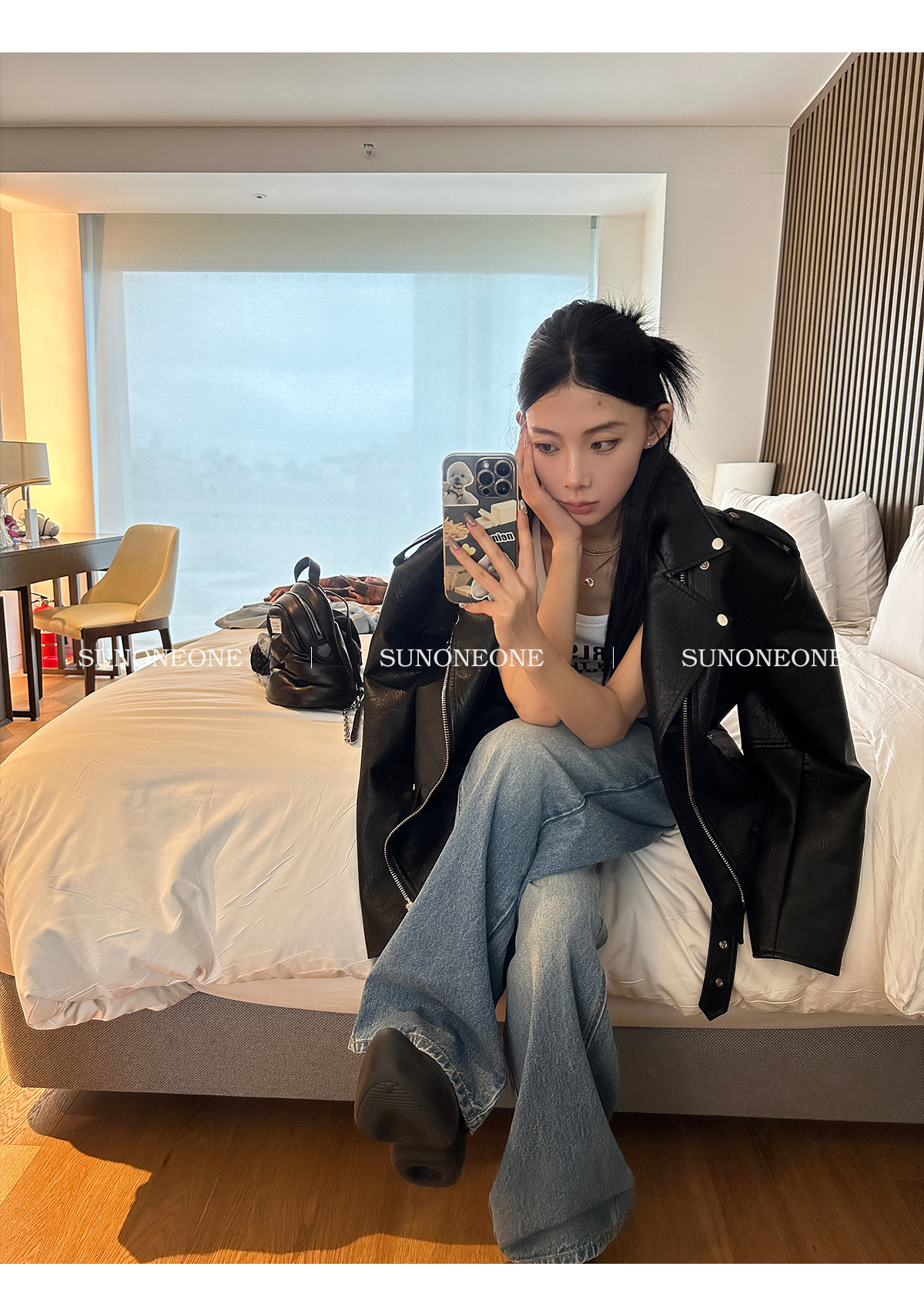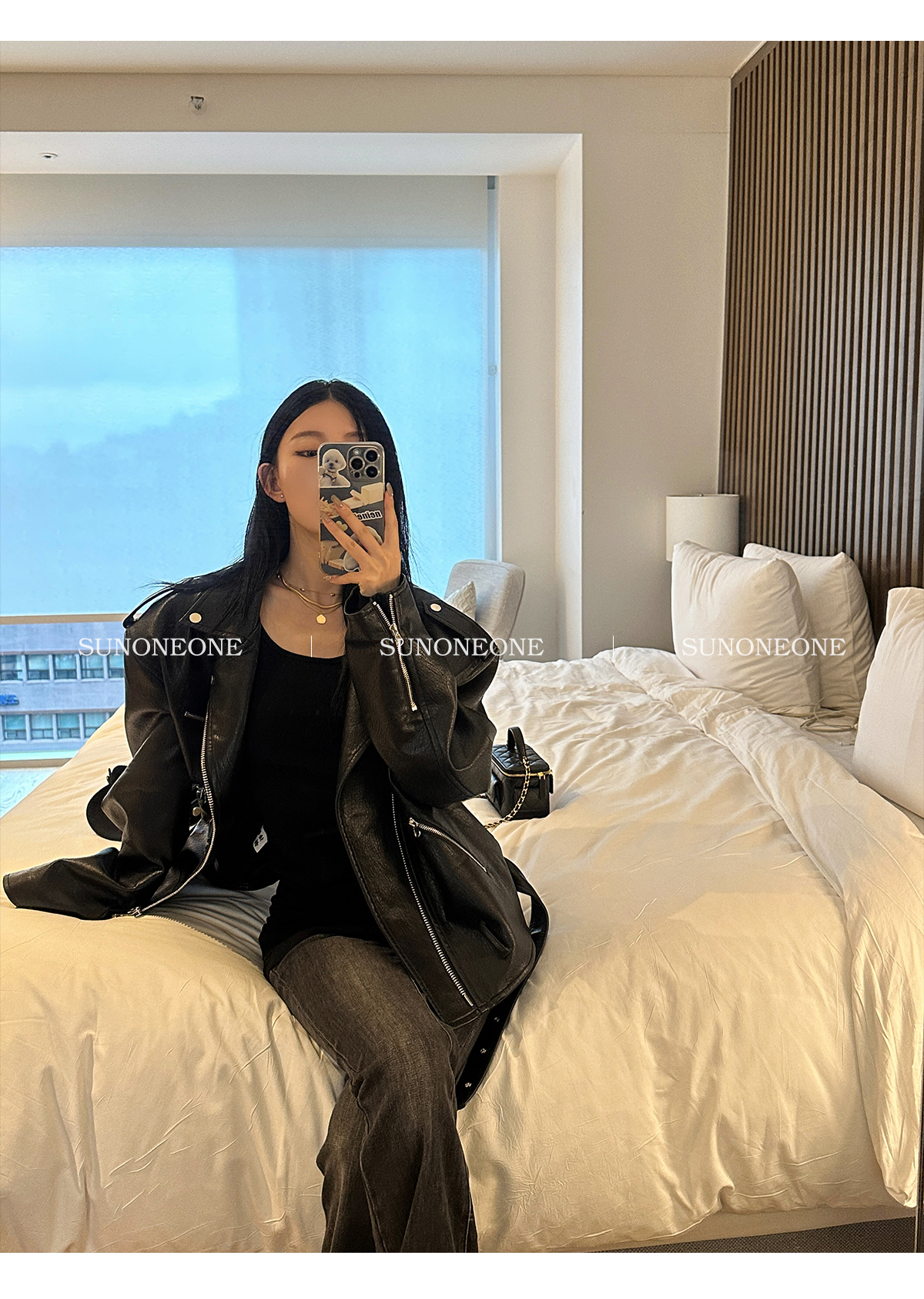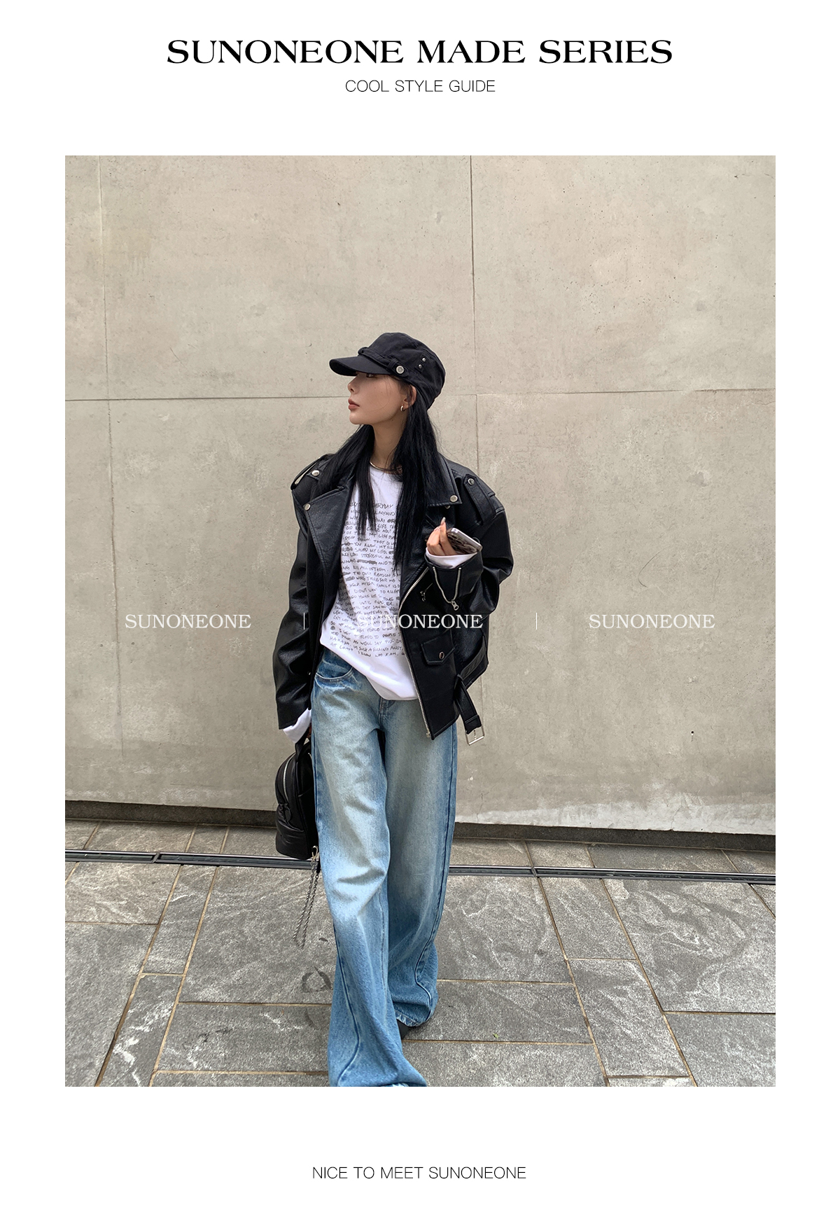 Sunoneone Heavy-Duty Pu Leather Motorcycle Jacket for Women, Autumn and Winter Vintage Black Leather Coat, Loose Long-Sleeve Slimming Top