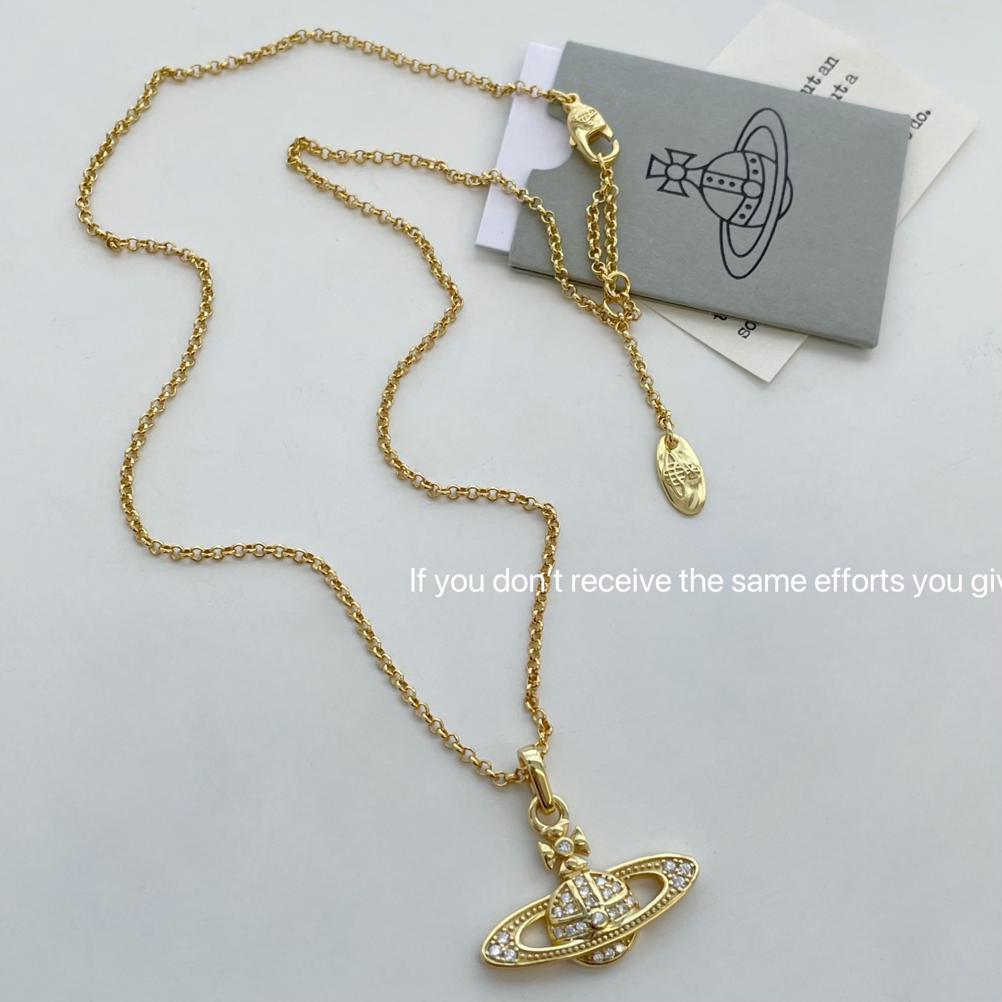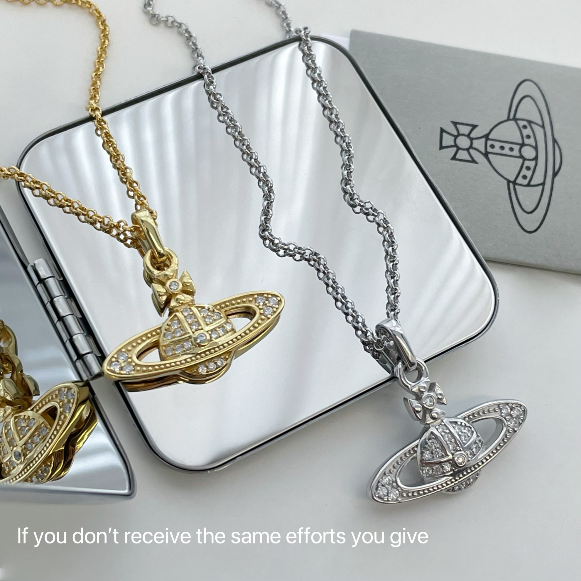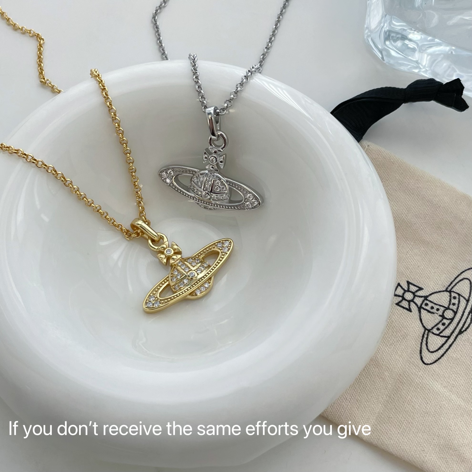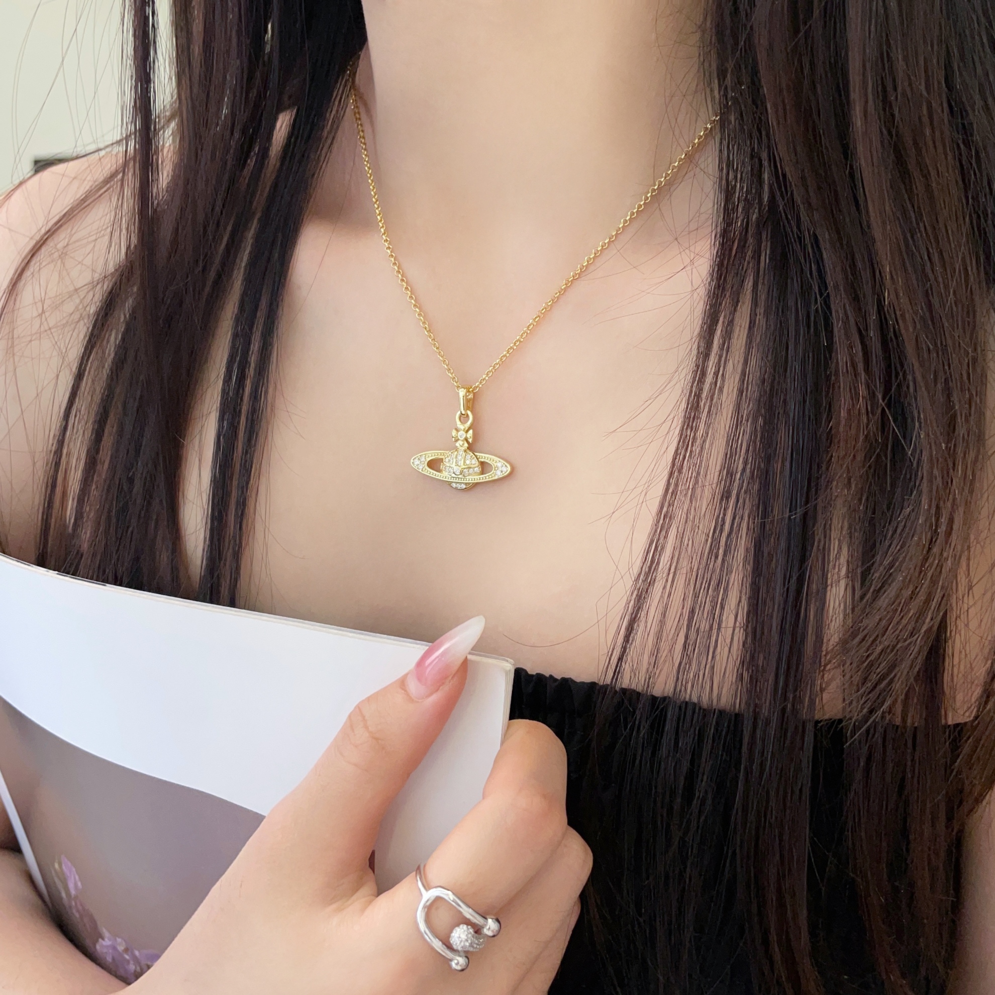 S925 Sterling Silver Queen Mother Vivian Full Zircon Saturn Necklace, Light Luxury, Unique, Ins-Style, High-End Gold-Plated Collarbone Chain