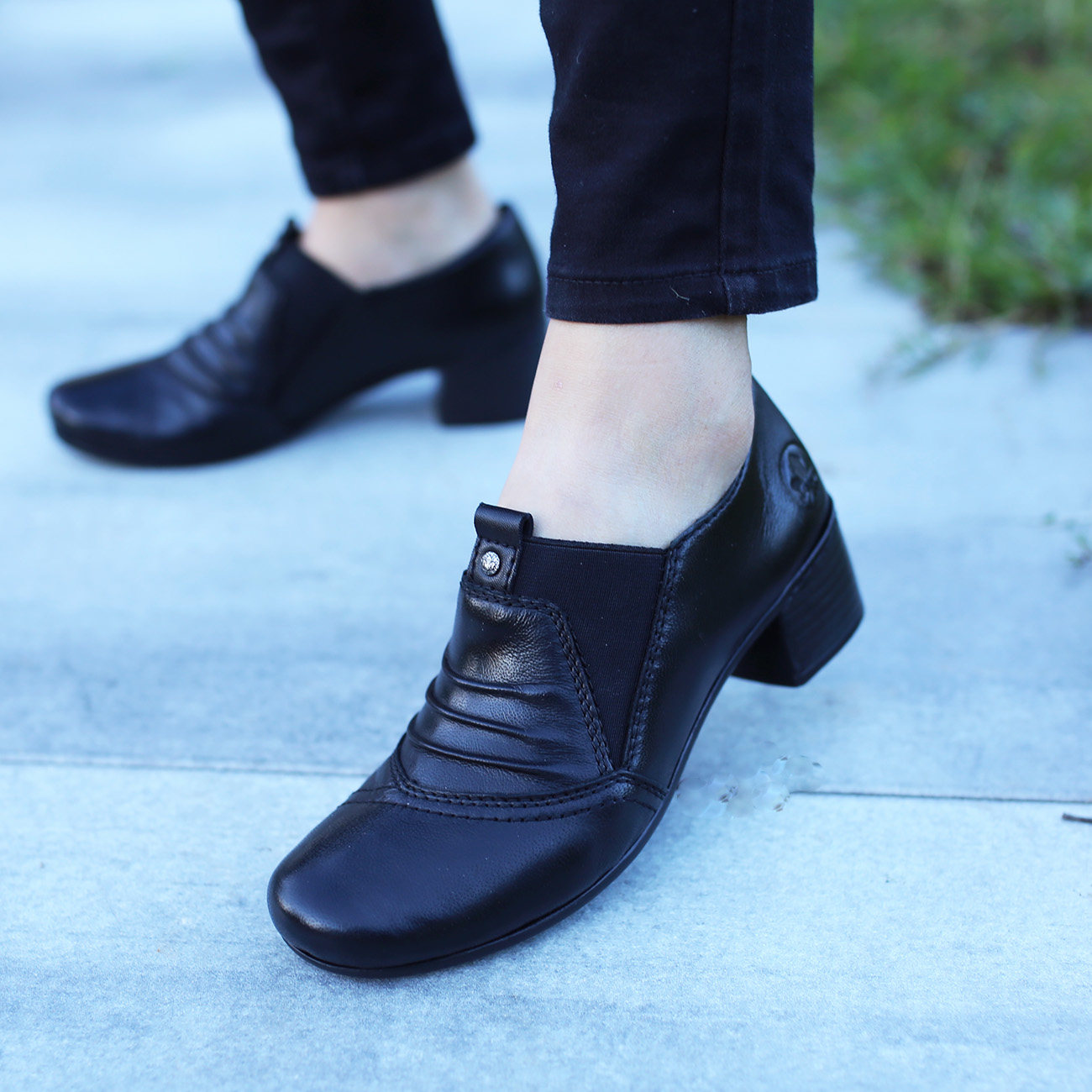 Rieker ladies shoes 41657-01 black Fashion meets Function. Diese tiefschwarzen Slipper von Rieker überzeugen durch modernes Design und hohen Tragekomfort. Außerdem passt der Schuh dank des Elastikeinsatzes wie angegossen. Mit der schockabsorbierenden und leichten Sohle mit Blockabsatz werden deine Füße bei jedem Schritt verwöhnt. Die Slipper punkten auch noch mit einer weichen und besonders atmungsaktiven Leder-Einlegesohle. Einfach hineinschlüpfen und genießen - mit Rieker!