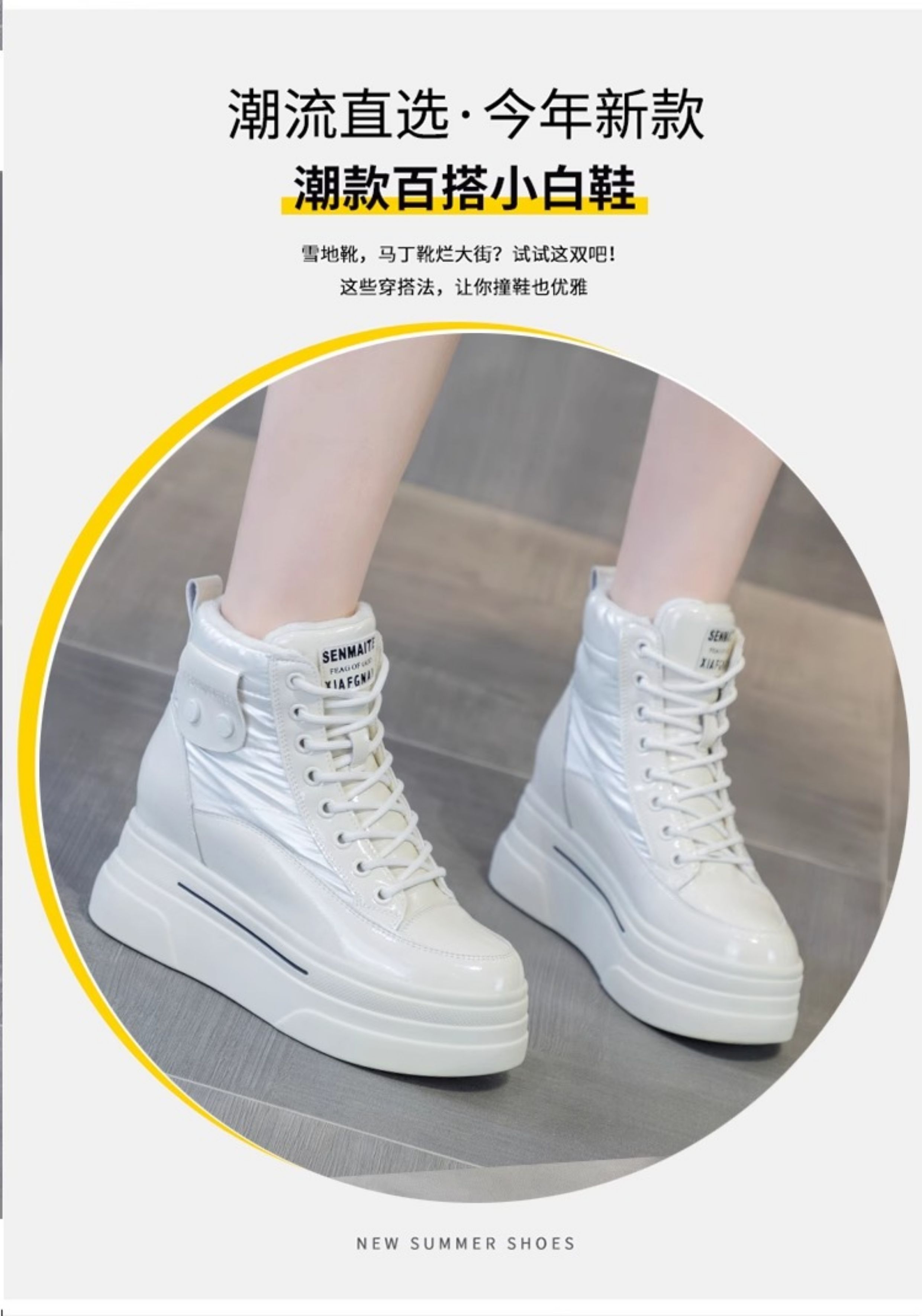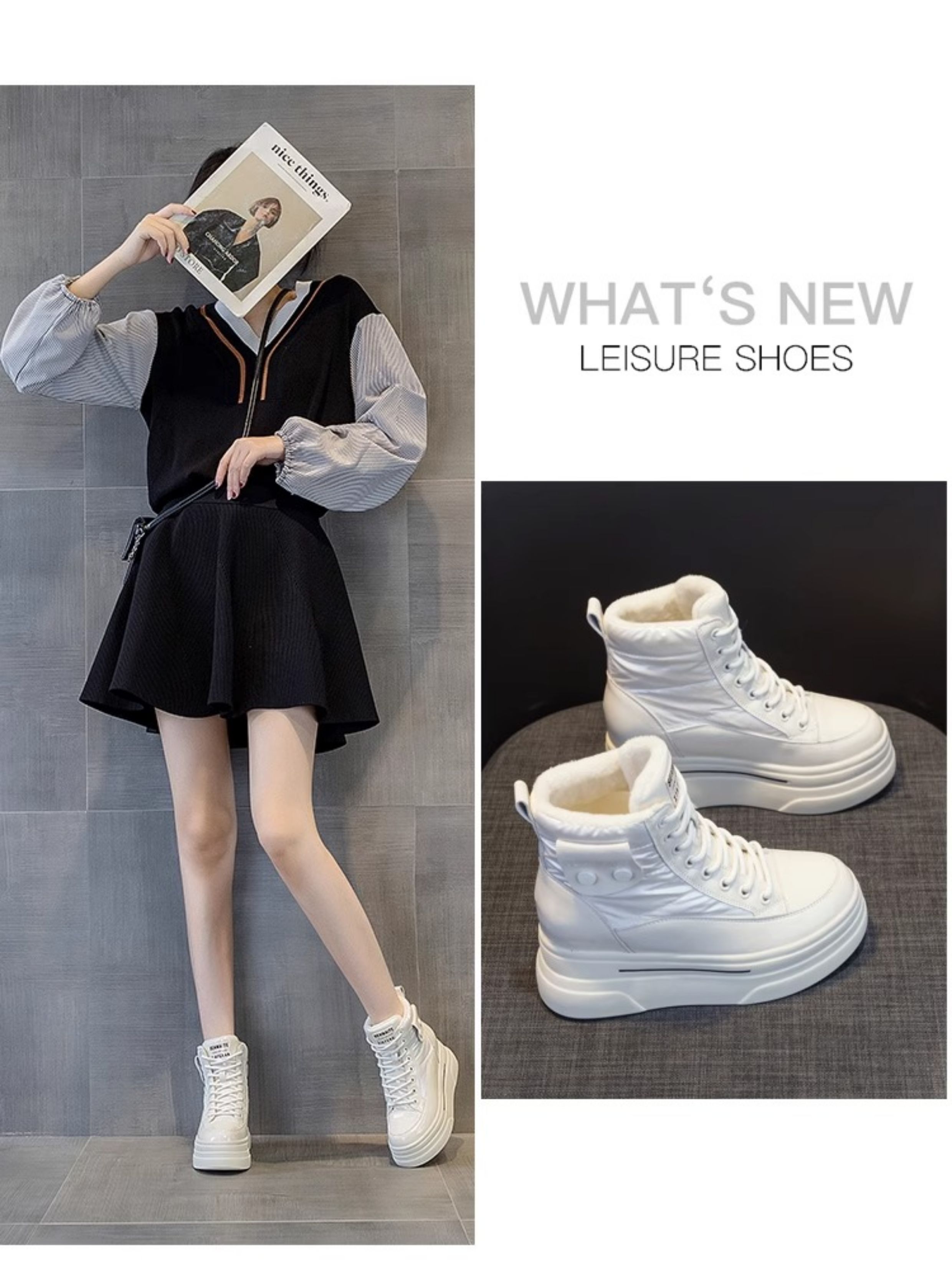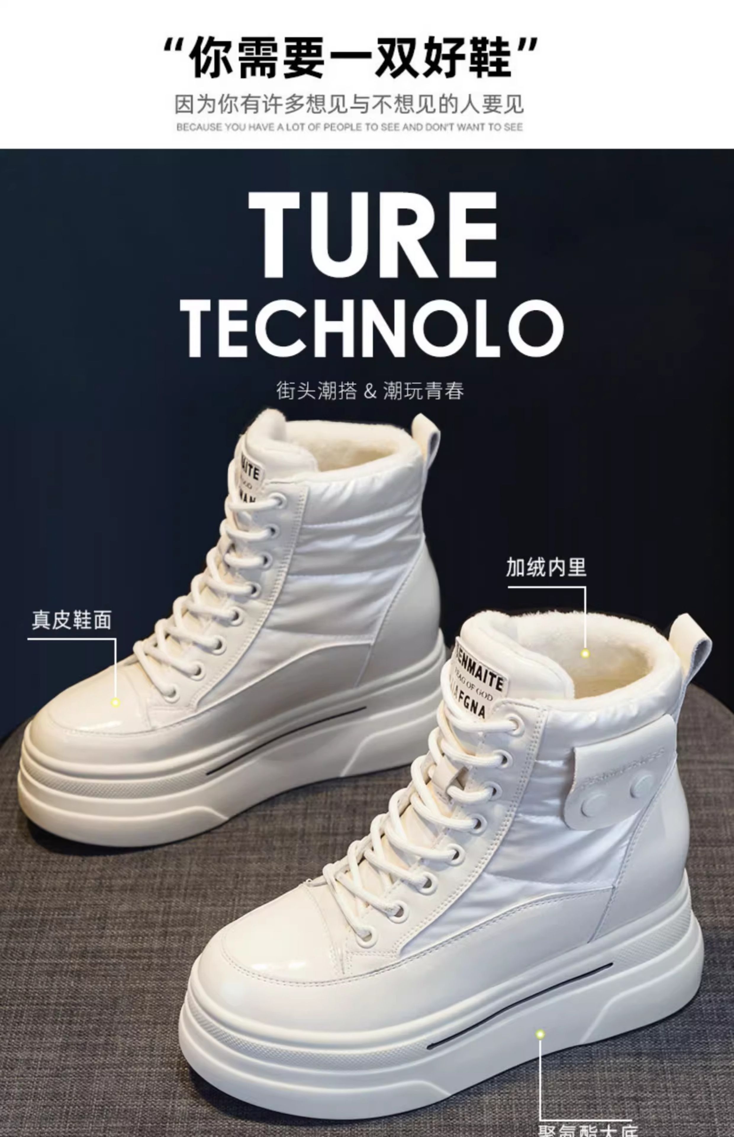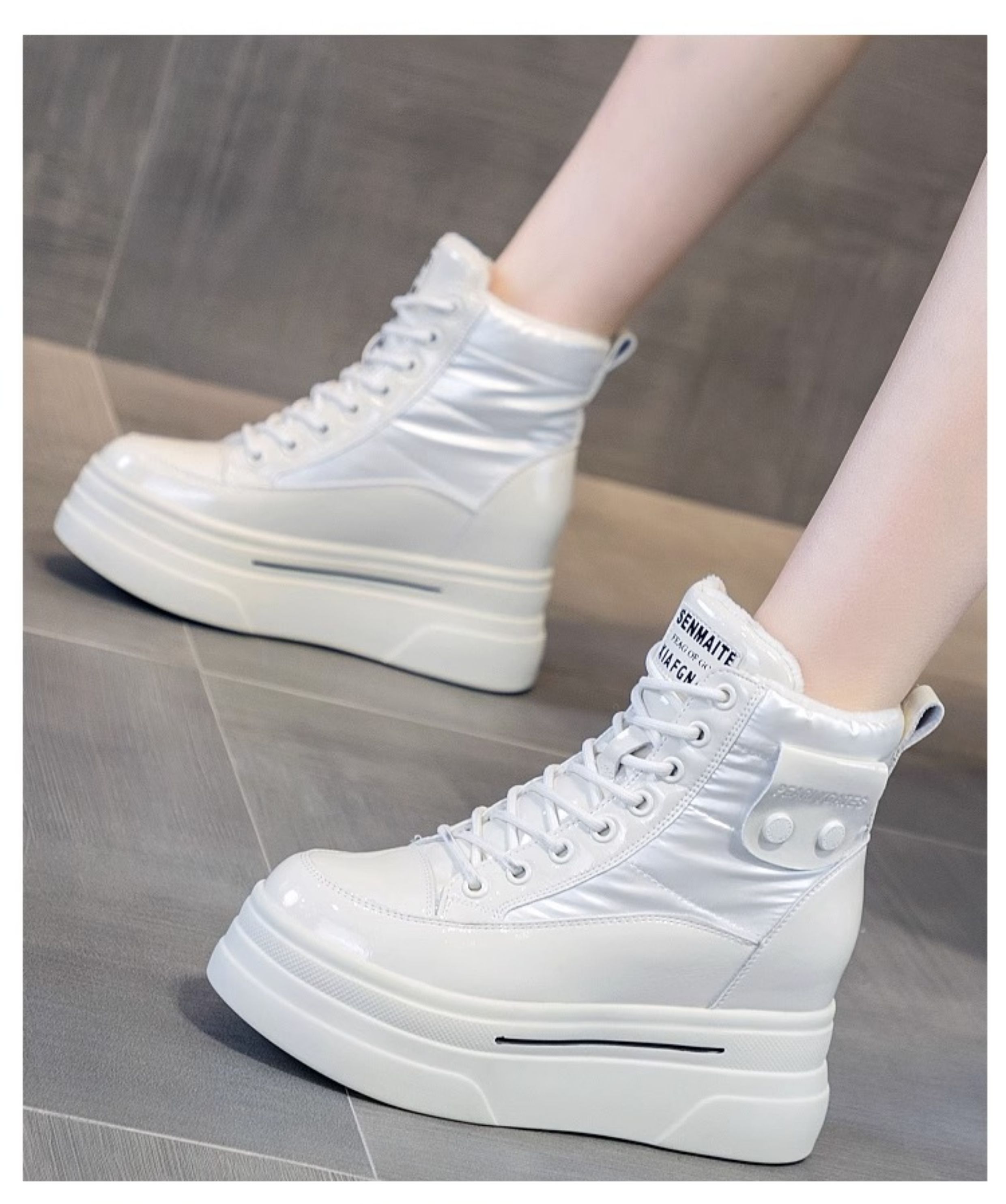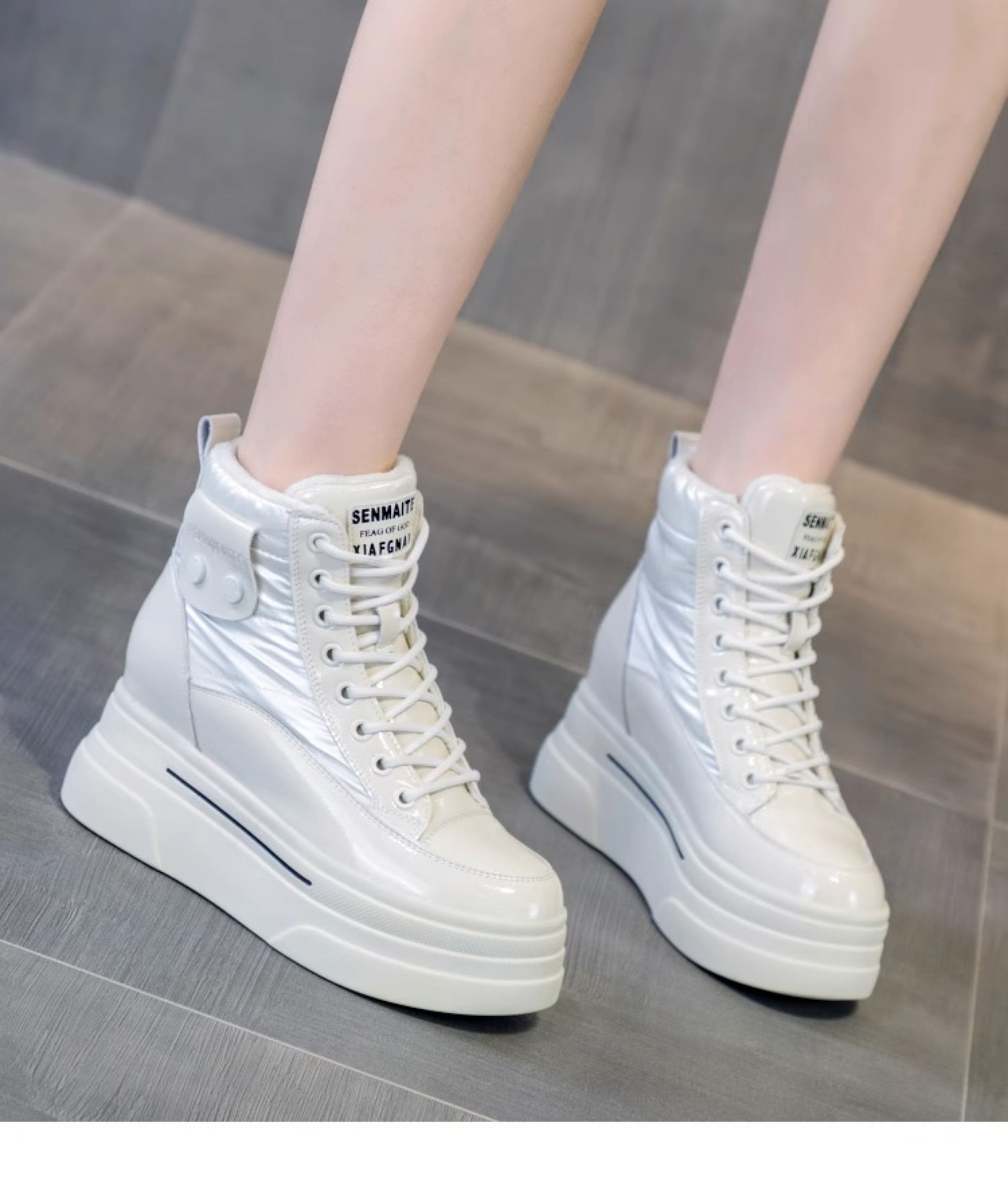 Hong Kong Fleece-Lined White Sneakers for Women with Hidden Height Increase, 2025 Autumn and Winter New Thick-Soled High-Top Cotton Shoes, Versatile Snow Boots