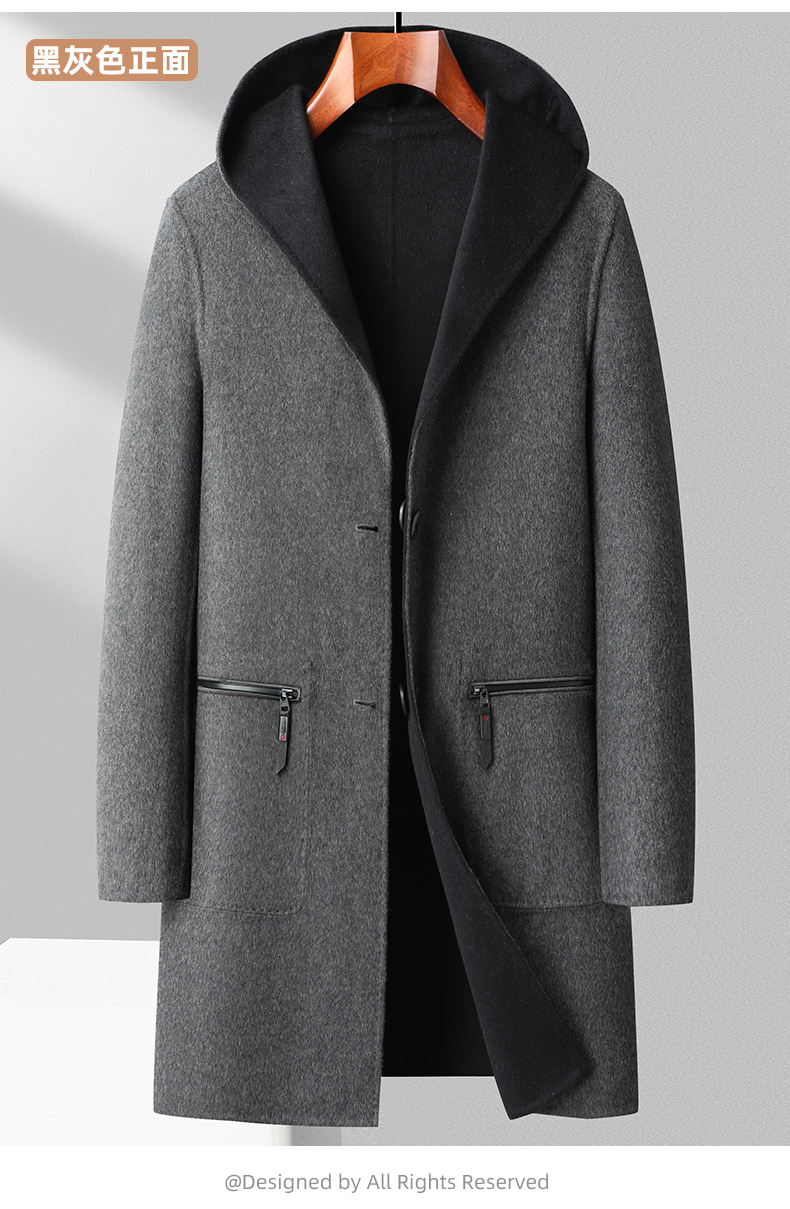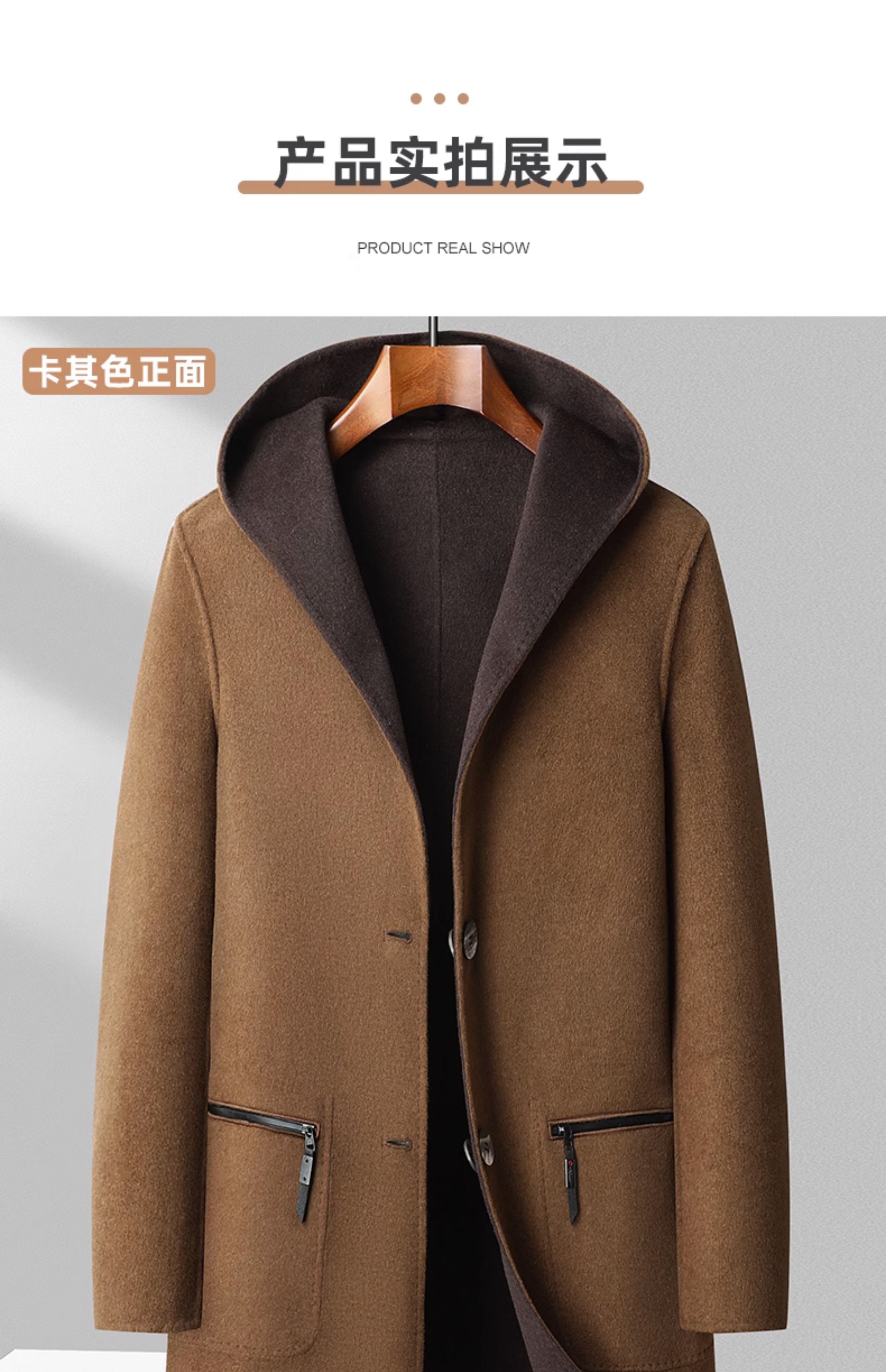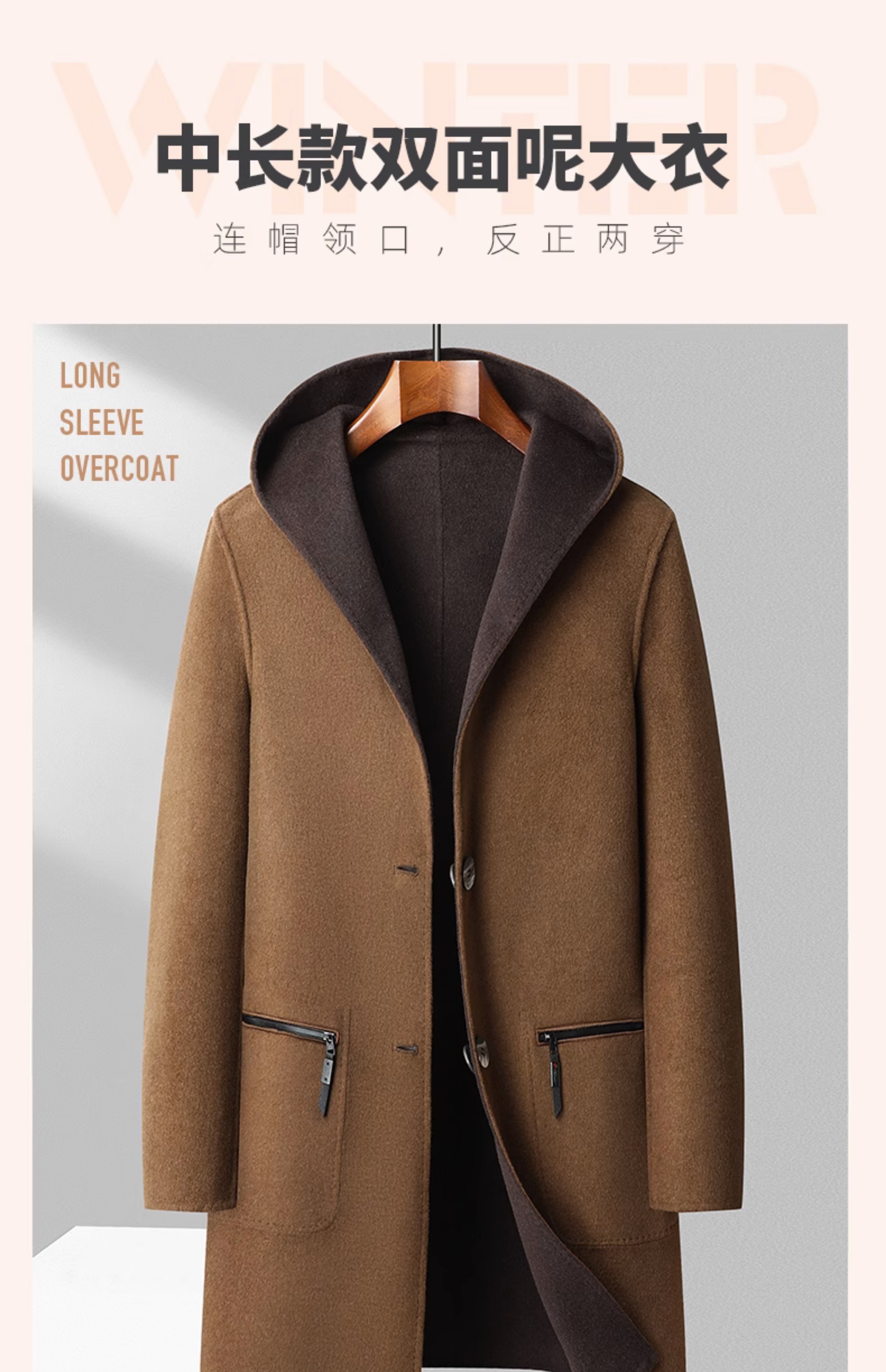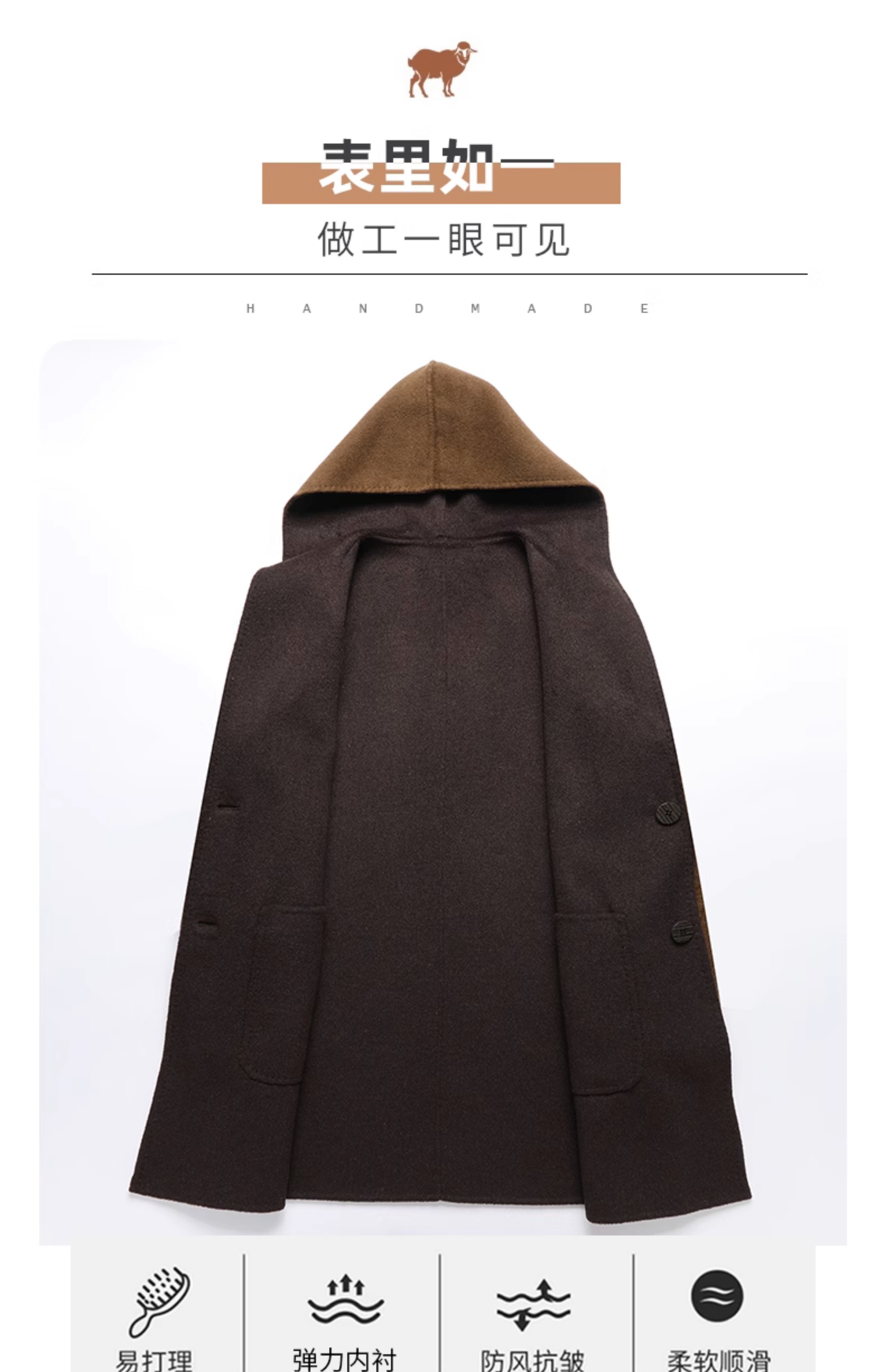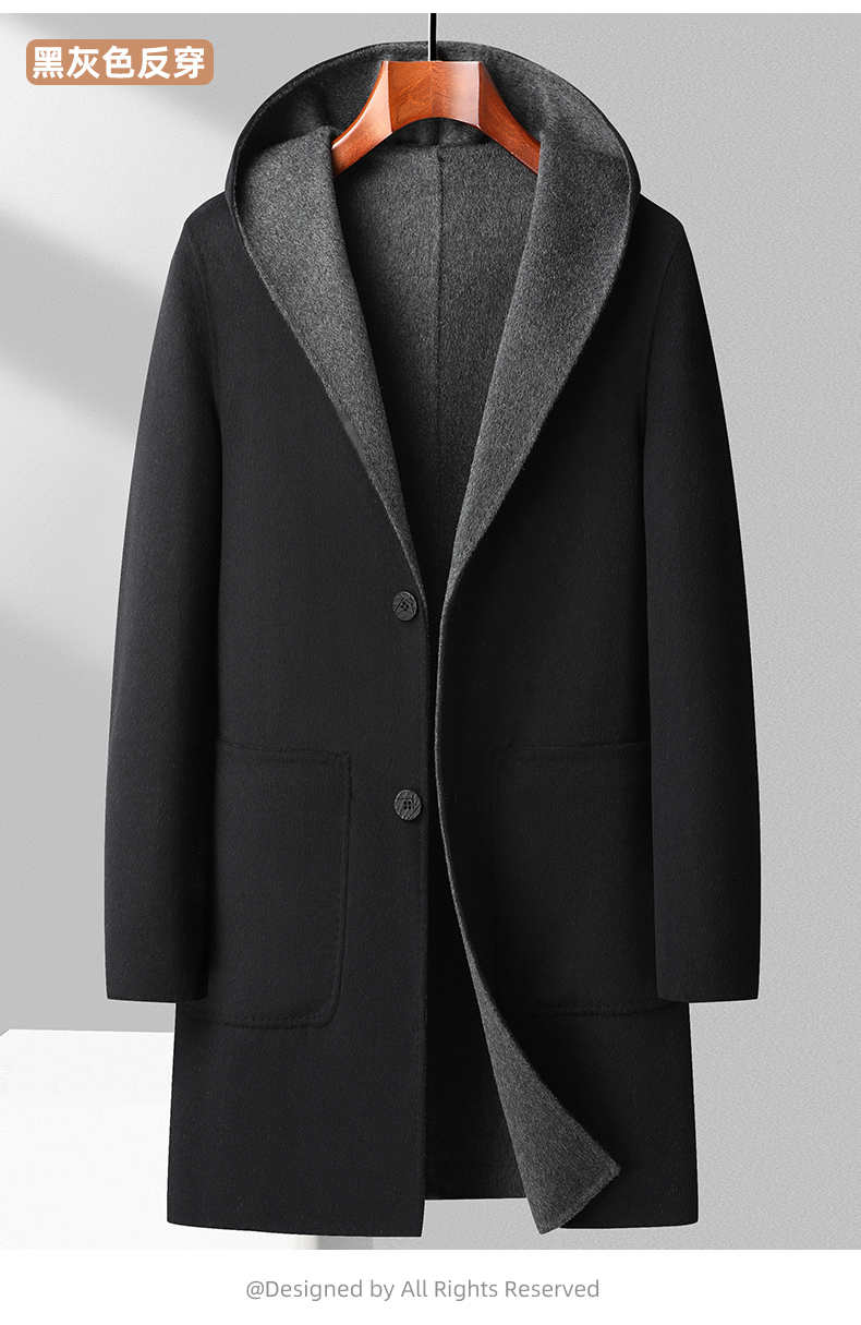 Romon Hooded Woolen Coat for Men, Autumn and Winter Double-Sided Wool Trench Coat, Mid-Length Woolen Casual Reversible Coat