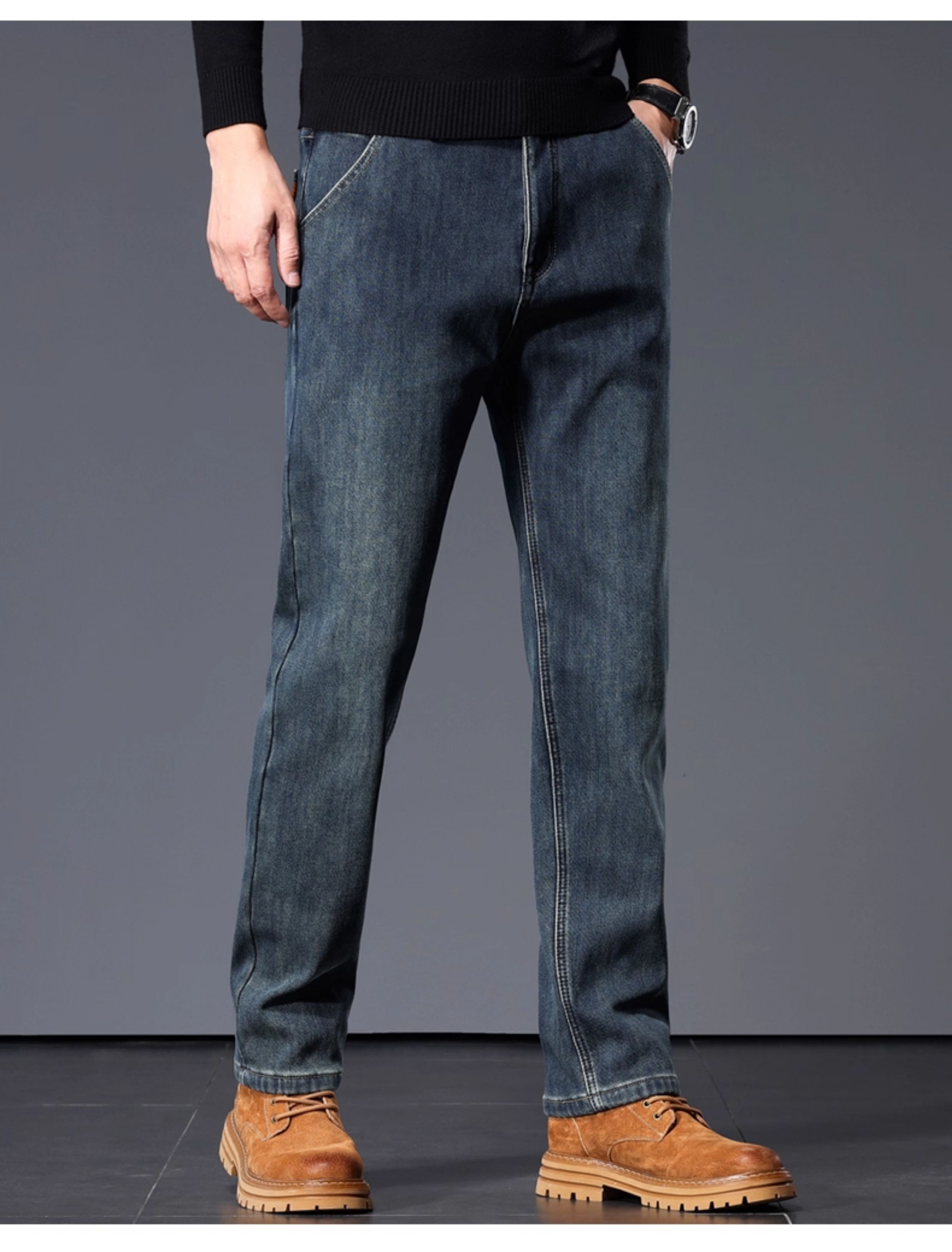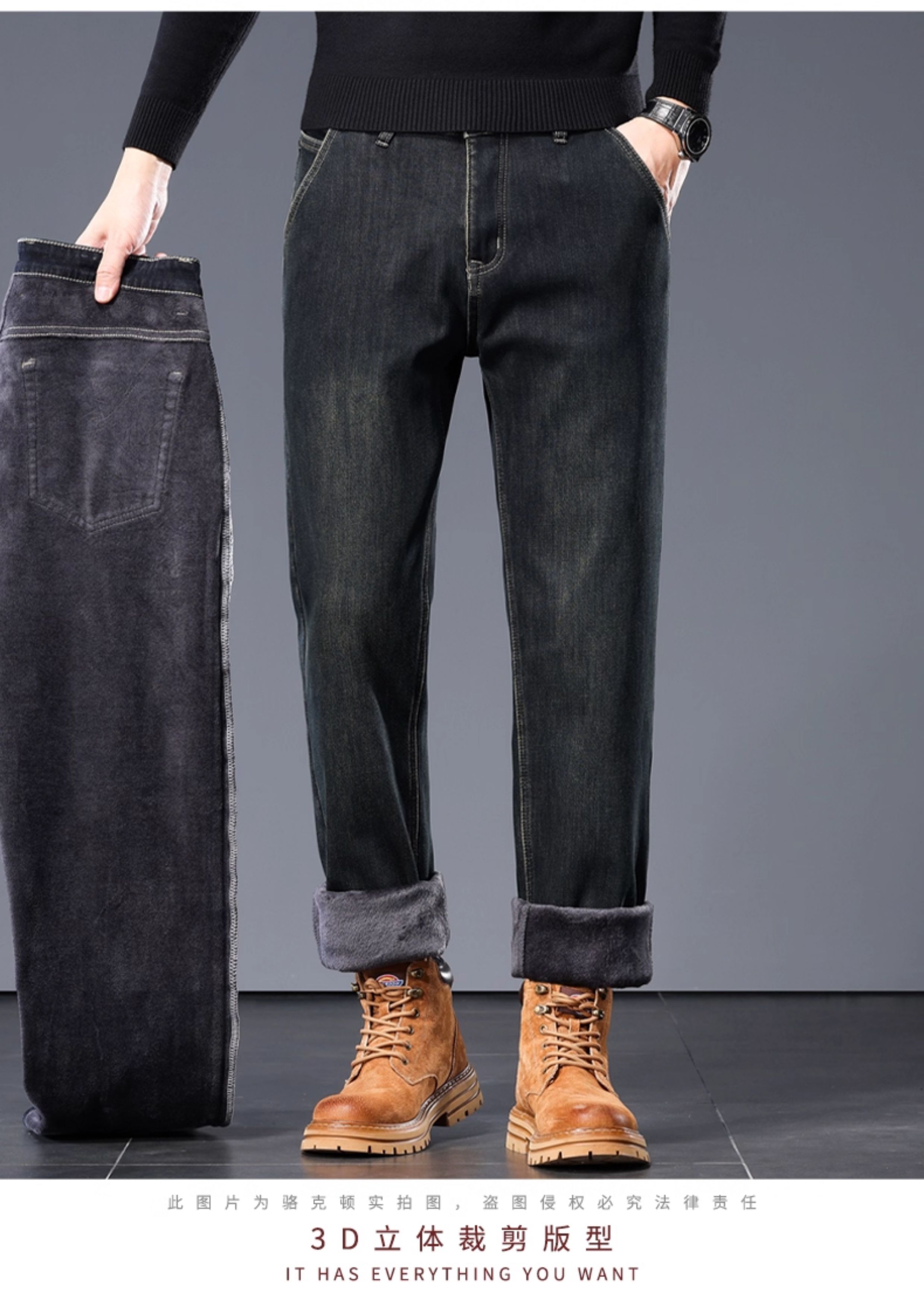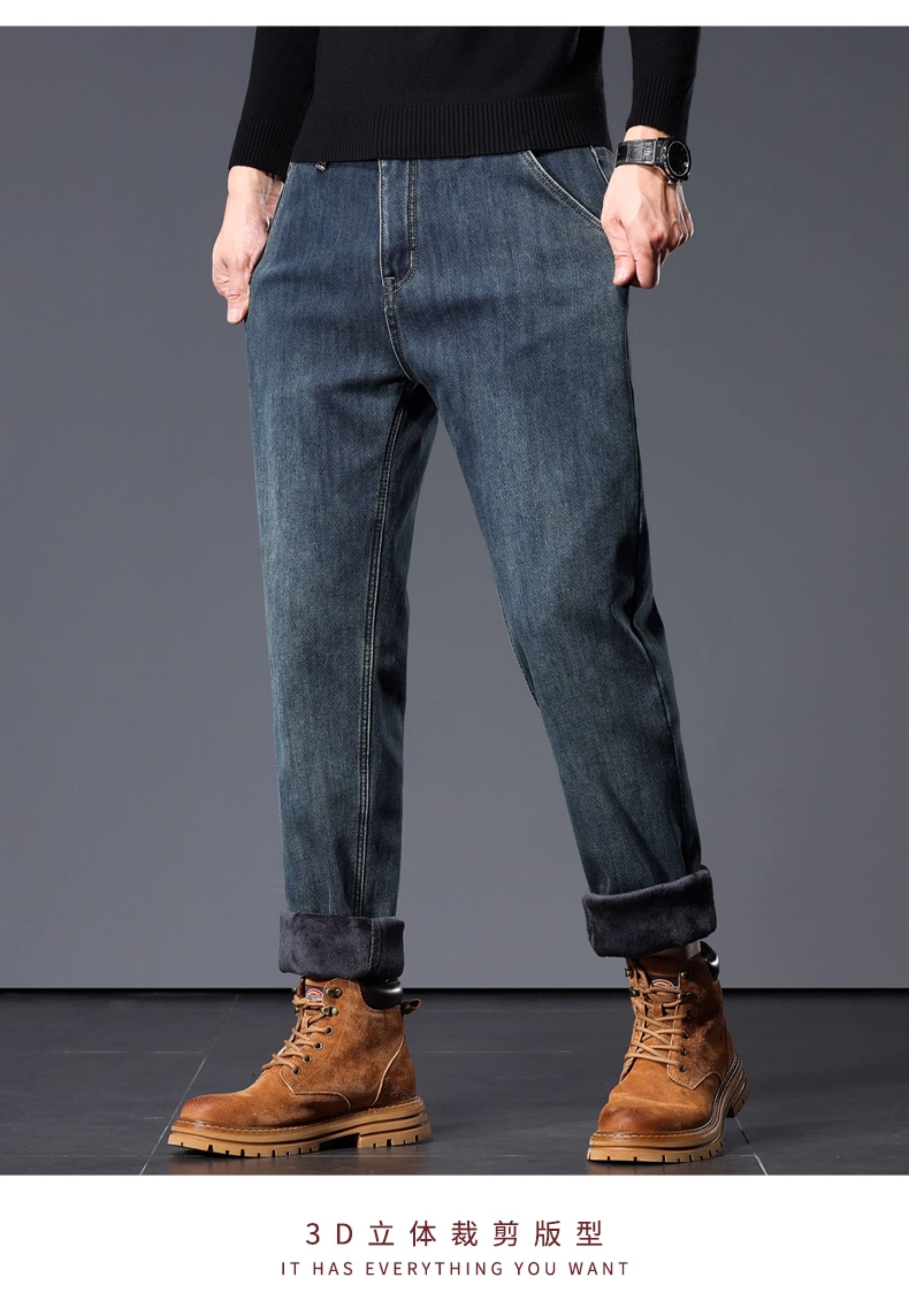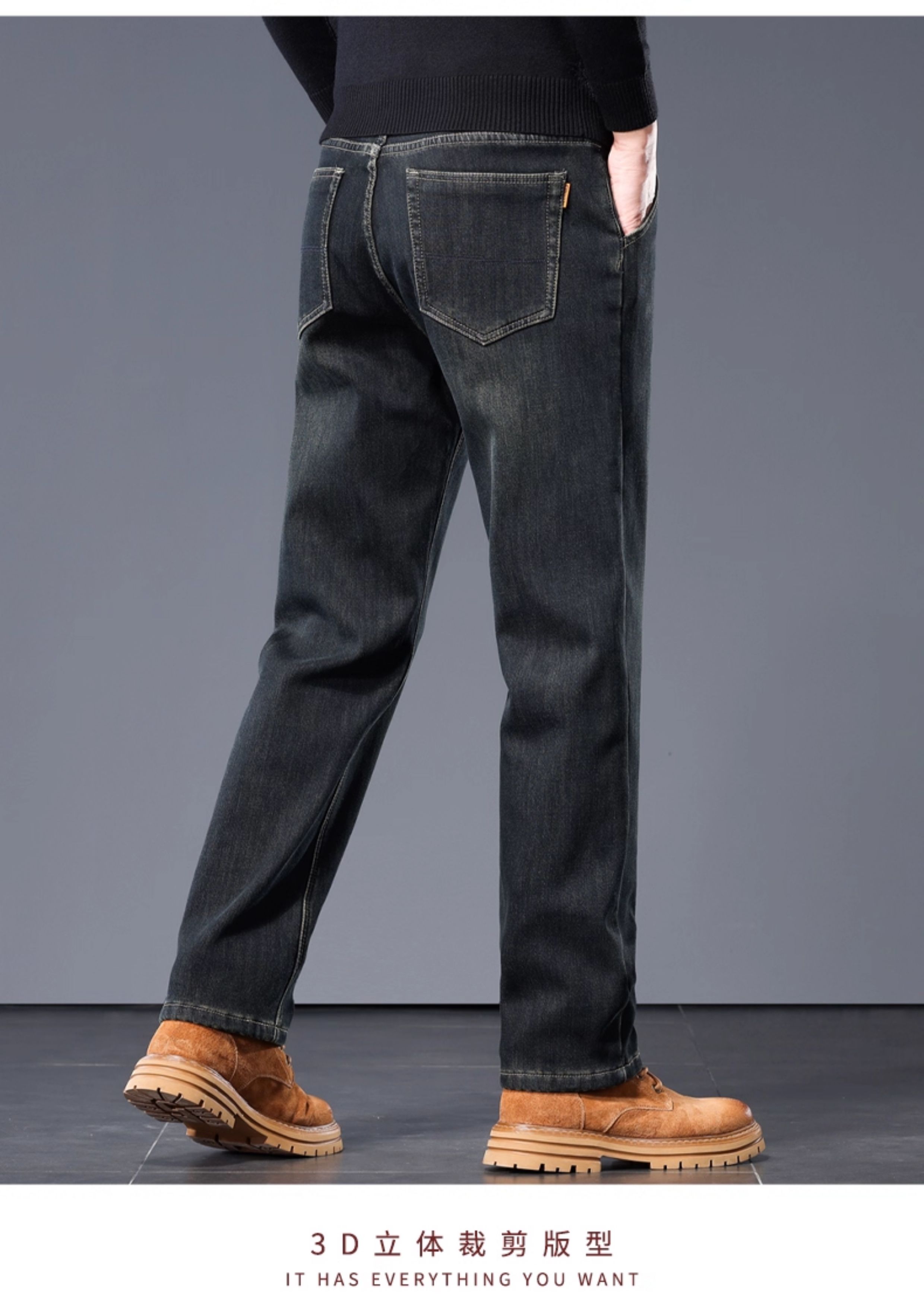 Winter Blue-Gray Fleece-Lined Thickened Jeans for Men, Loose Straight-Leg Trousers, Middle-Aged Autumn and Winter Style, Warm and Extra Thick Pants