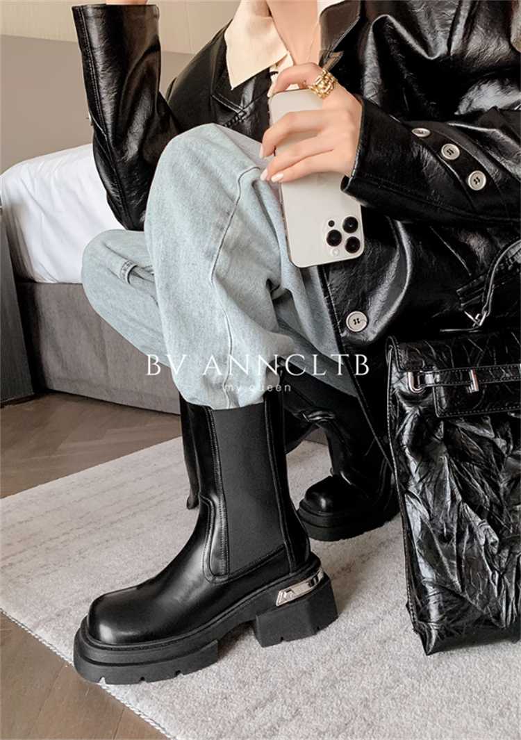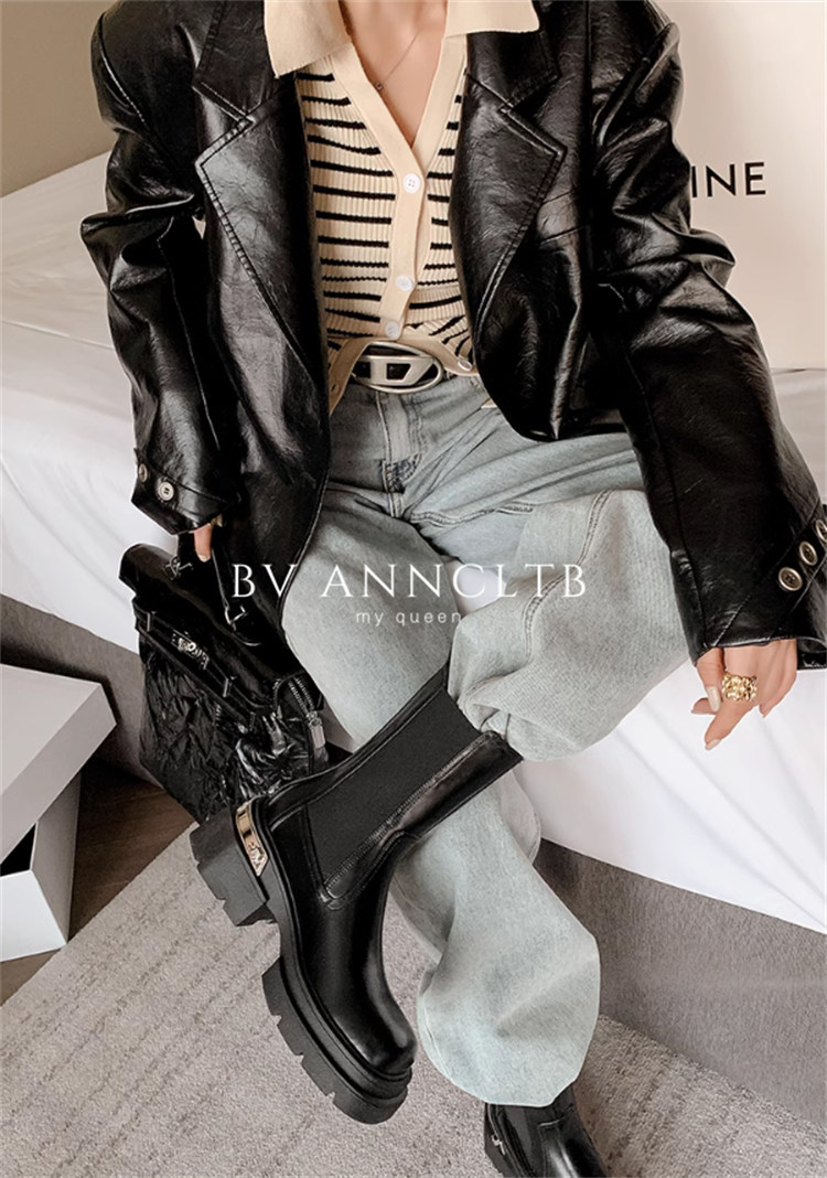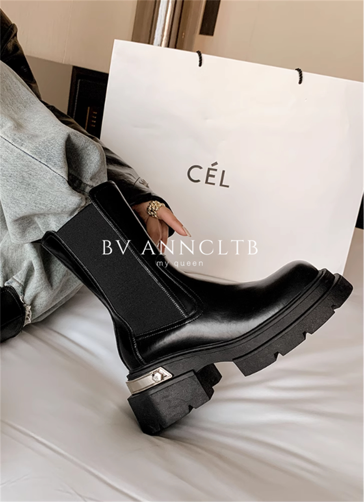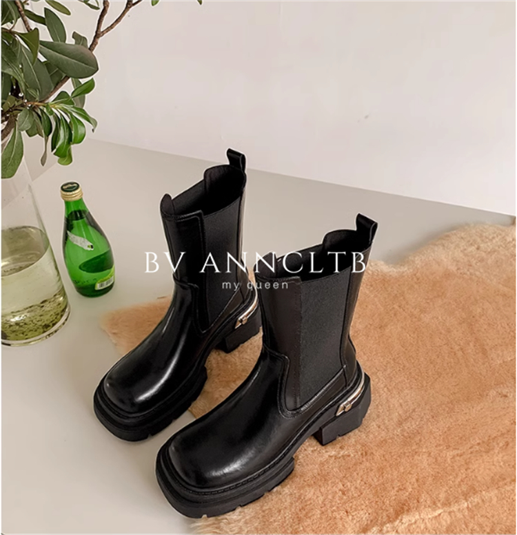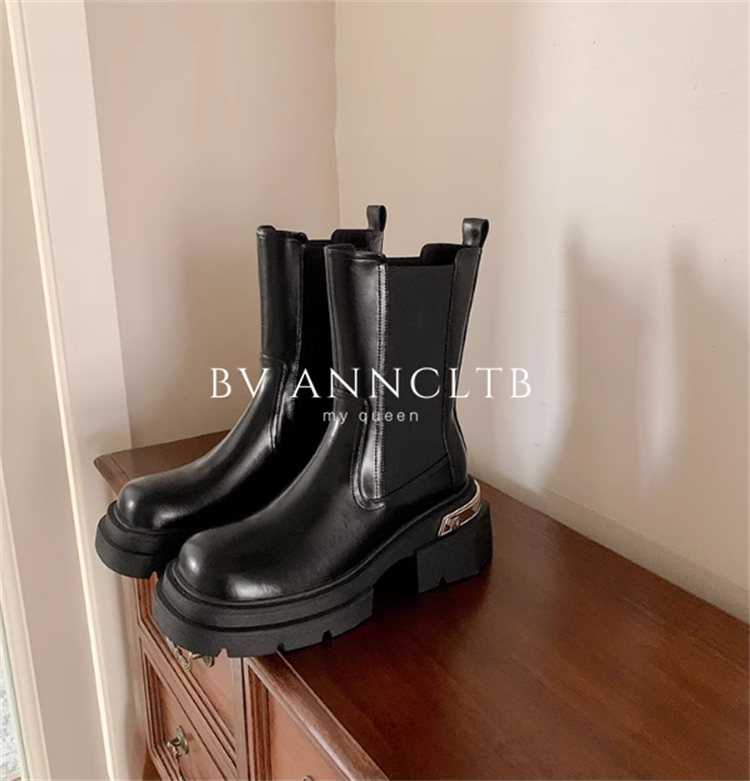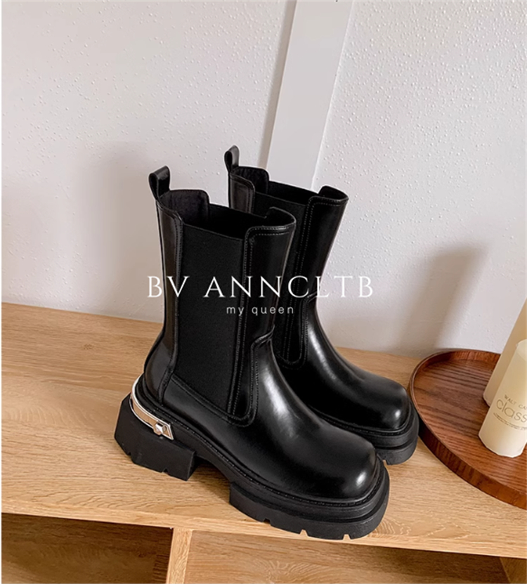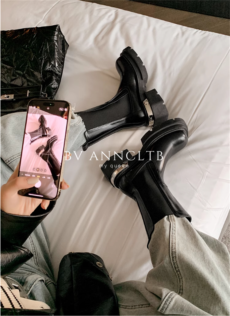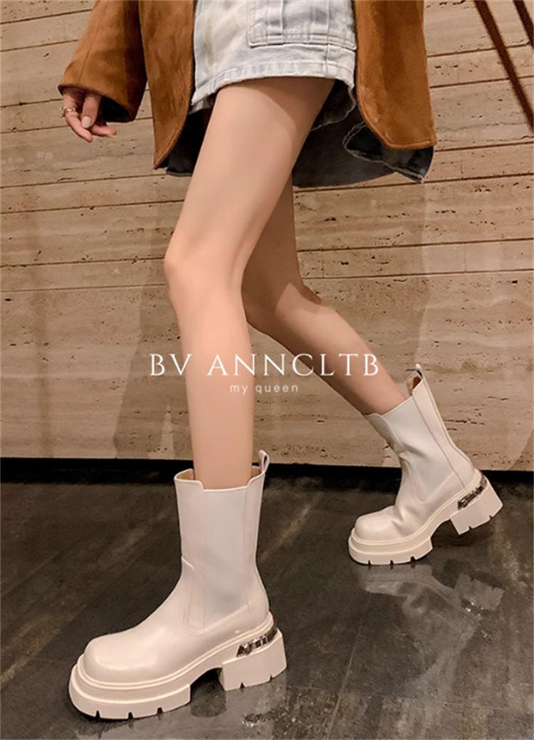 Bv Anncltb Genuine Leather Thick-Soled Martin Boots for Women, Height-Increasing Single Boots for Petite Figures, White Slim Chelsea Short Boots