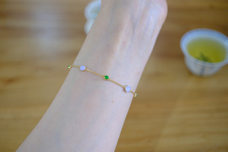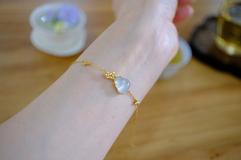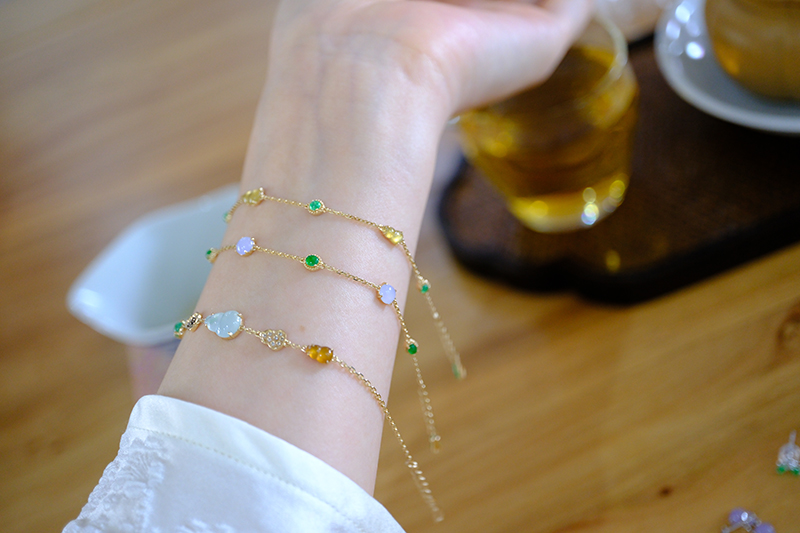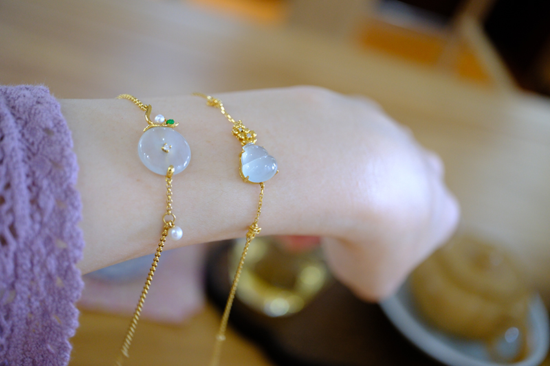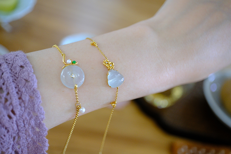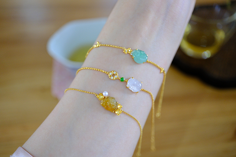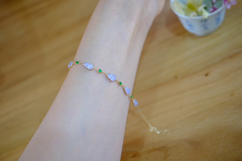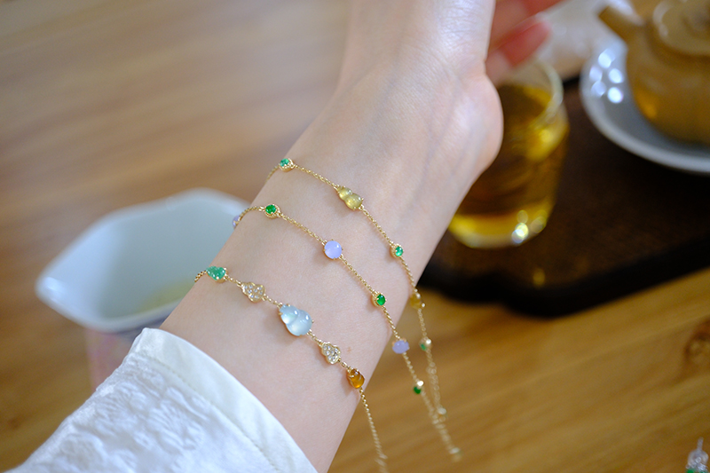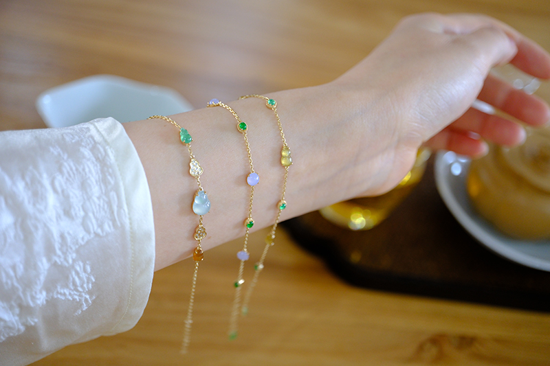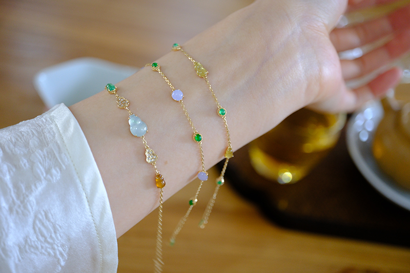 Fulu 18K Gold Inlaid with Burmese Jade Gourd, Ruyi, Ice White, Sun Green, Fairy Purple, Mountain House Bracelet