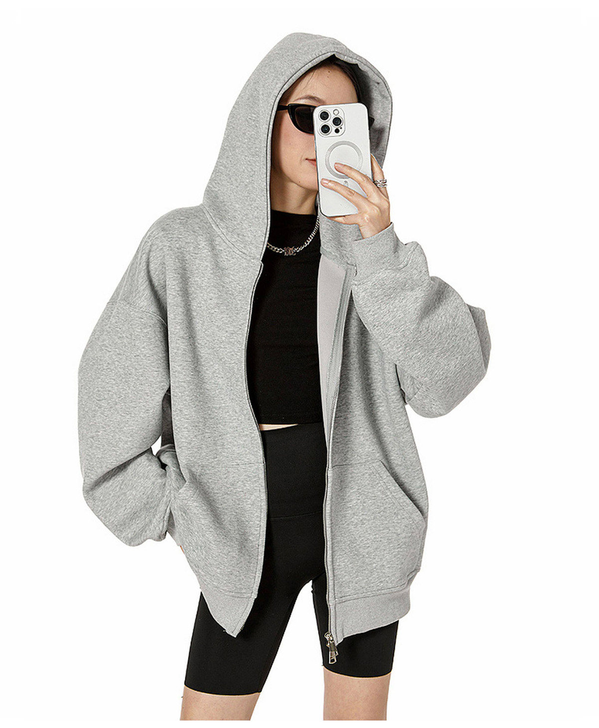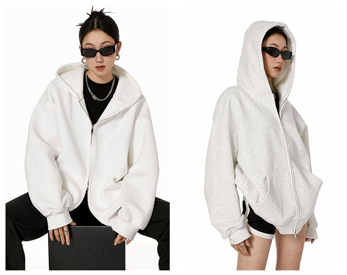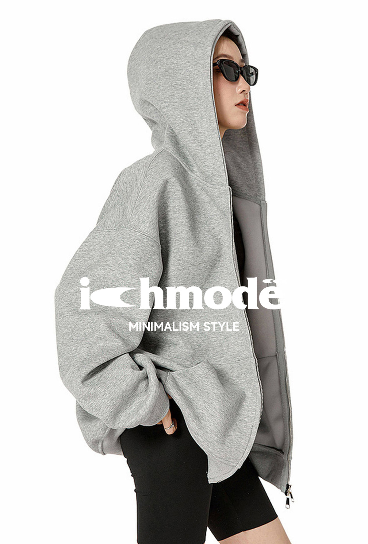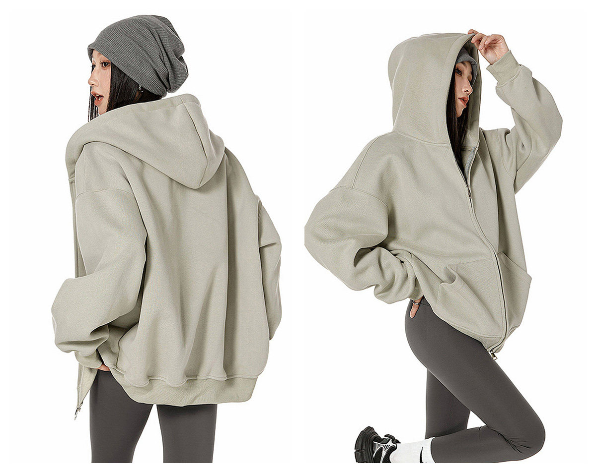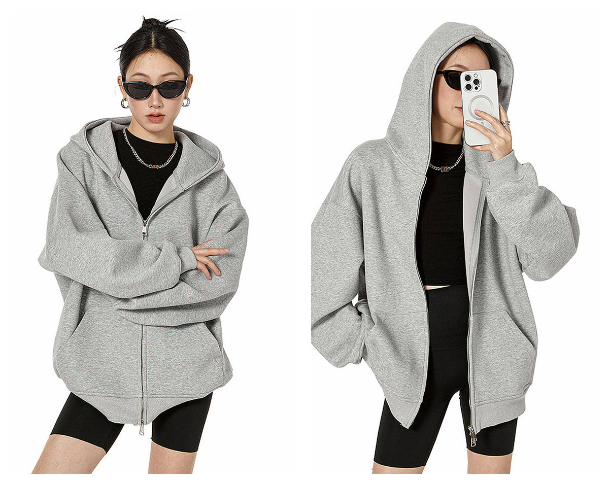 Ich Mode American-Style Heavyweight Gray Sweatshirt Jacket for Women, New Spring Loose-Fitting Hooded Zip-Up Cardigan Top