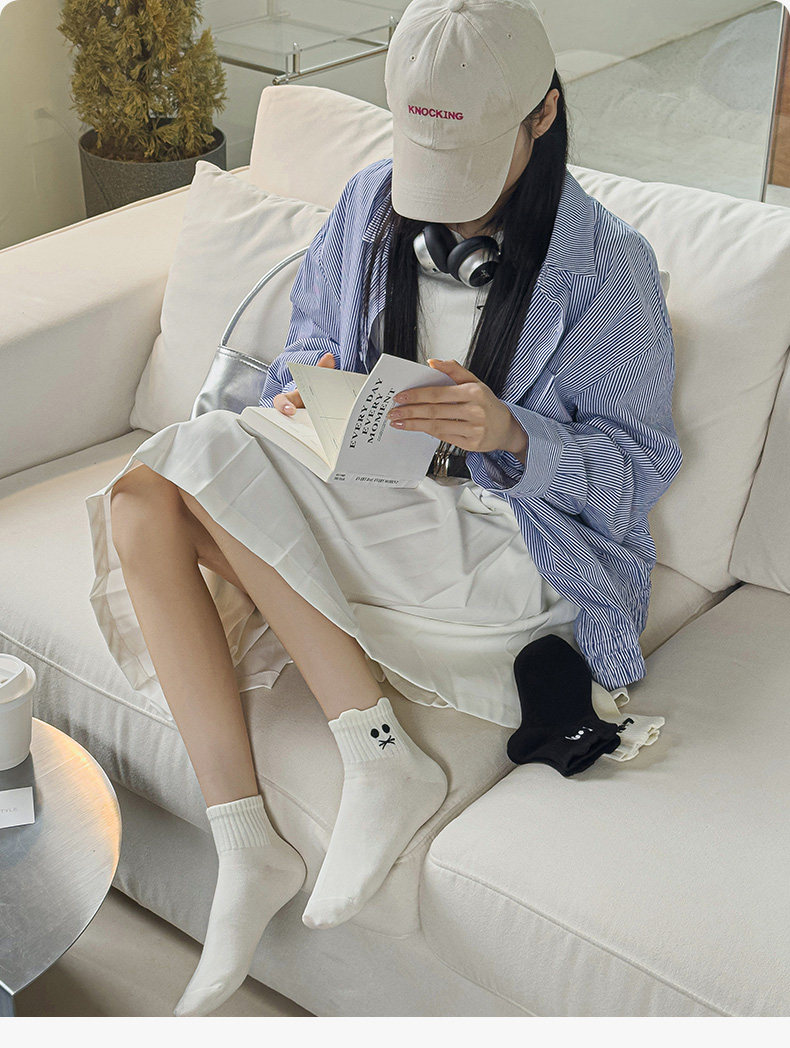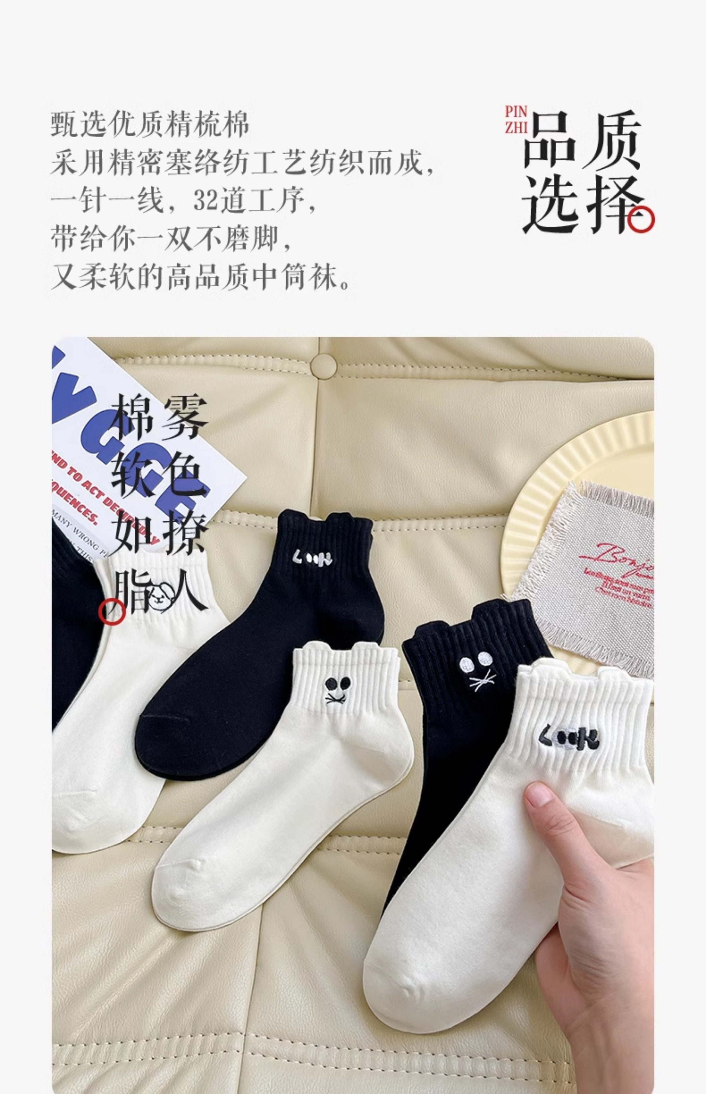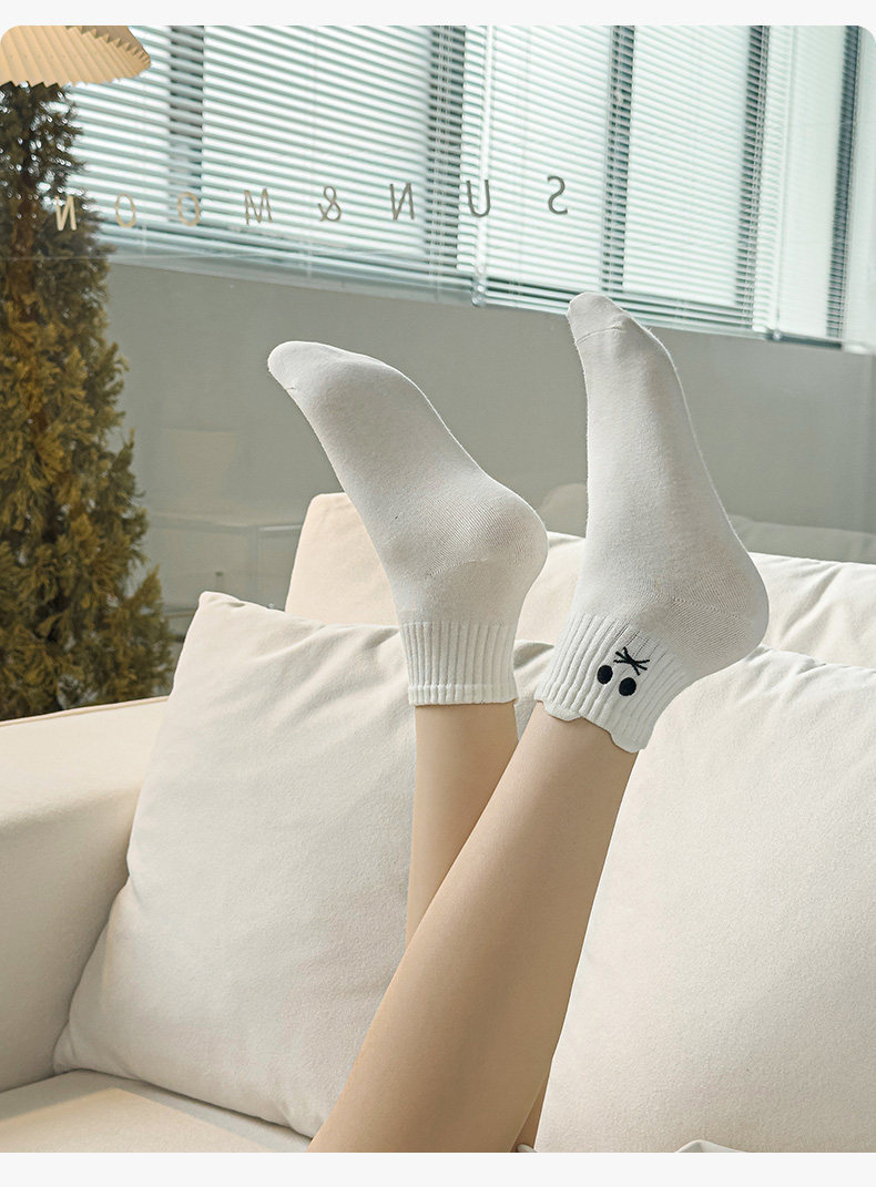 White Socks for Women, Pure Cotton Short Socks, Cute Embroidered Low-Cut Boat Socks, Black Japanese-Style Solid Color Cotton Socks, Versatile Women's Socks