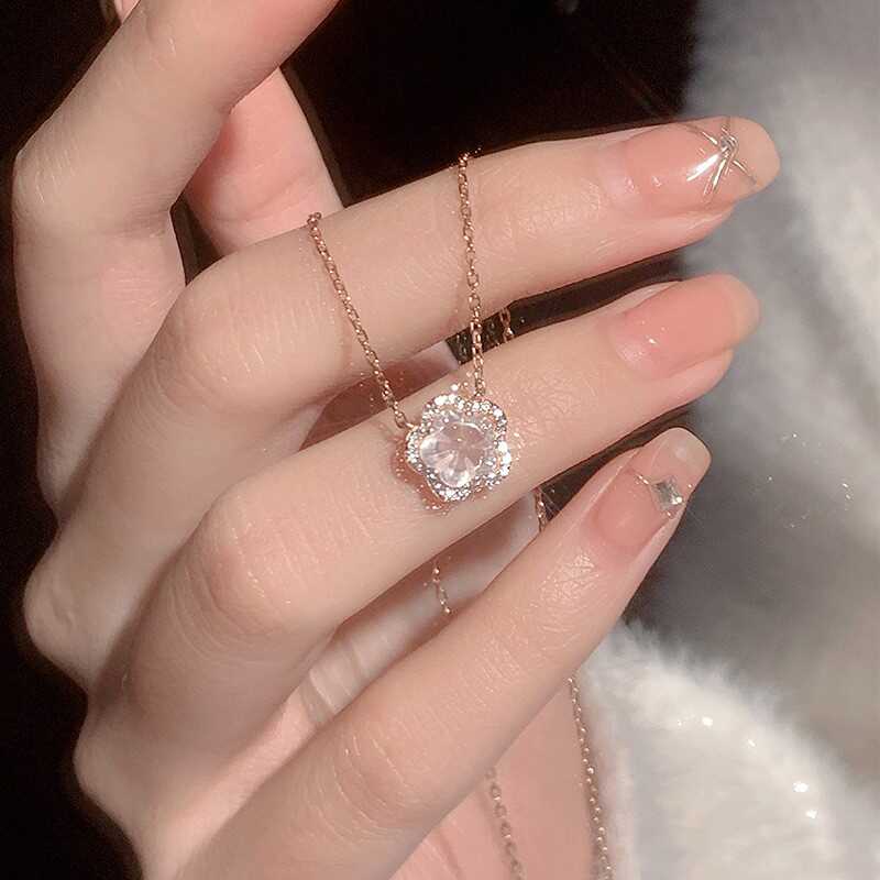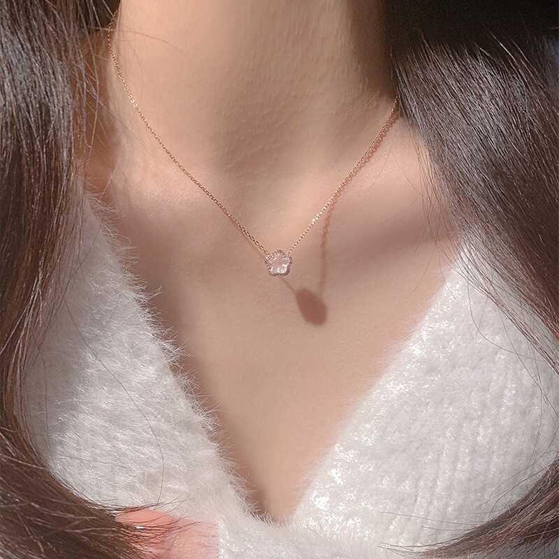 French Guir Oe'Peach Blossom Luck' Sterling Silver Necklace for Women, Niche Pink Crystal Collarbone Chain, Gift for Best Friend