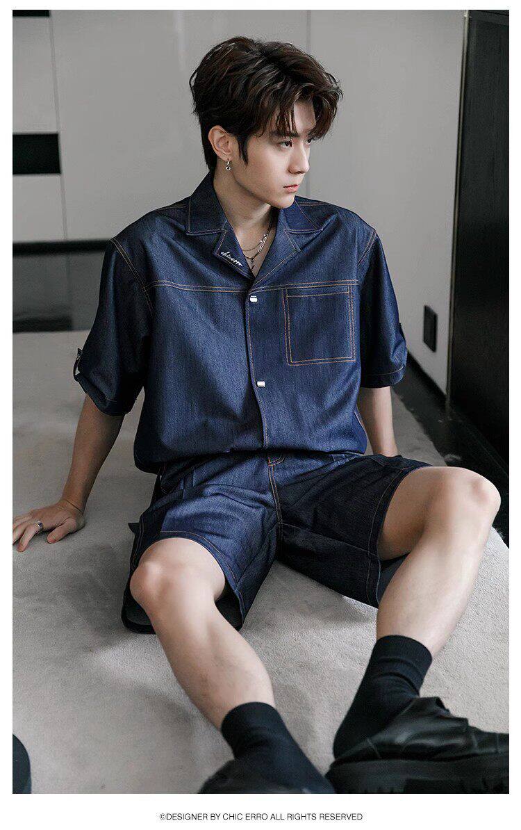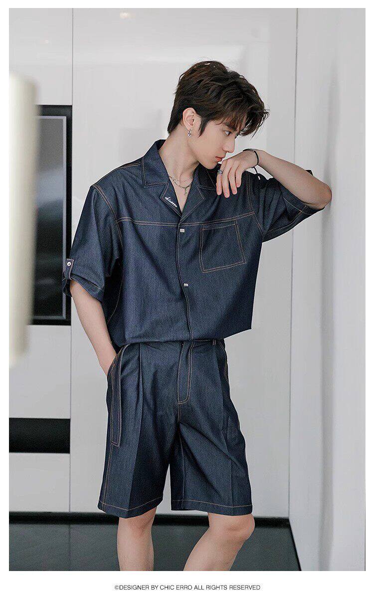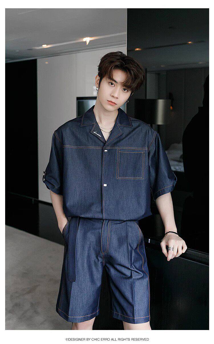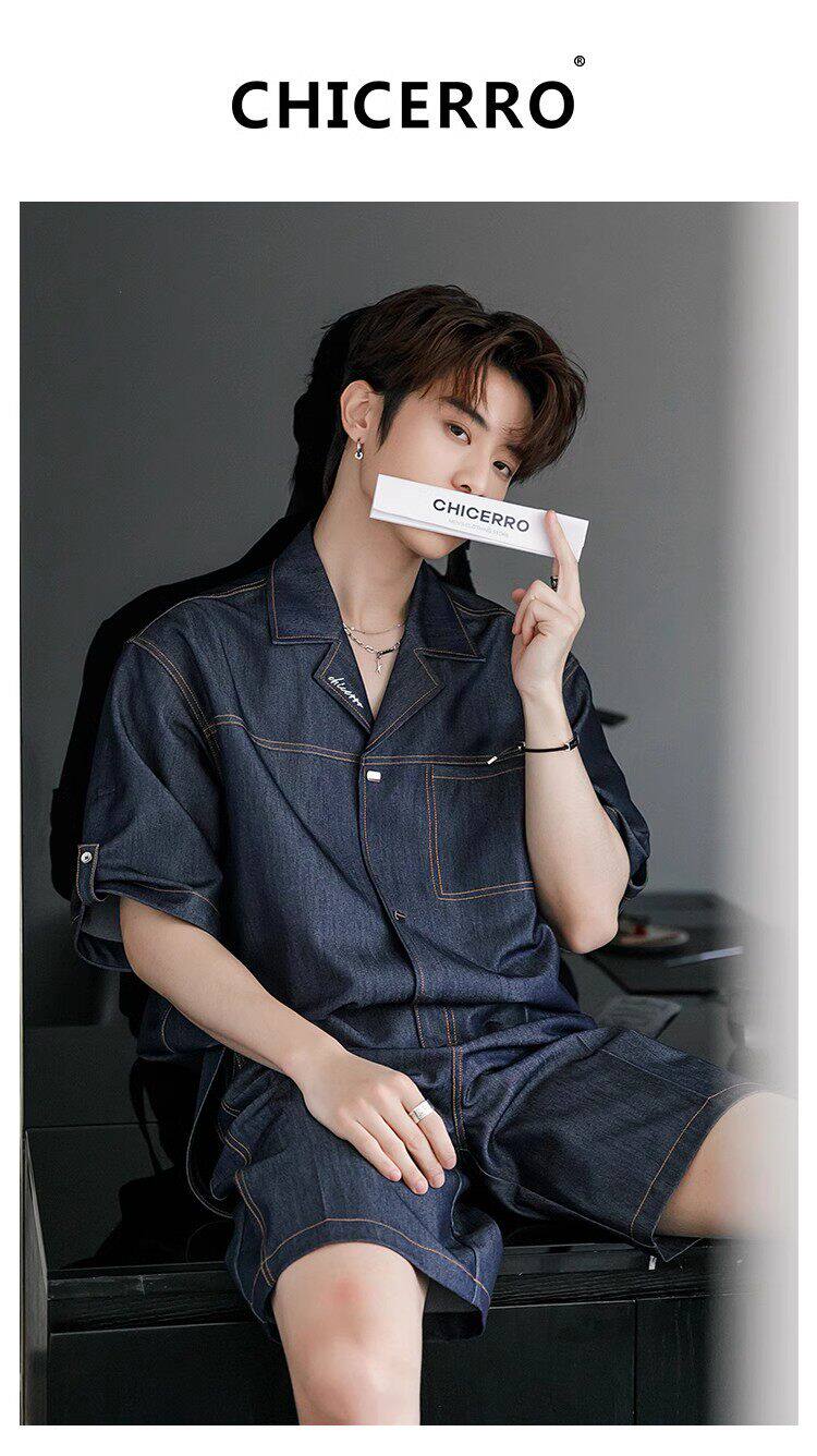 Chicerro Sicilian Men's Summer High-End Ice Silk Denim Cuban Collar Men's Casual Cool Suit Trendy