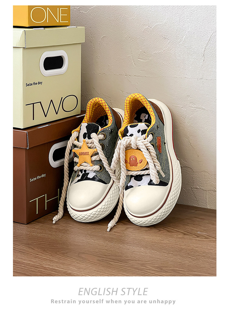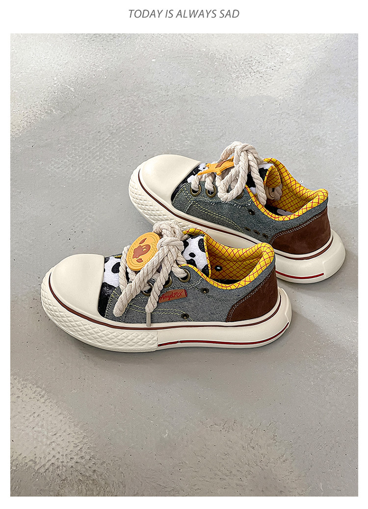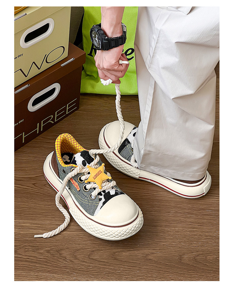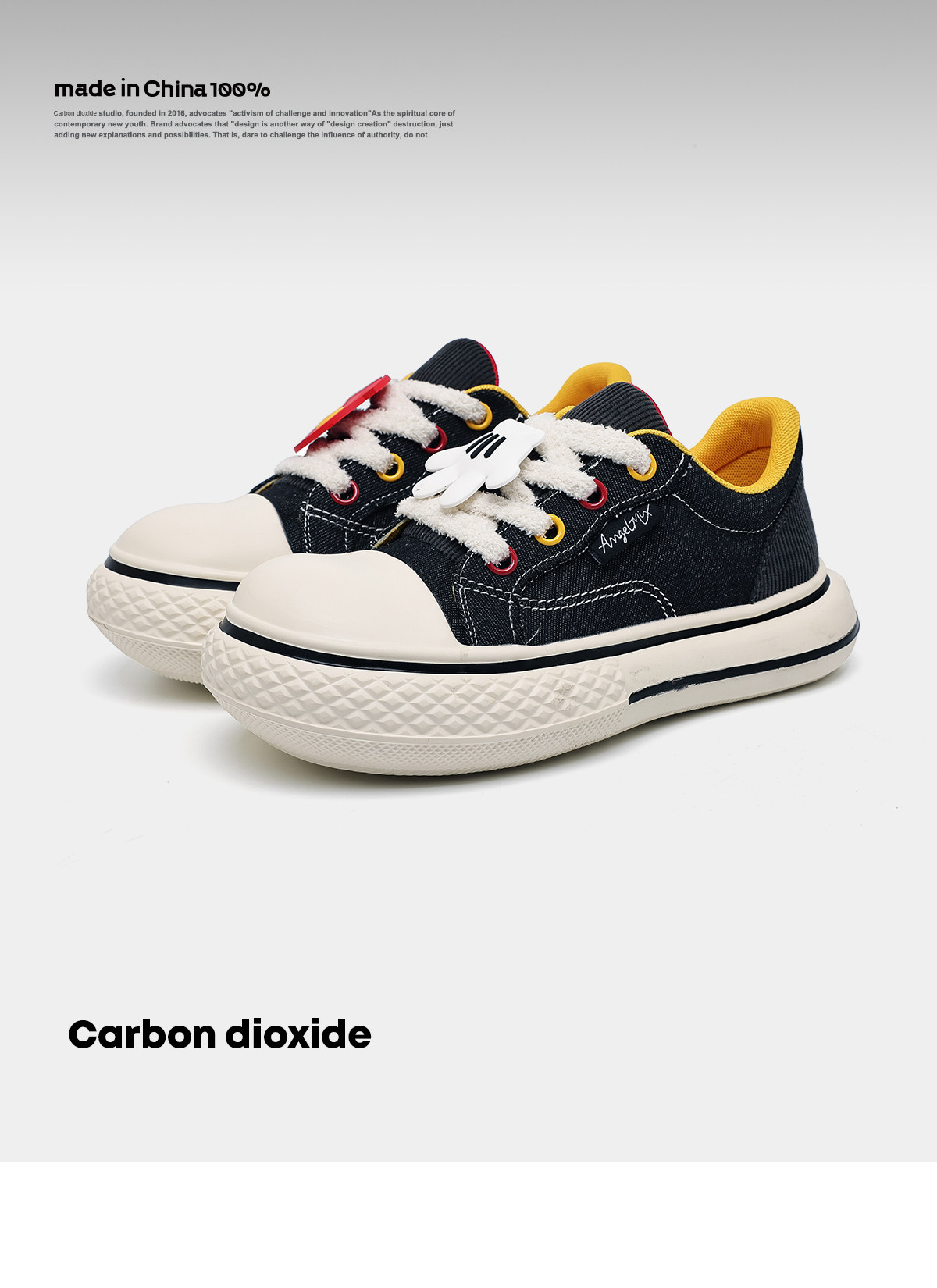 Chinese-Style Mickey Collaboration Ugly-Cute Big-Head Black Canvas Shoes for Men and Women, Summer Thick-Soled Height-Increasing Couple Casual Sneakers