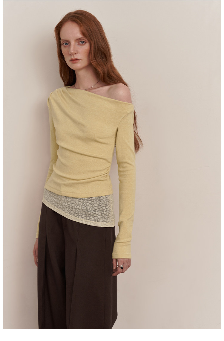 Someone Sometimes Original Lace Splicing Asymmetrical Waist-Cinching Faux Cashmere Feel Swing Collar Knit T-Shirt