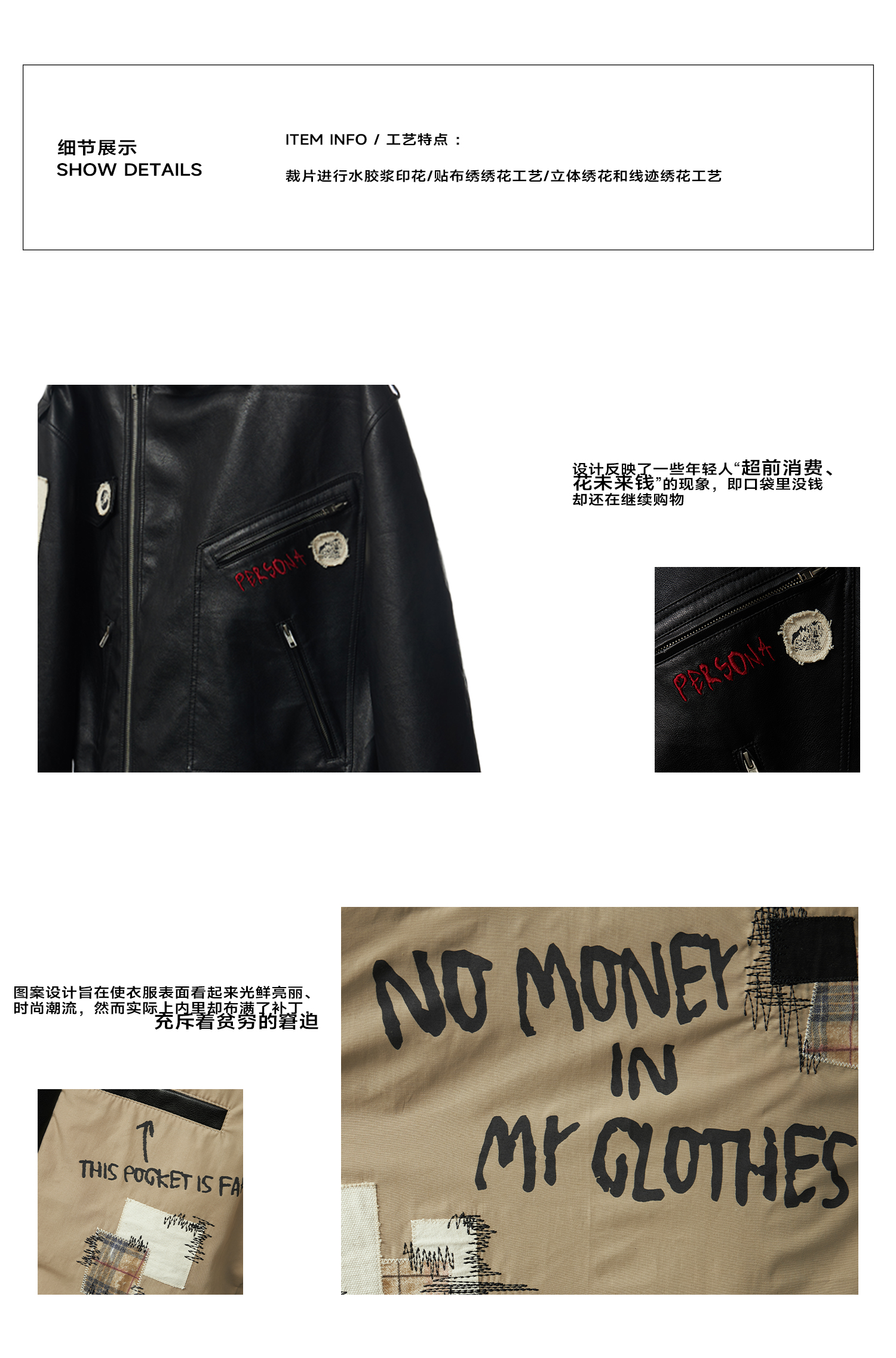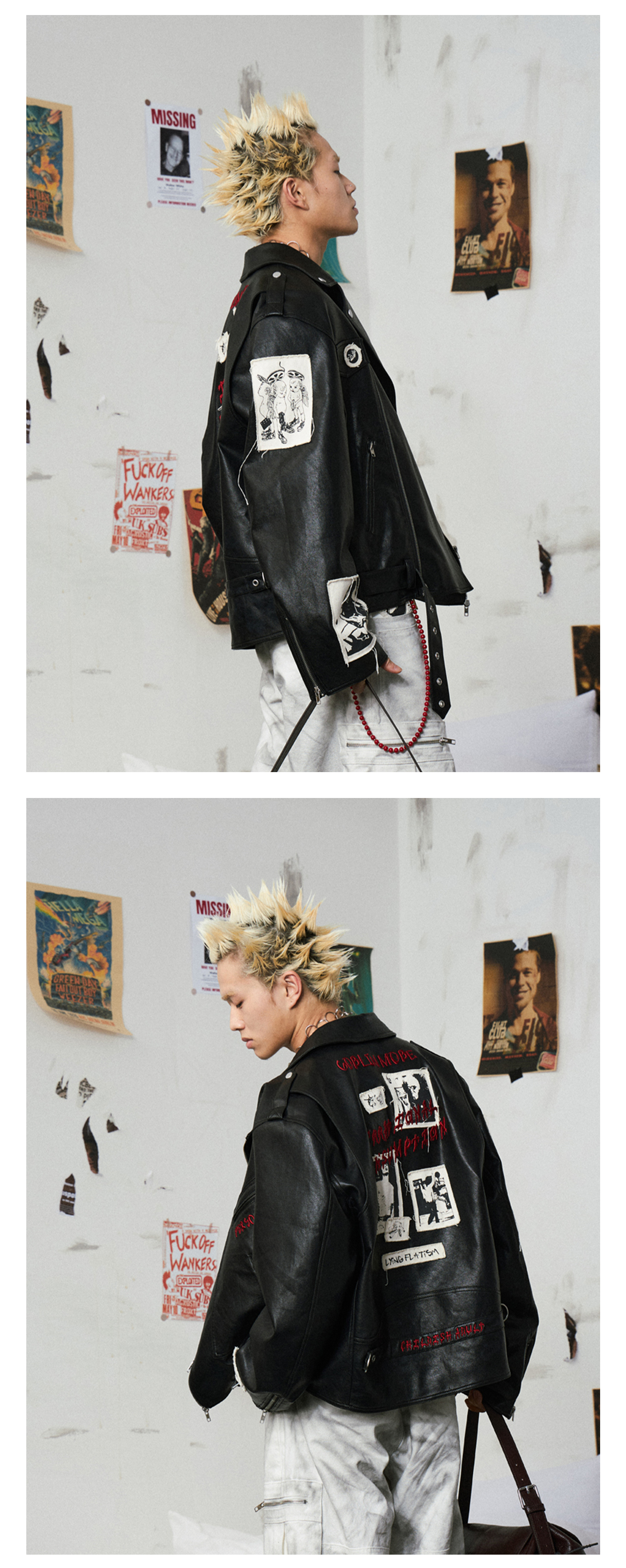 Emo Brother* “Overconsumption” Patchwork Embroidered Leather Jacket with Damaged Interior and Patched Exterior