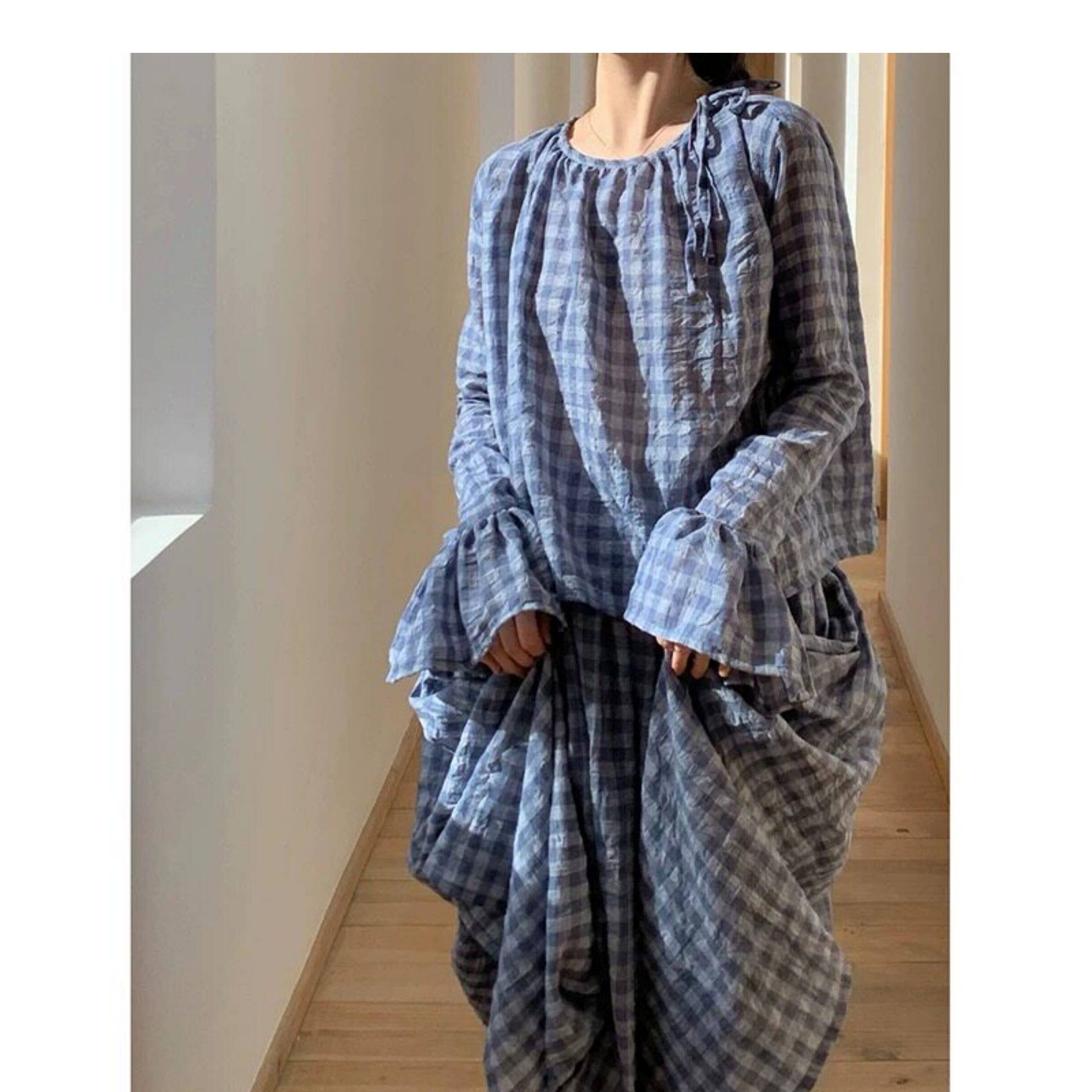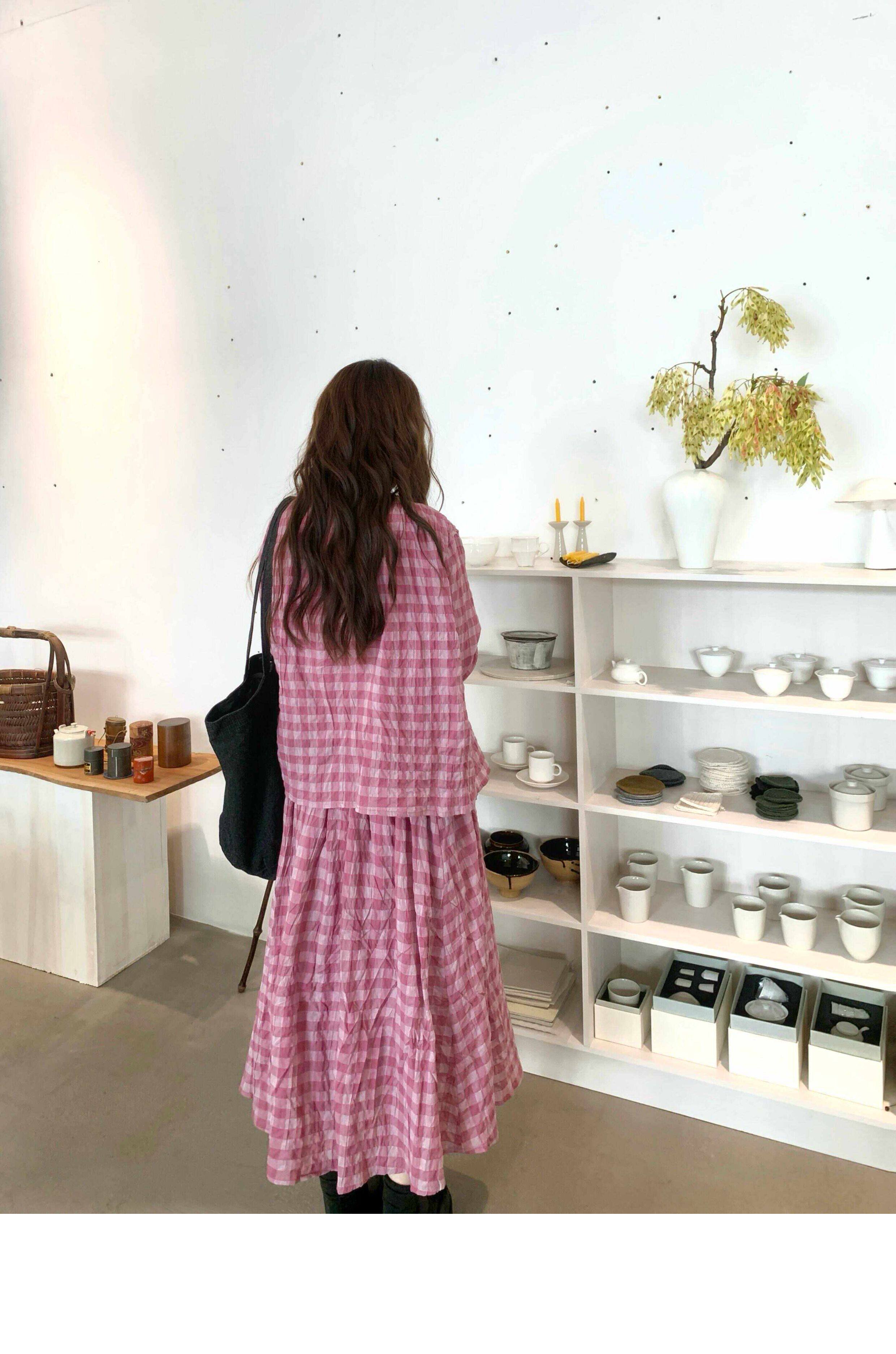 Raspberry Pink Age-Reducing Plaid Round Neck Trumpet Sleeve Loose Design Shirt Lazy Style High Waist Skirt Suit for Women Autumn