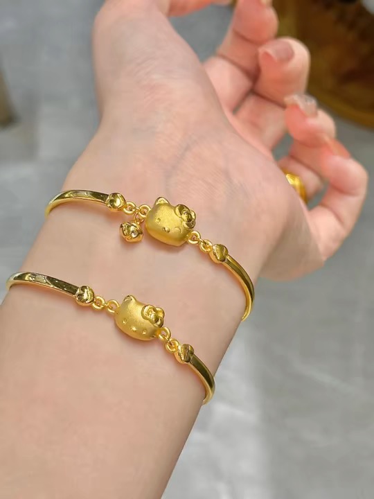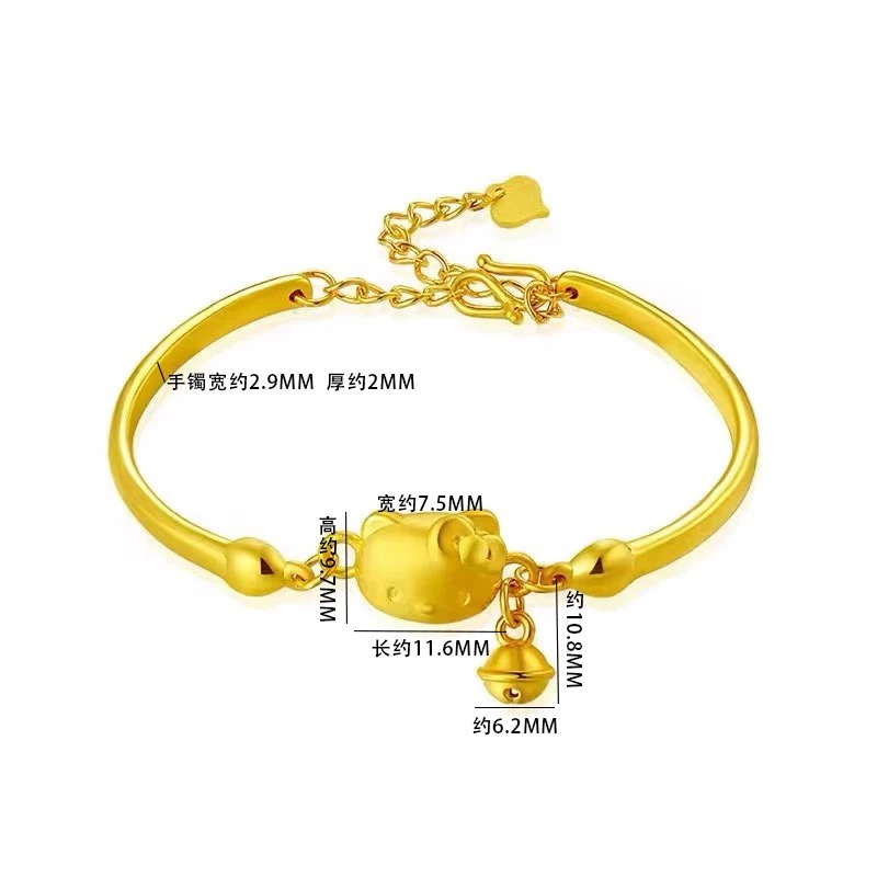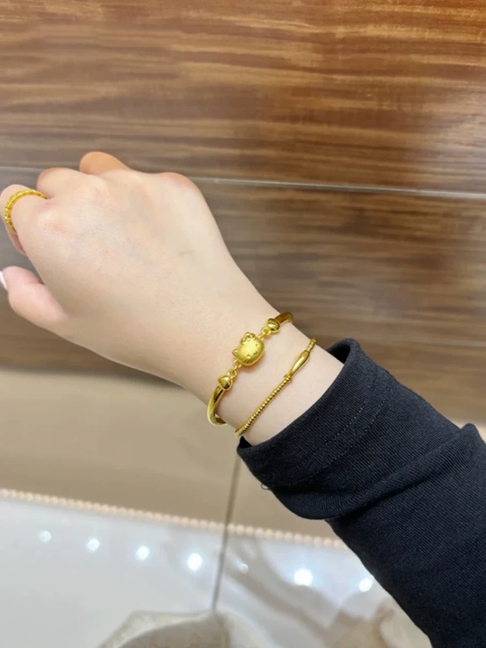 3D Hard Gold Kitty Cat Bell Bracelet Chain for Women, 999 Pure Gold, Same Style as on Xiaohongshu, Pure Gold Bracelet for Girlfriend