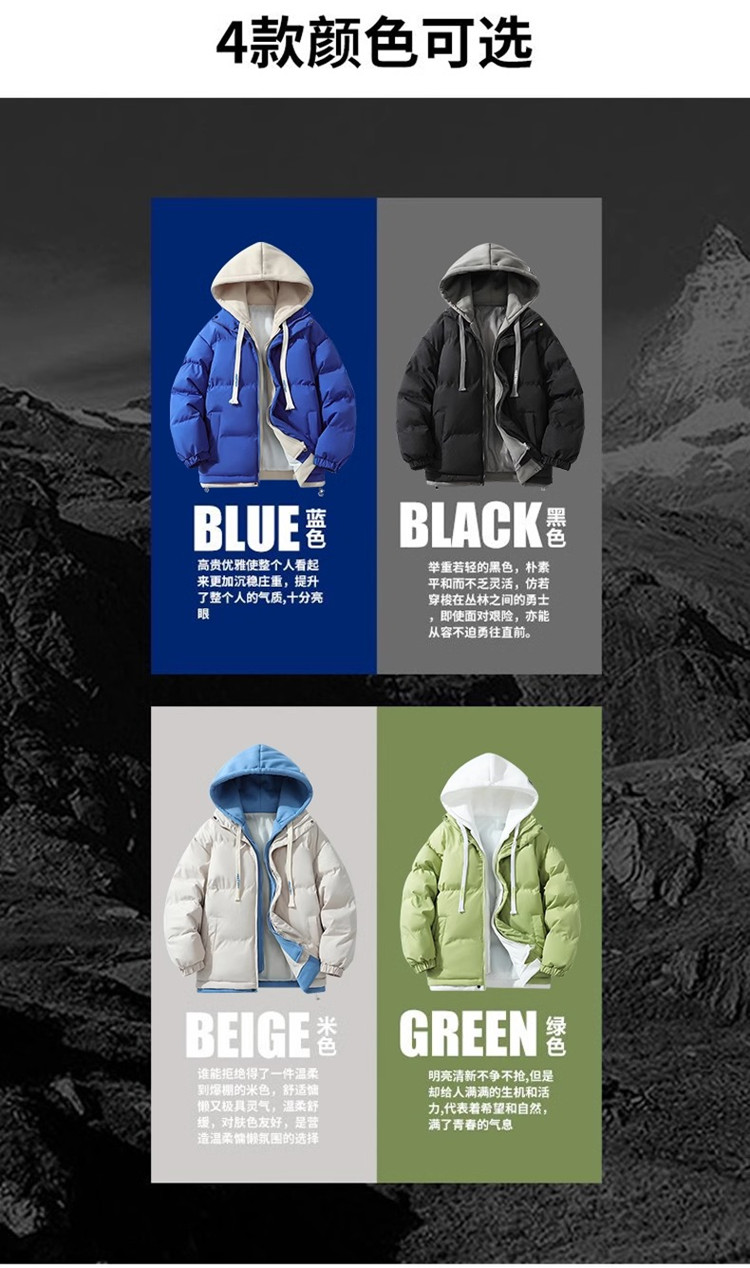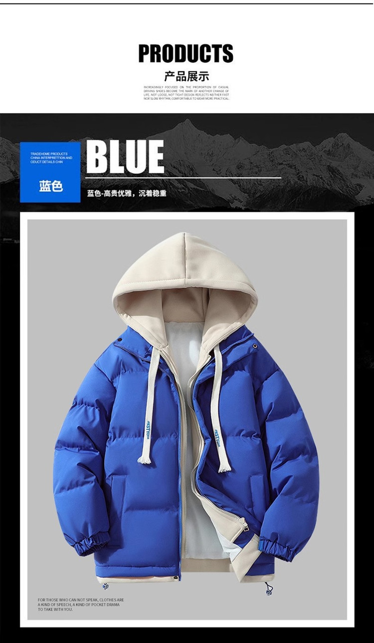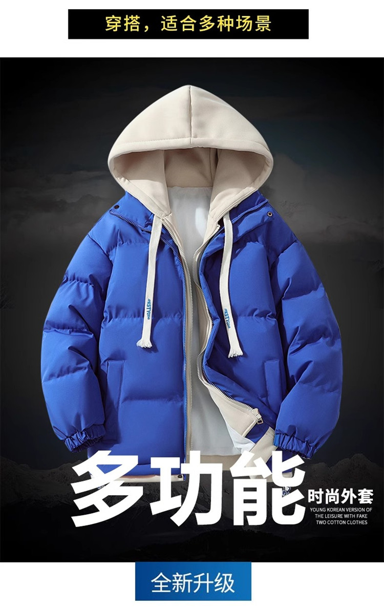 Men's down Cotton Jacket, New Winter Style, Couple's Loose-Fitting Faux Two-Piece Hong Kong Style Trendy Thick Hooded Puffer Coat