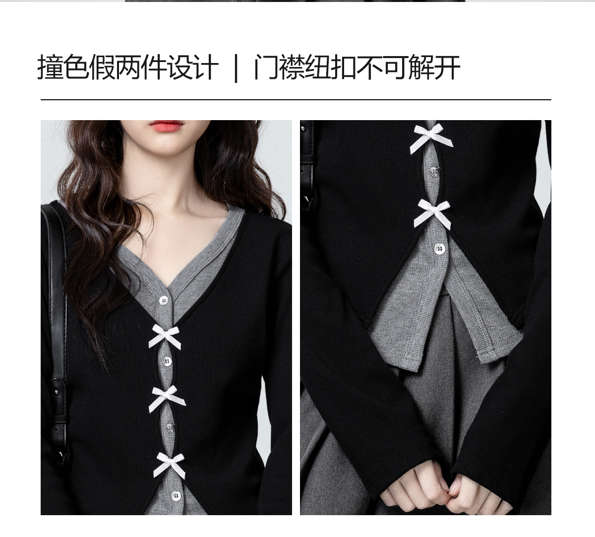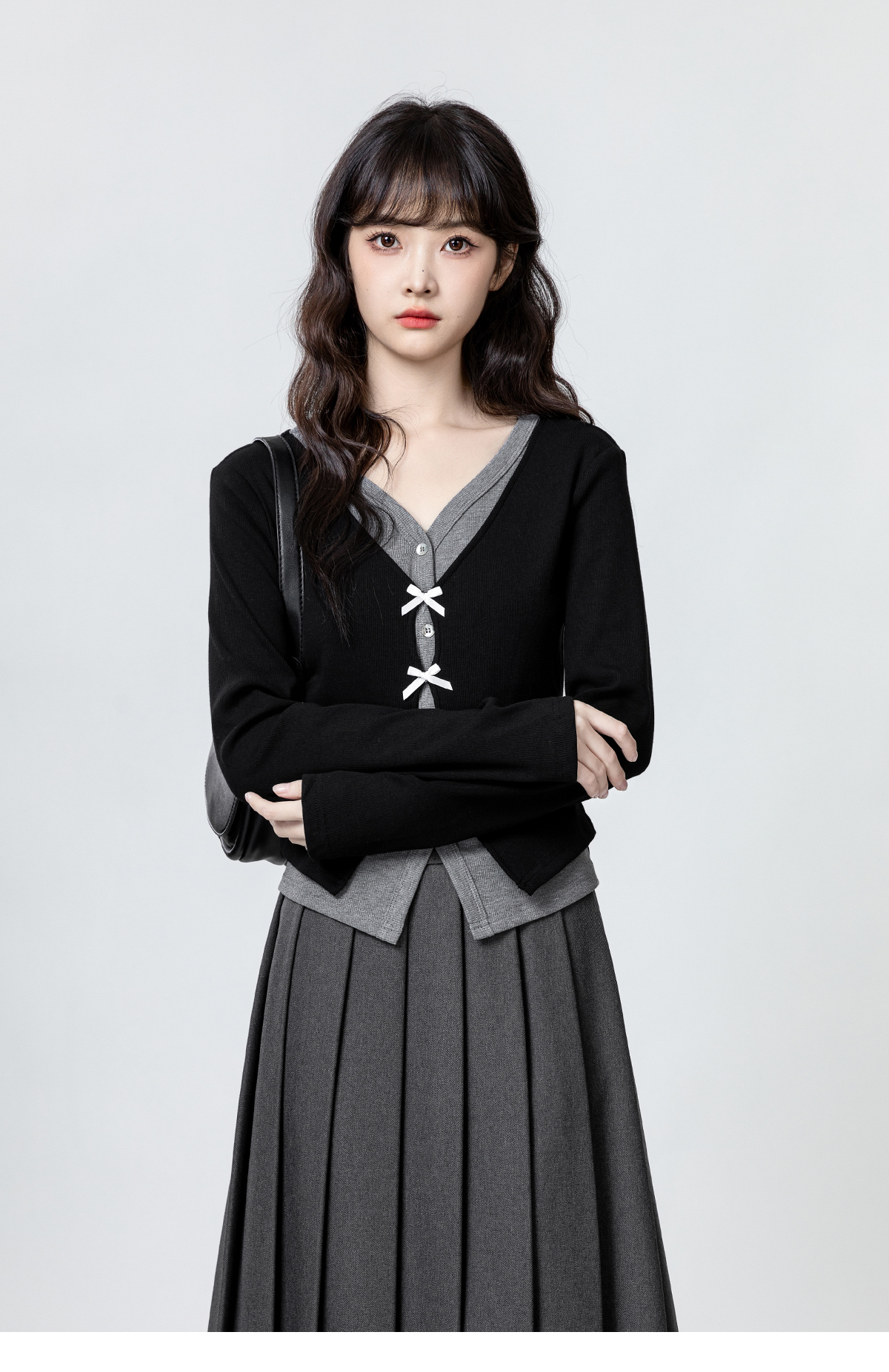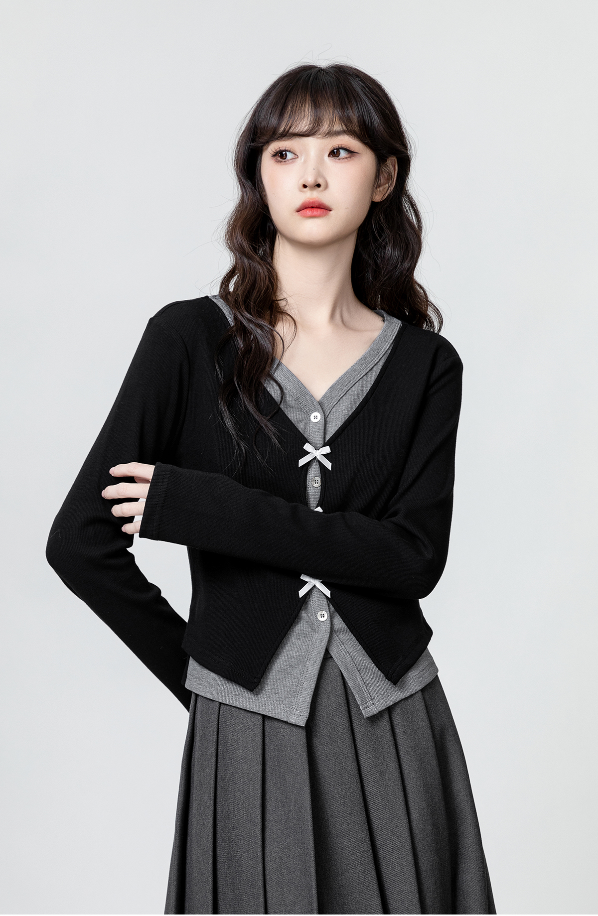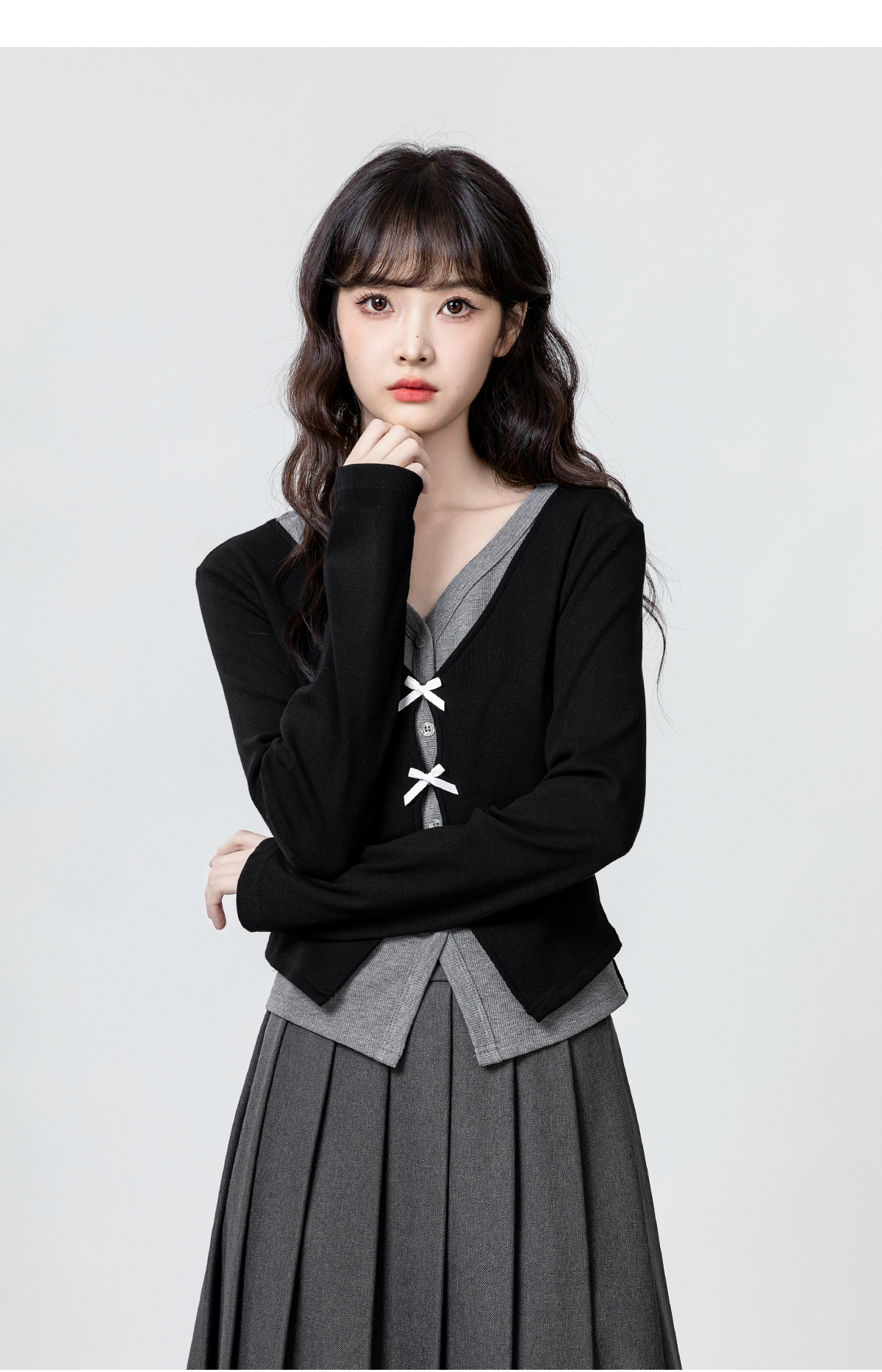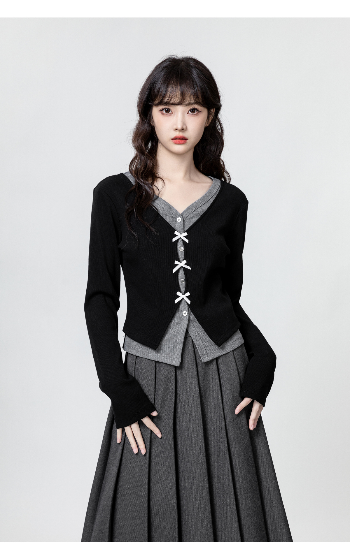Black Fake Two-Piece V-Neck Long-Sleeve T-Shirt for Women, 2025 Spring and Autumn New Style, Bow Design, Slimming Short Top