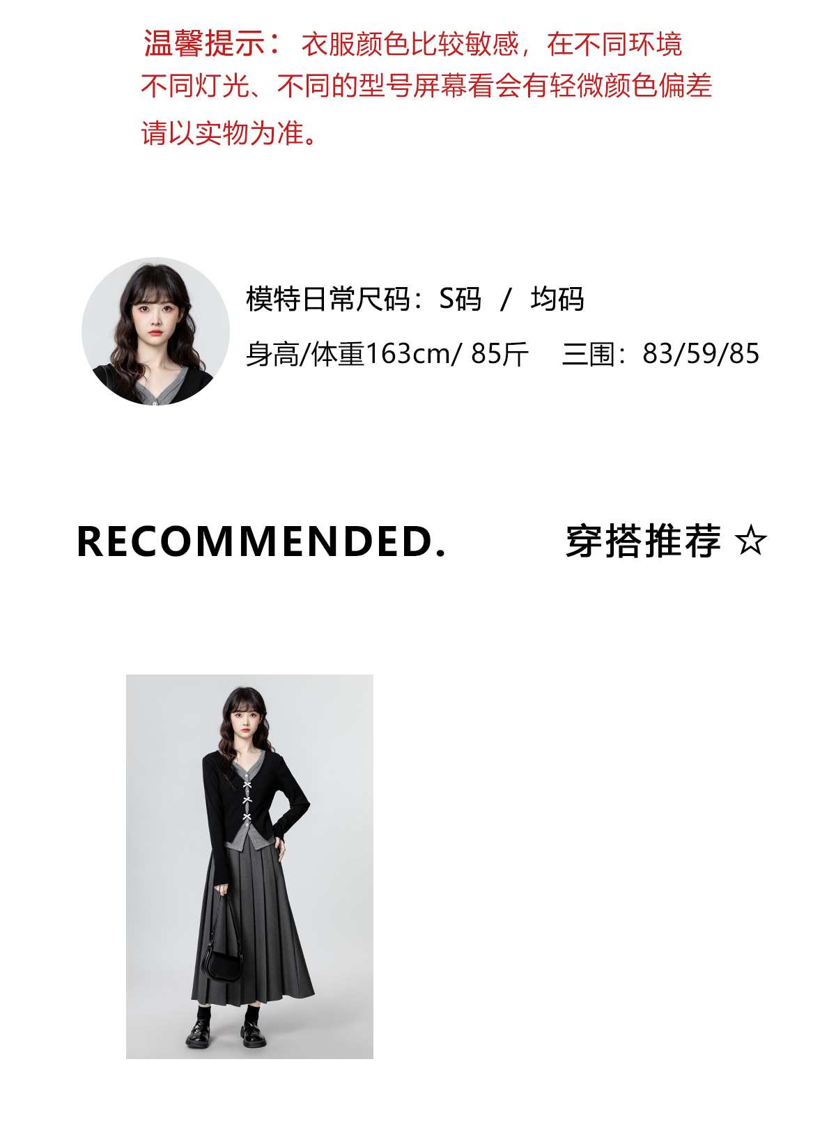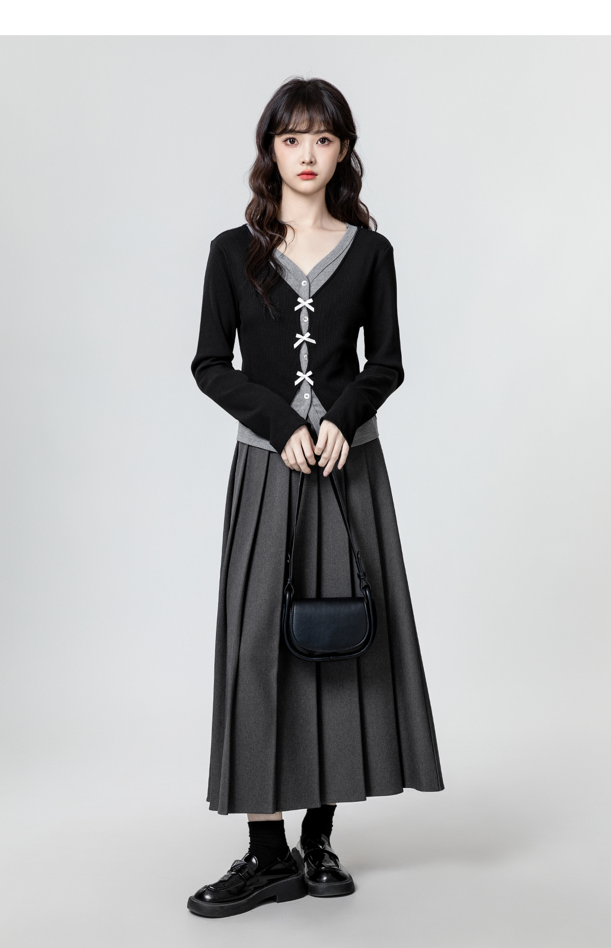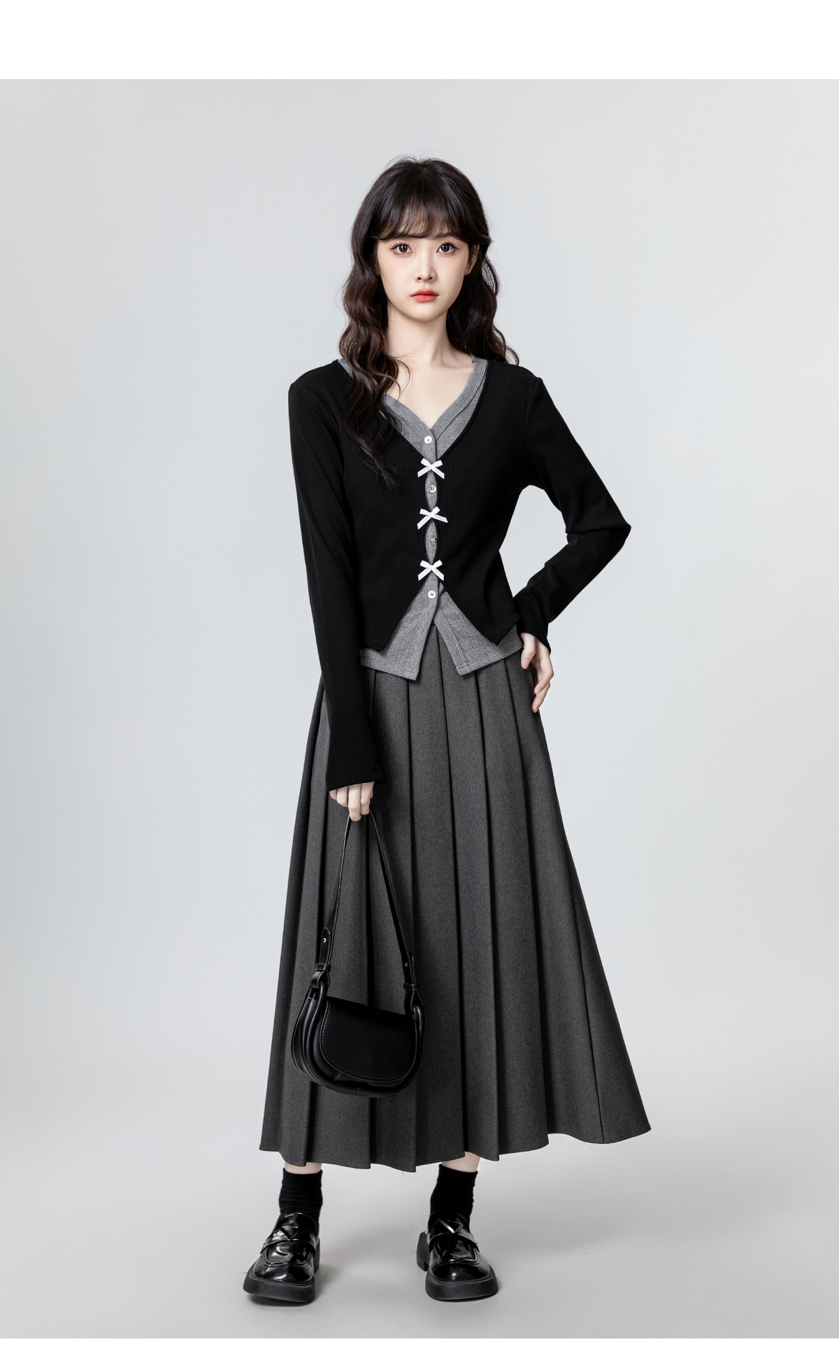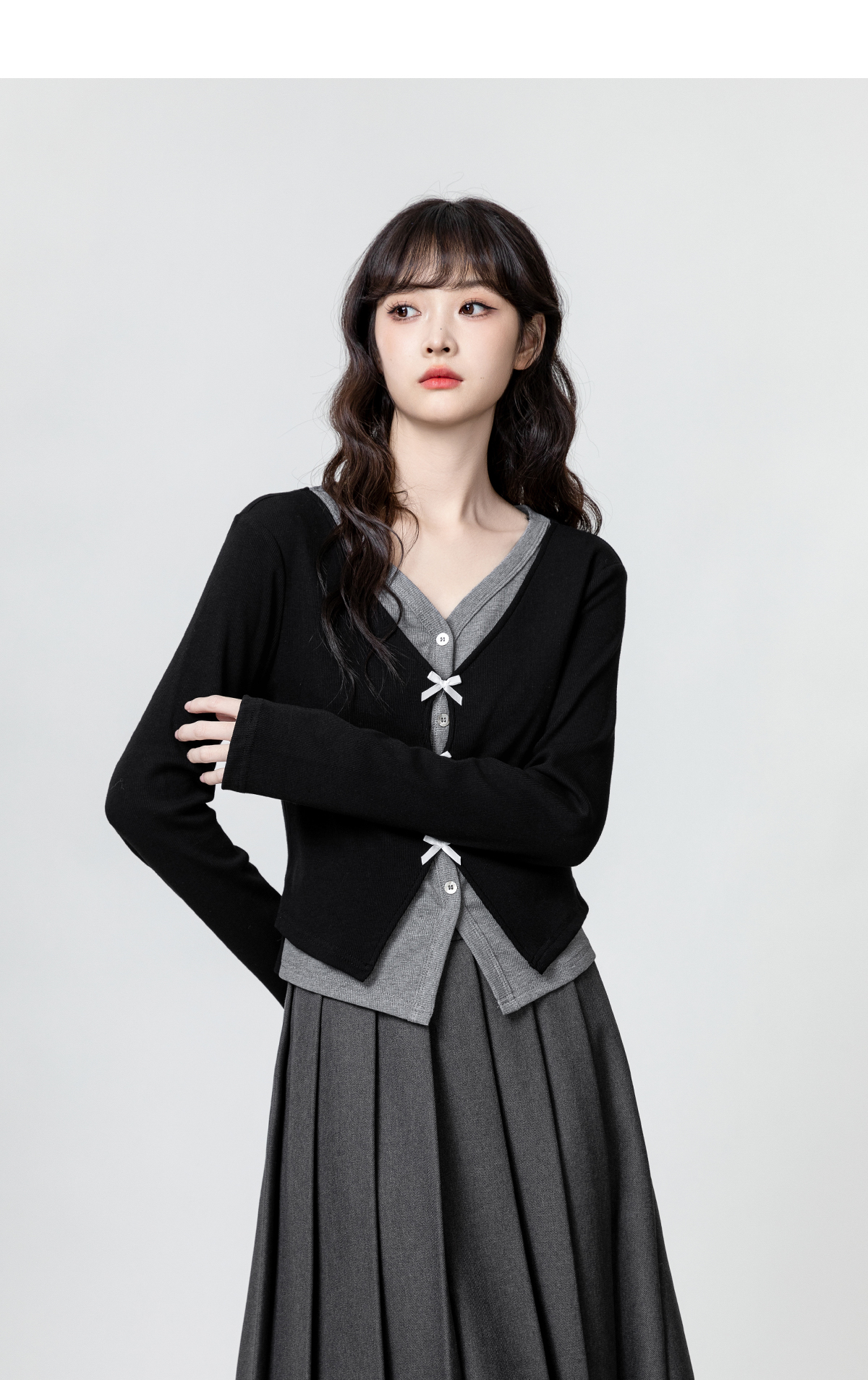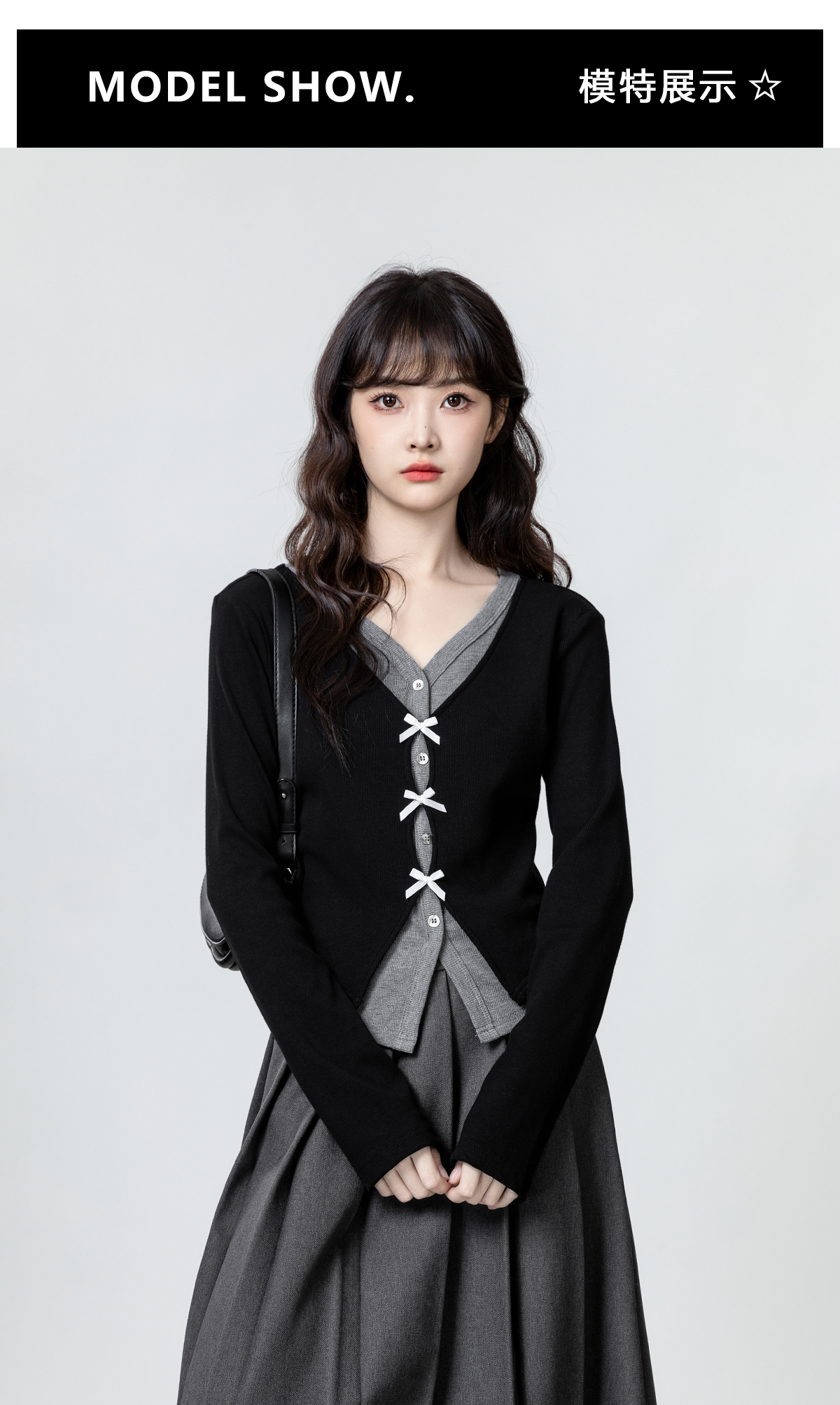 Black Fake Two-Piece V-Neck Long-Sleeve T-Shirt for Women, 2025 Spring and Autumn New Style, Bow Design, Slimming Short Top