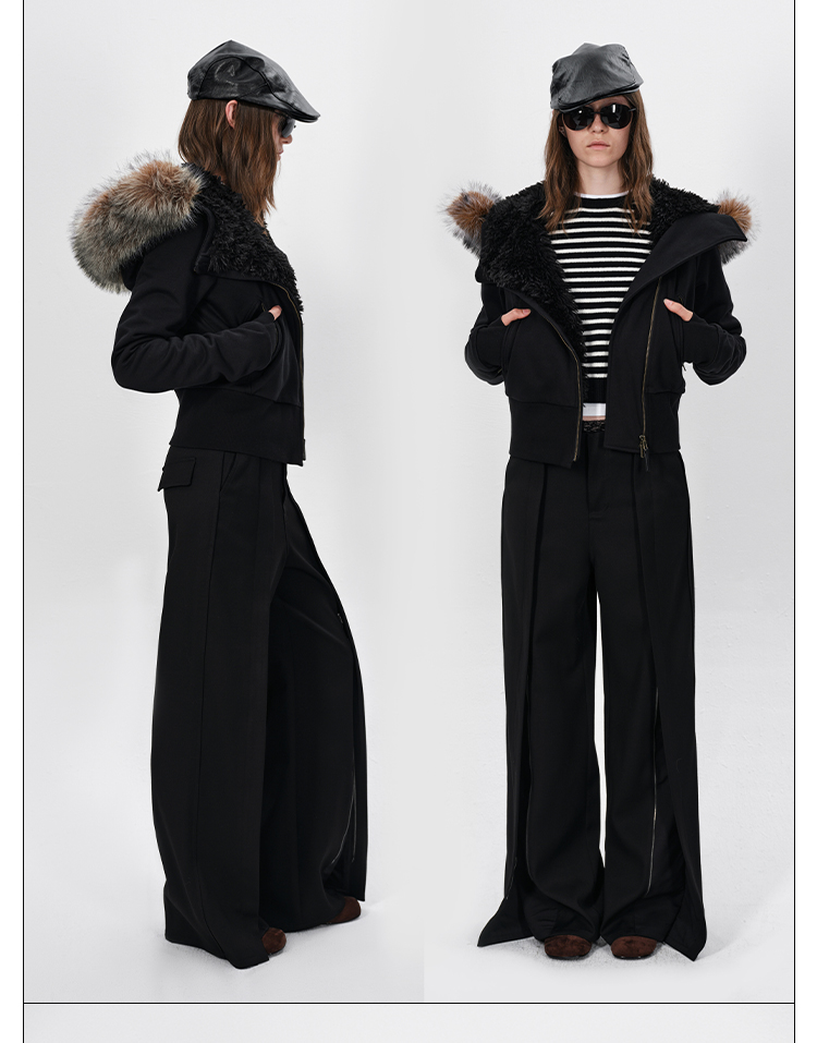 Rarely Alike Hooded Fur Collar Diagonal Placket Plush Lining Cotton Jacket Black/Gray/Navy Blue