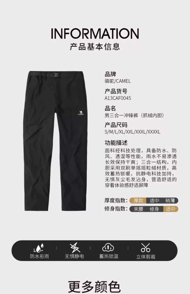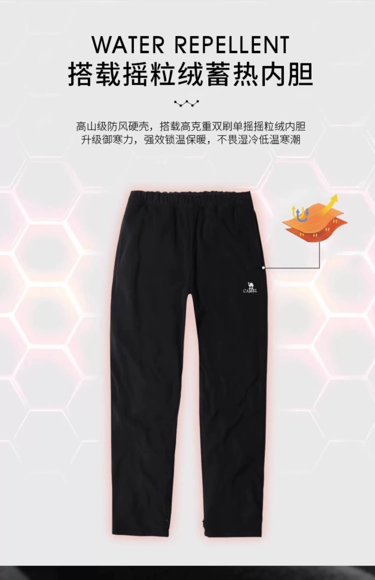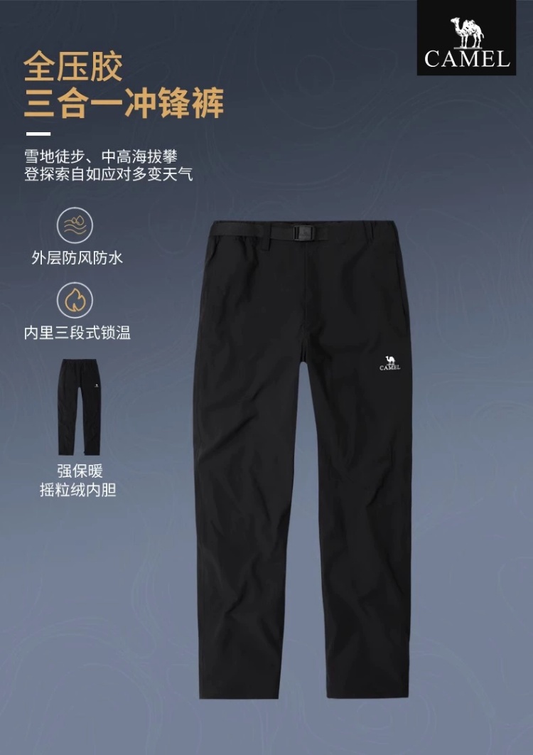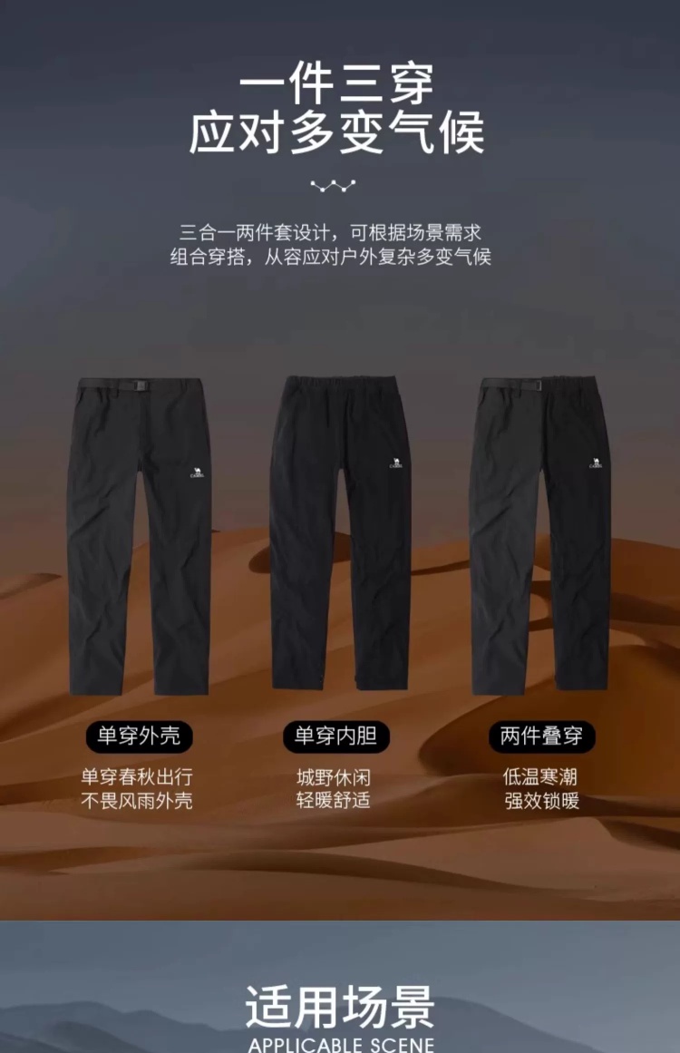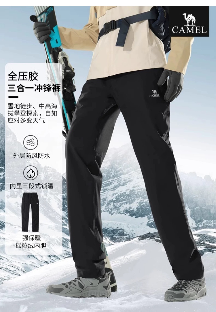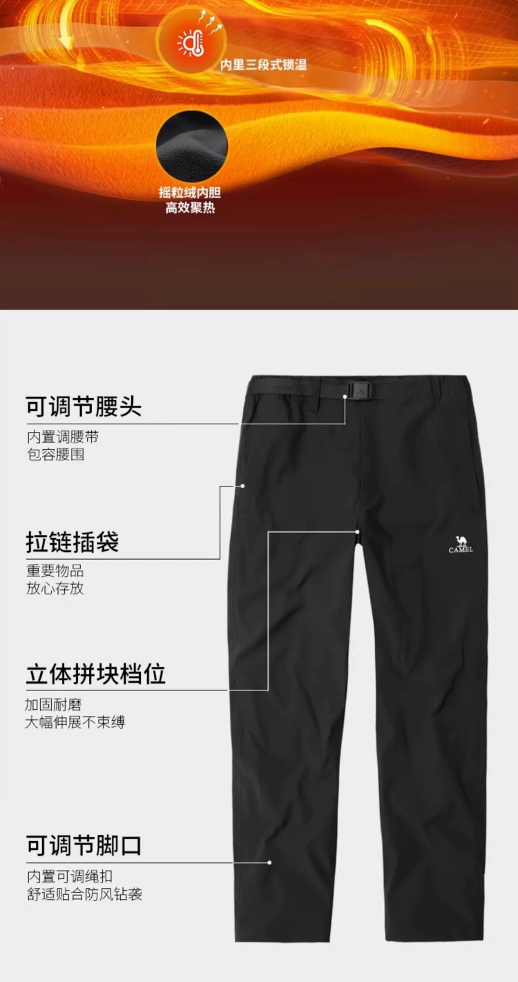 Camel 3-in-1 Softshell Pants for Men, Autumn and Winter Outdoor Windproof and Water-Repellent Hiking Pants for Women, Fleece-Lined and Thickened Casual Pants