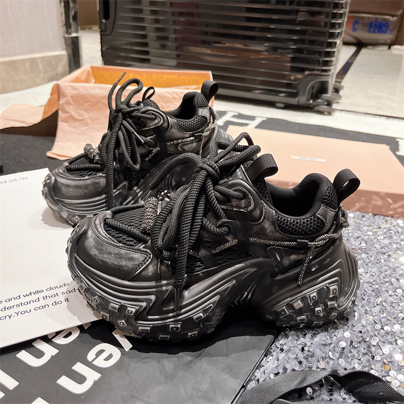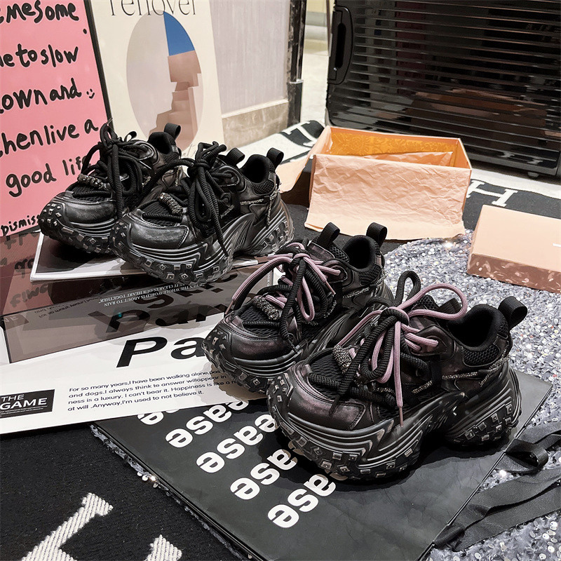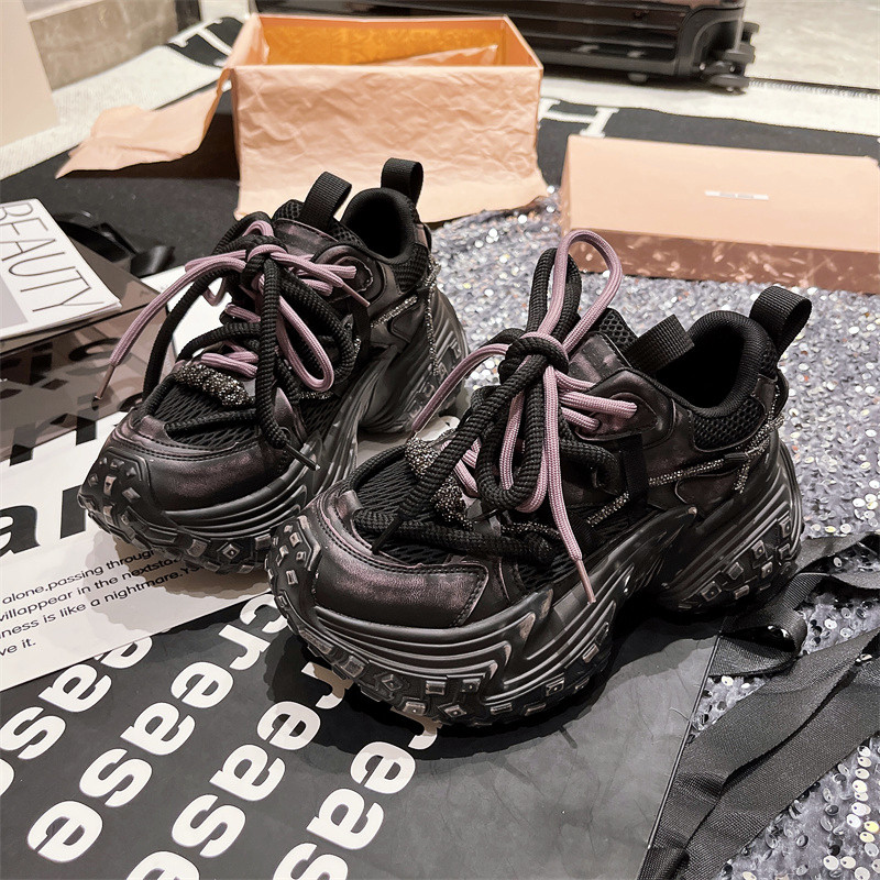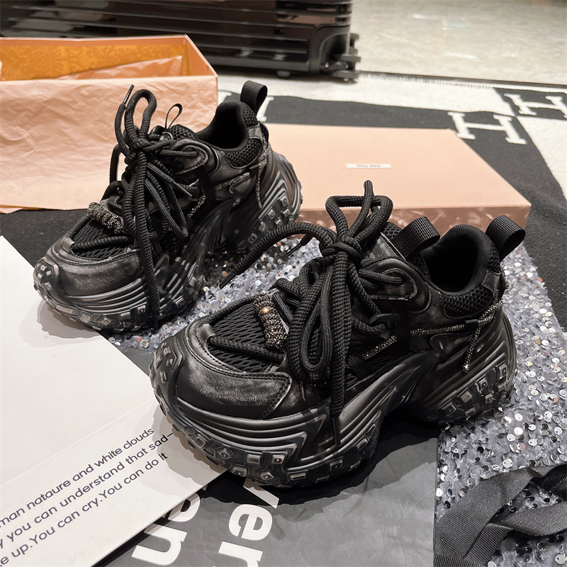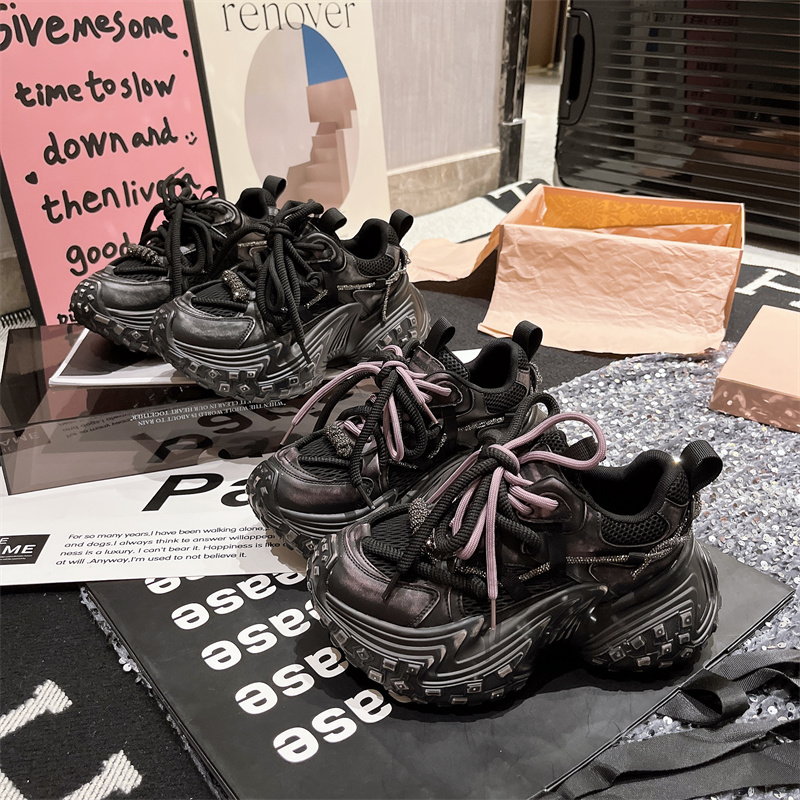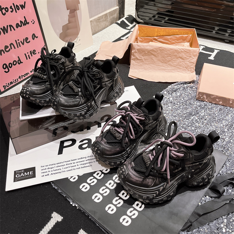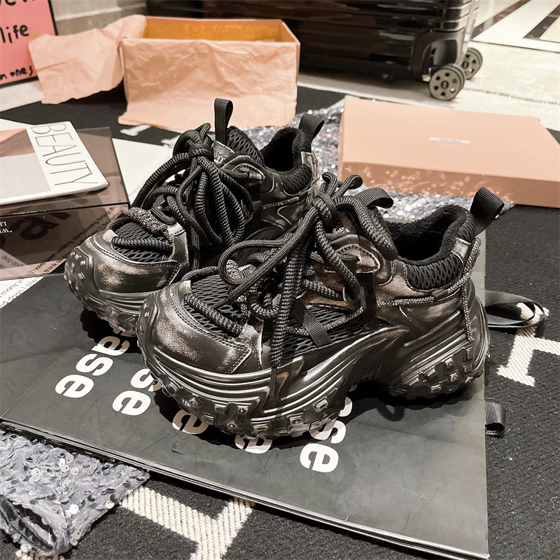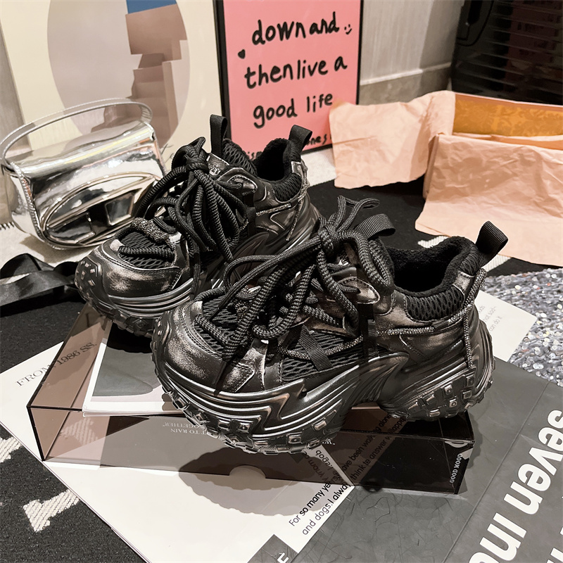 Sanli Genuine Leather Lace-Up Thick-Soled Height-Increasing Casual Sneakers for Women 2025 New Tire Durian Sole Color-Polished Dad Shoes