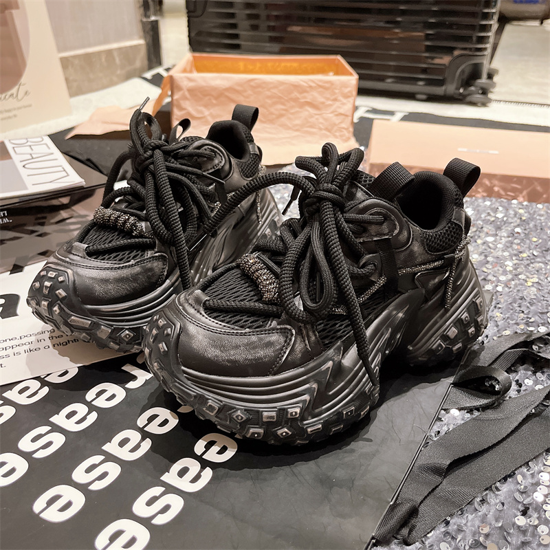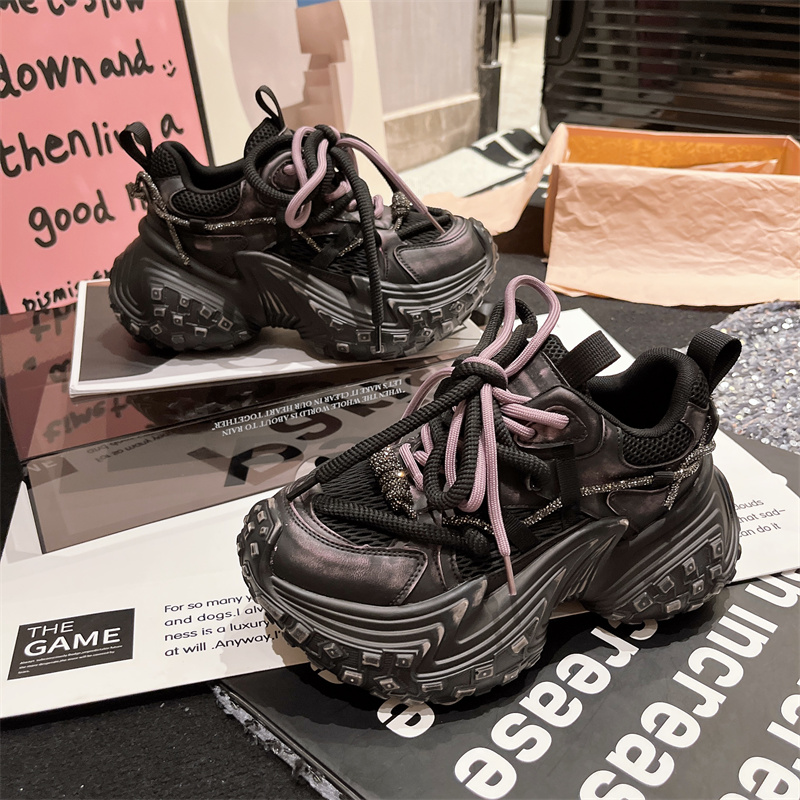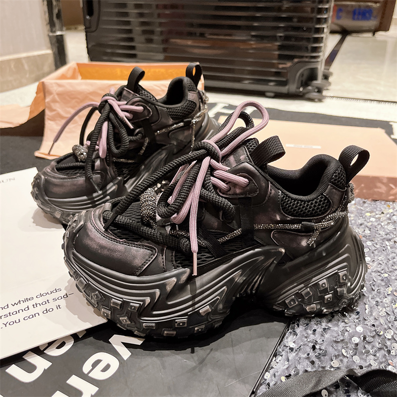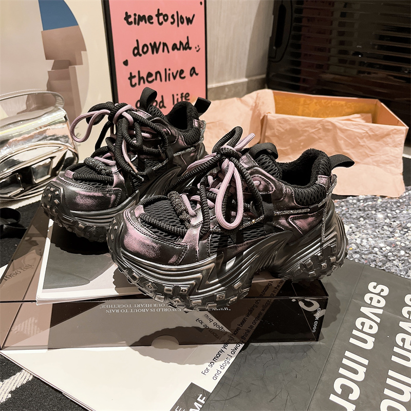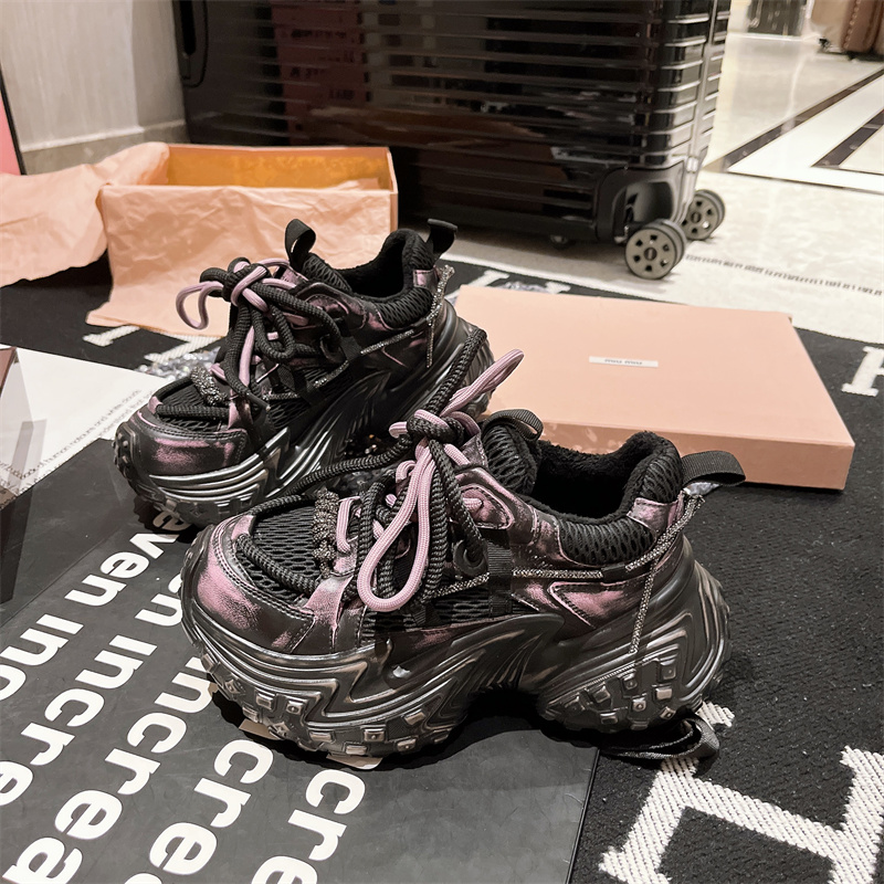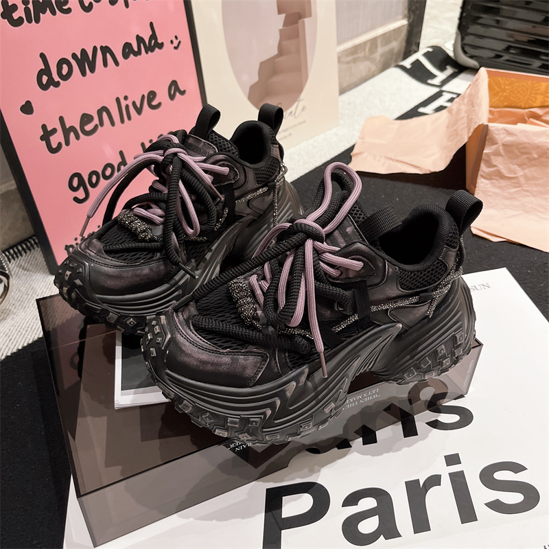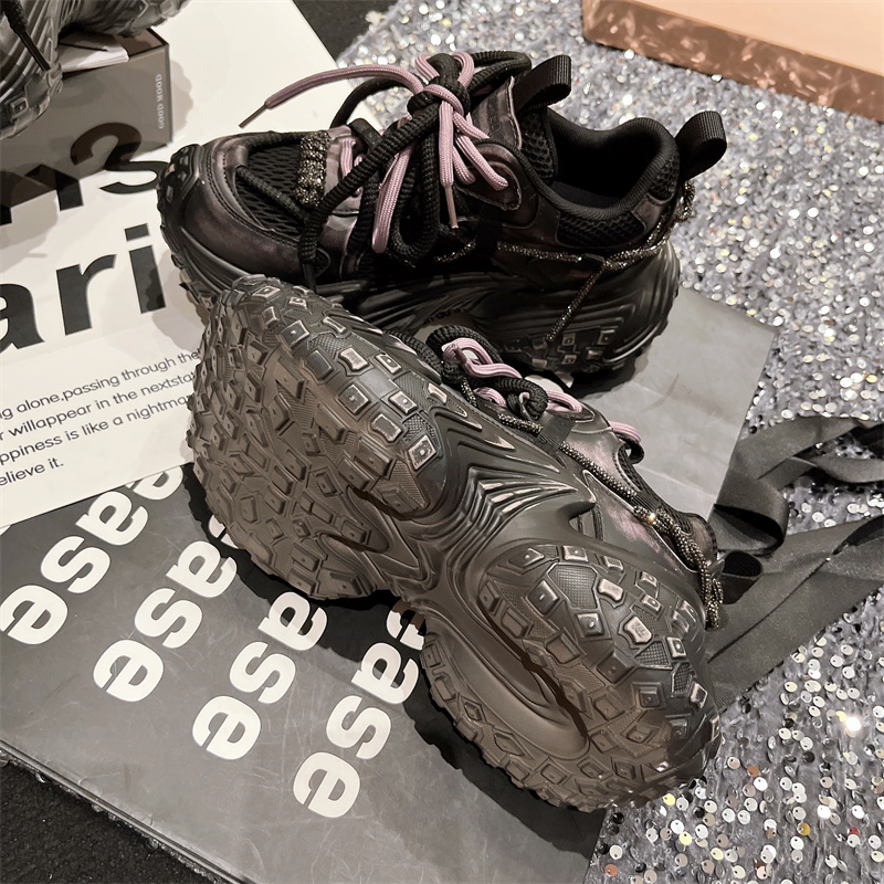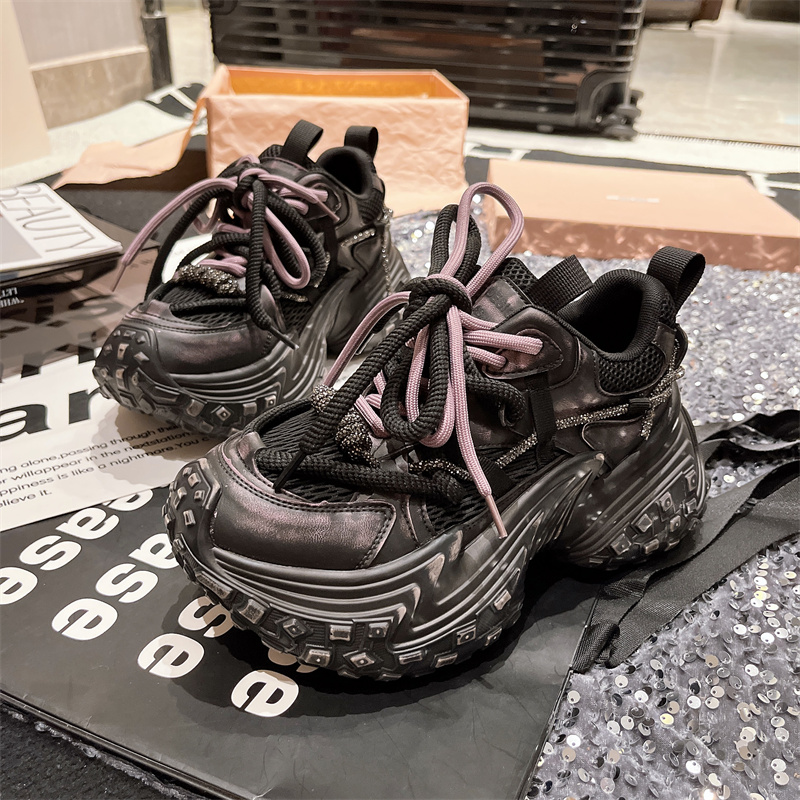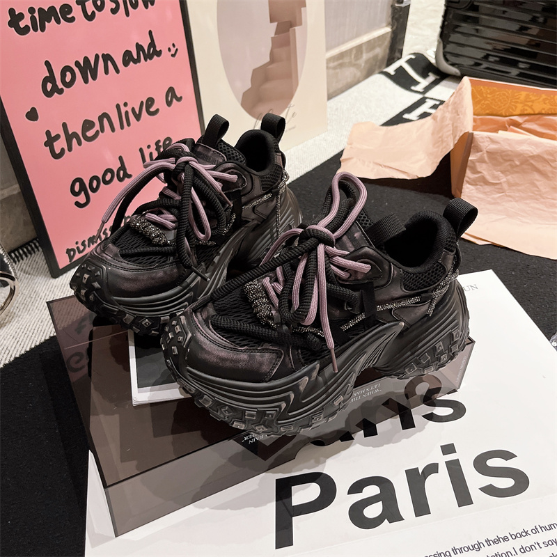 Sanli Genuine Leather Lace-Up Thick-Soled Height-Increasing Casual Sneakers for Women 2025 New Tire Durian Sole Color-Polished Dad Shoes