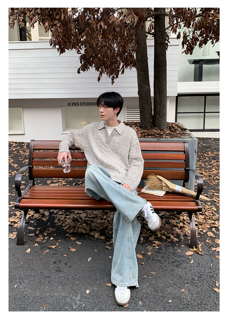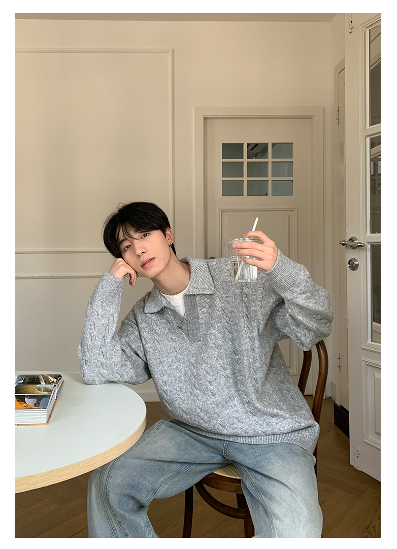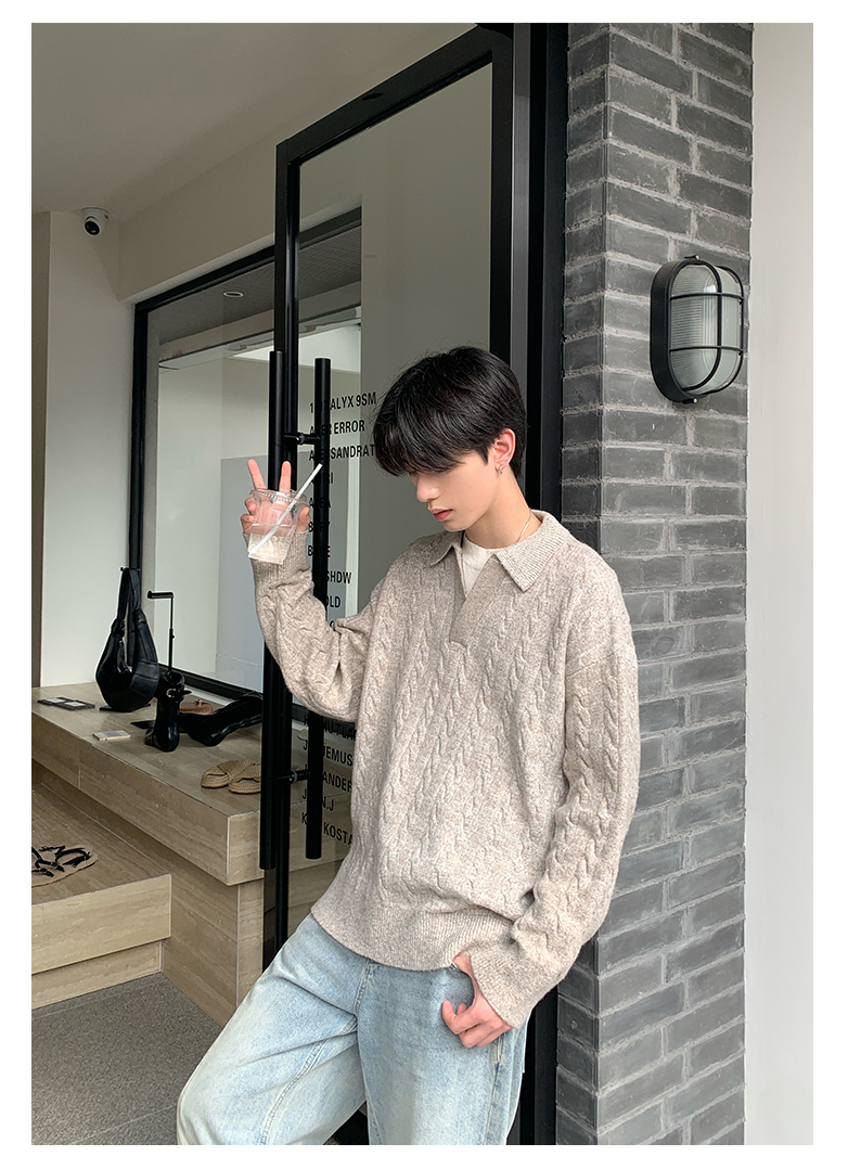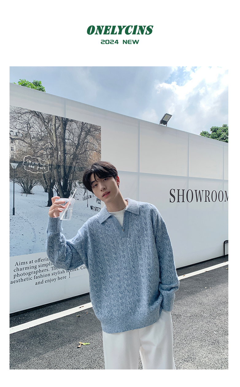 Onelyc1Ns Korean Style Fake Two-Piece Lapel Pullover Knitwear Long-Sleeved Men's Autum Loose Pure Color Casual Knitwear
