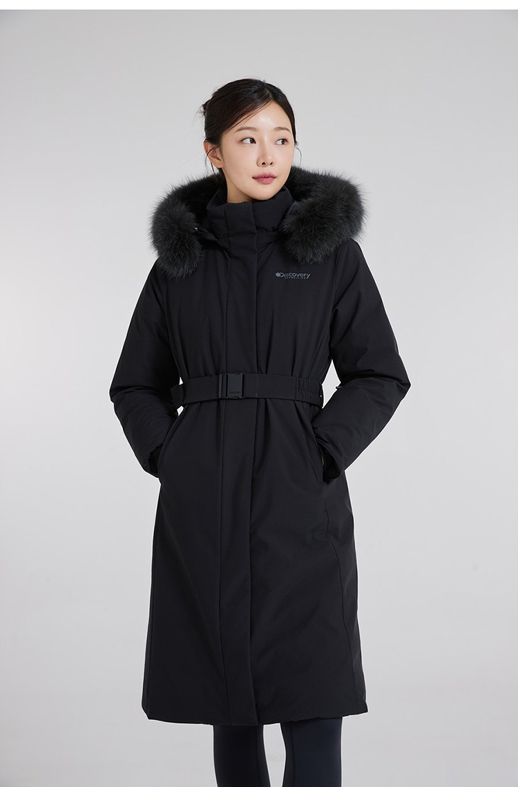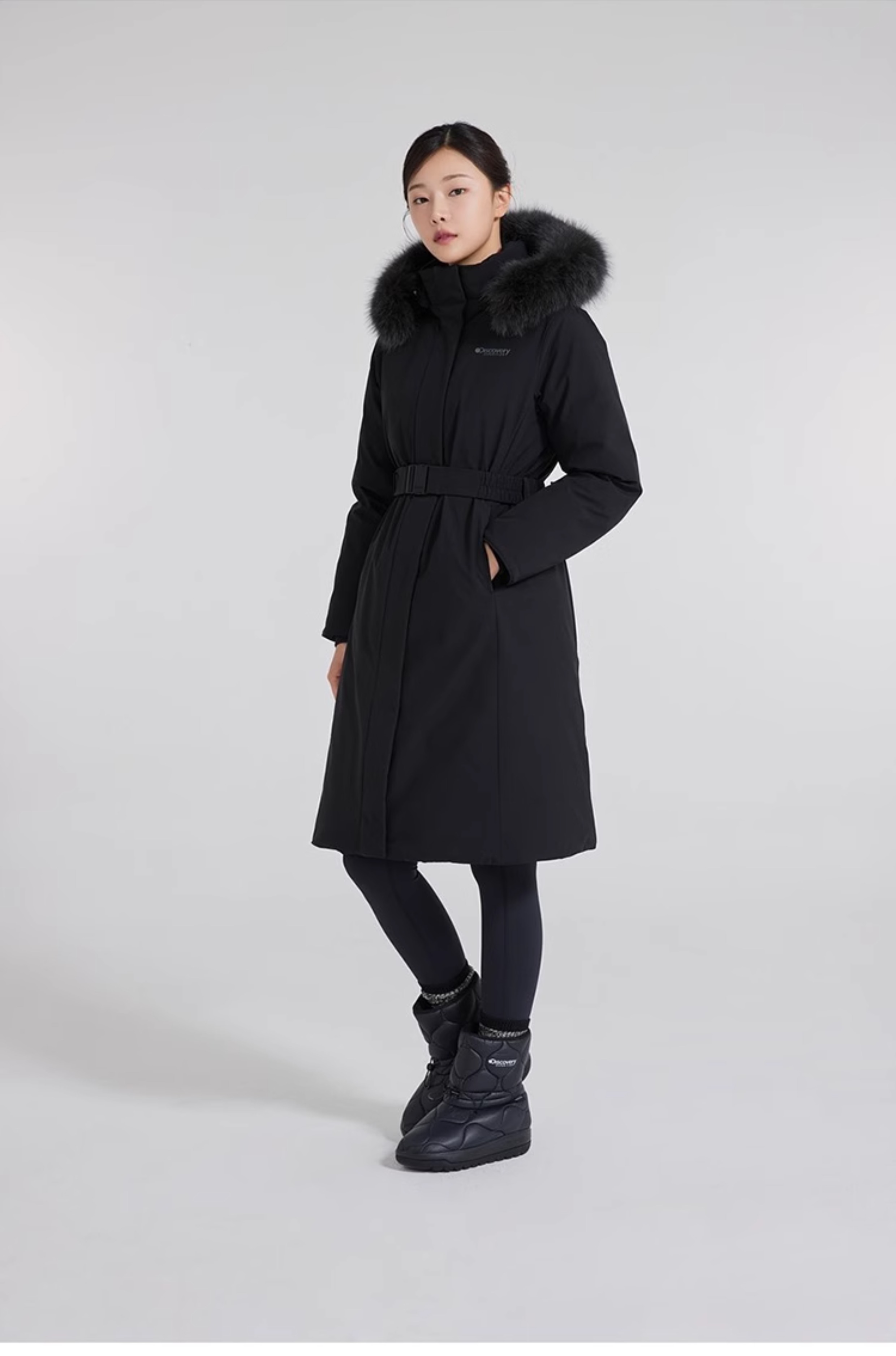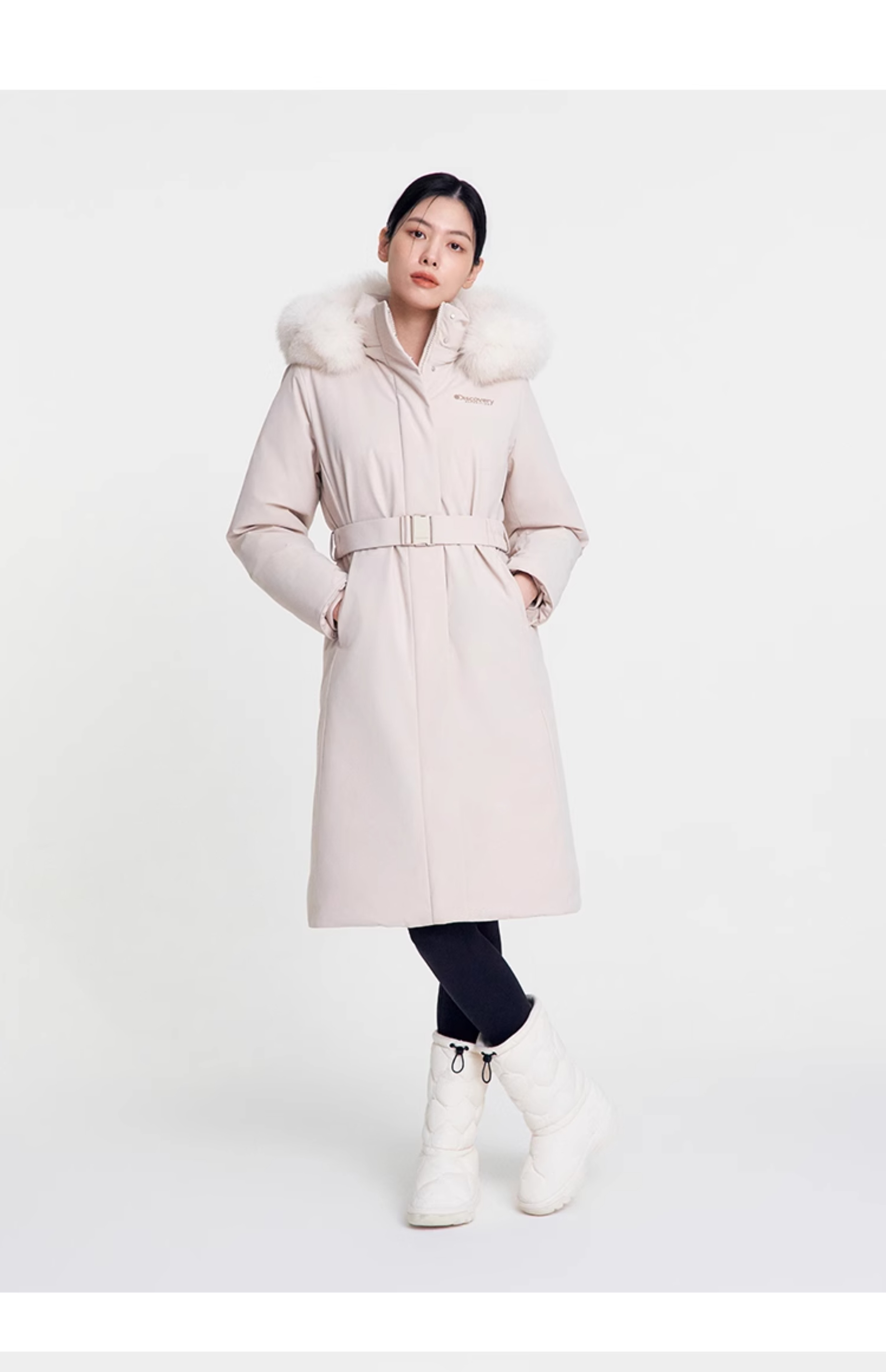 Discovery Winter Outdoor Long down Jacket 90% Goose down 700 Fill Power Waist-Cinching Fur Collar Hooded Warm down Jacket for Women