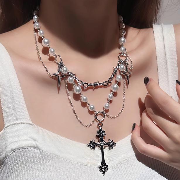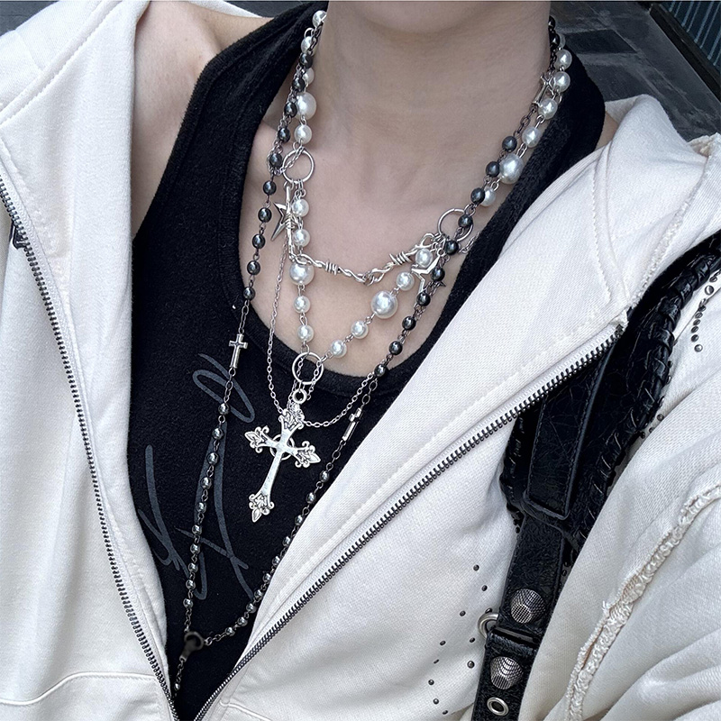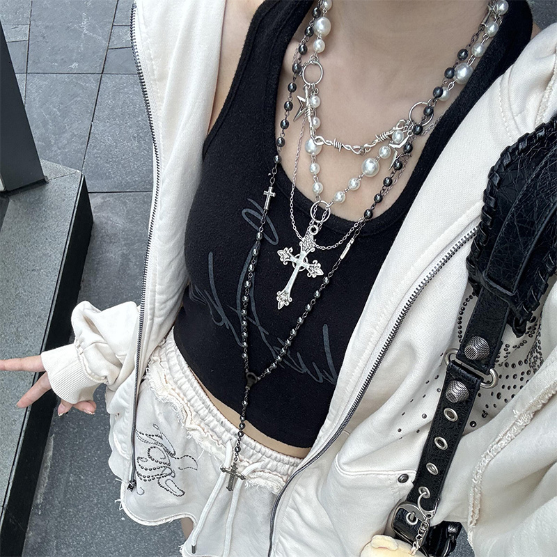 Gothic Stacked Cross Necklace Imitation Pearl Tassel choker Necklace Punk Clavicle Accessories Multi-Layer sweater chain