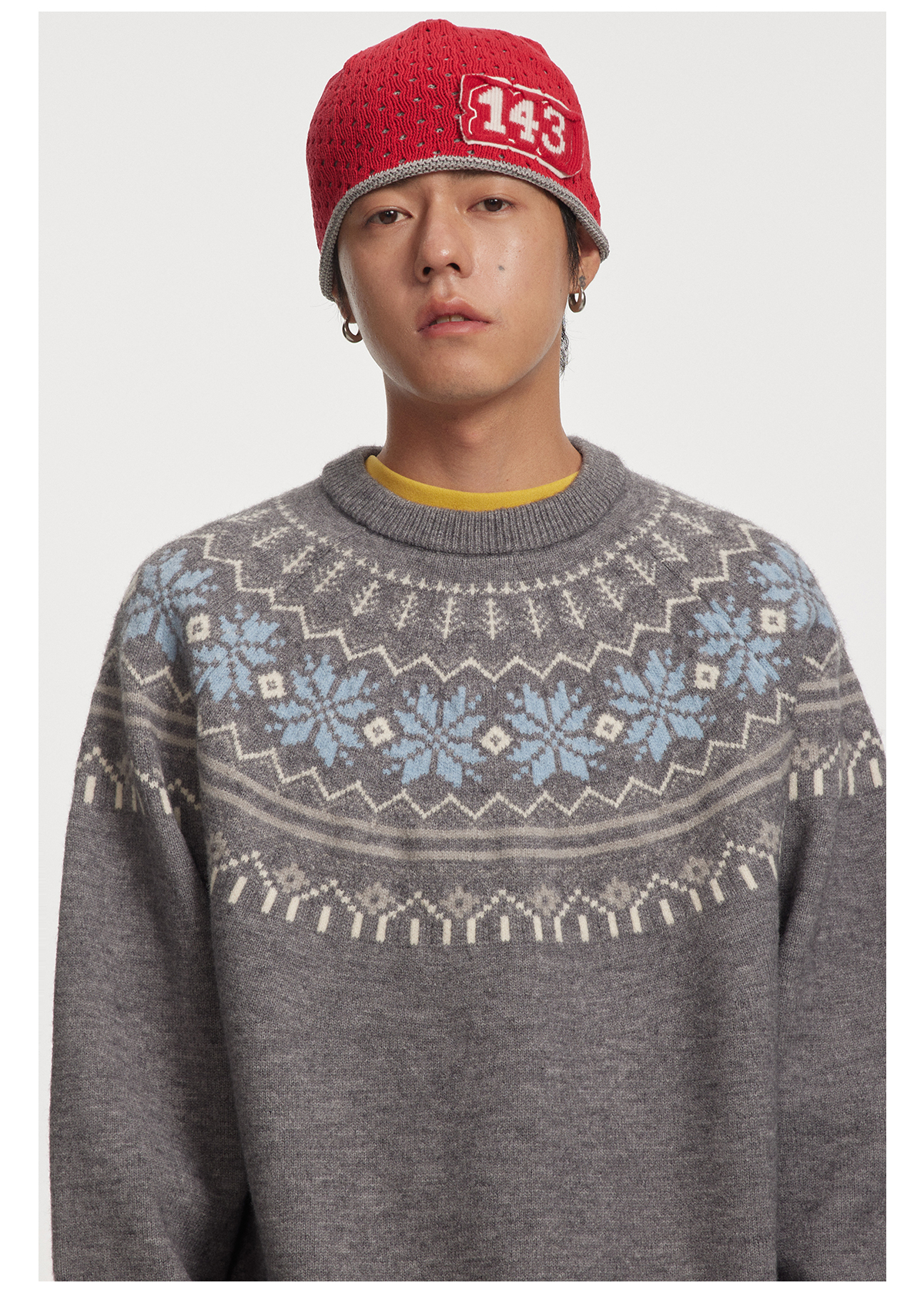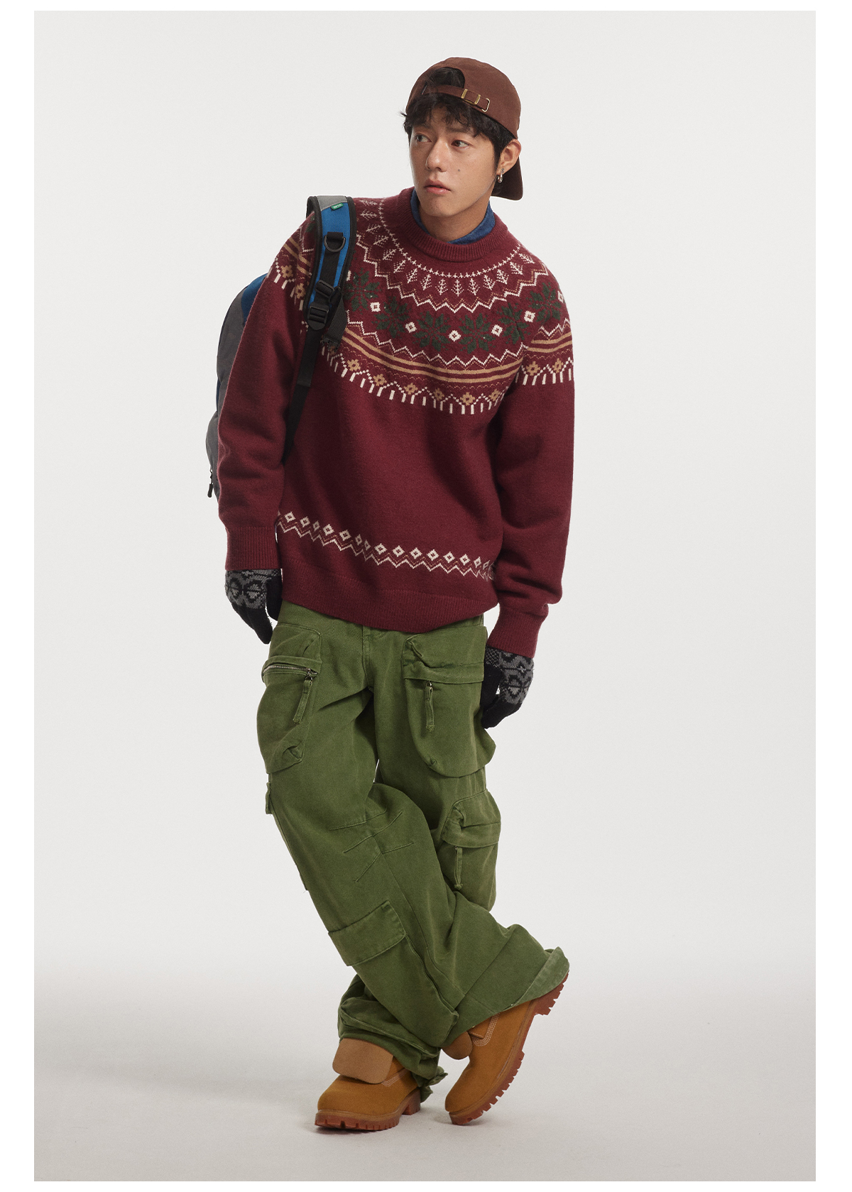 Mr. Jiangnan Newjnxs Retro Round-Neck Fair Isle Christmas Red Sweater Couple's Knitwear for Men and Women Autumn and Winter