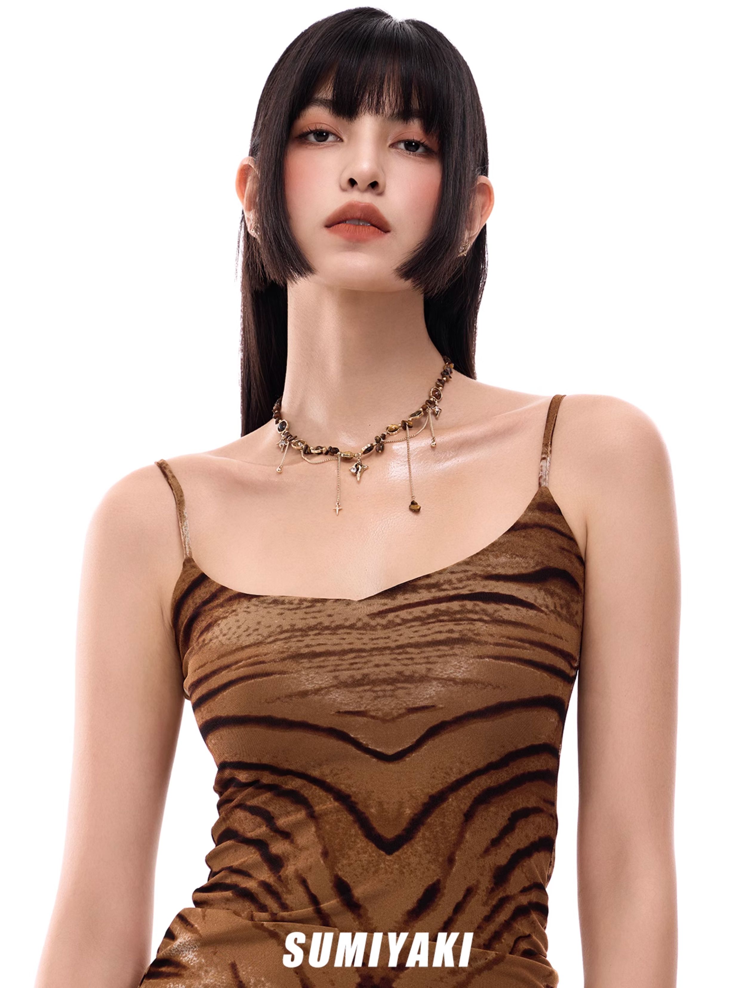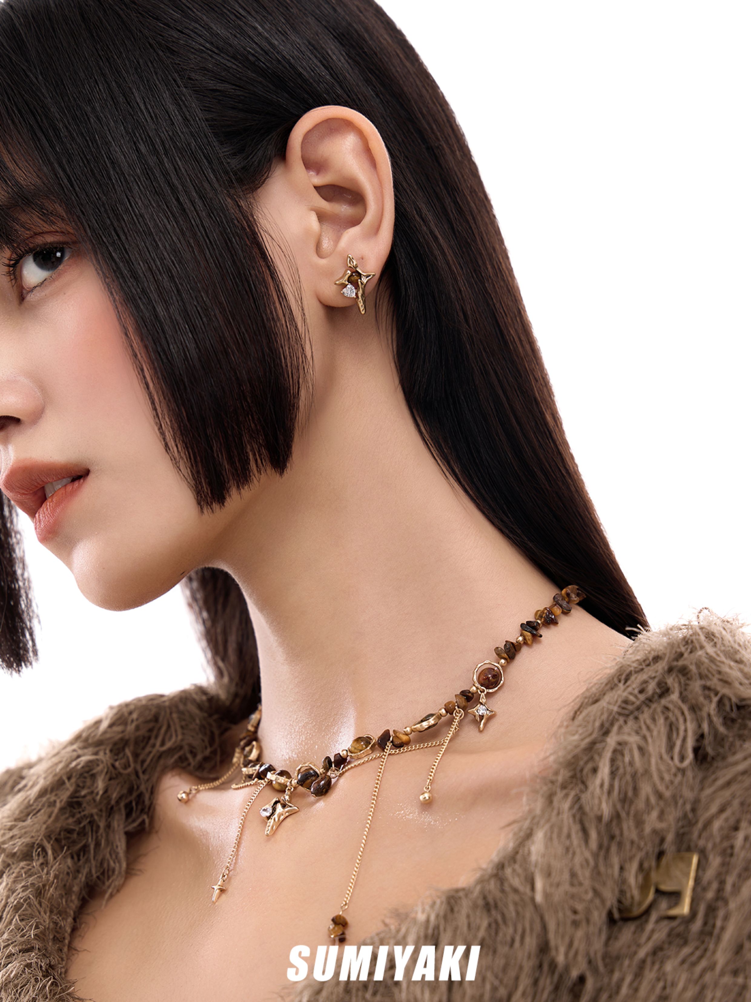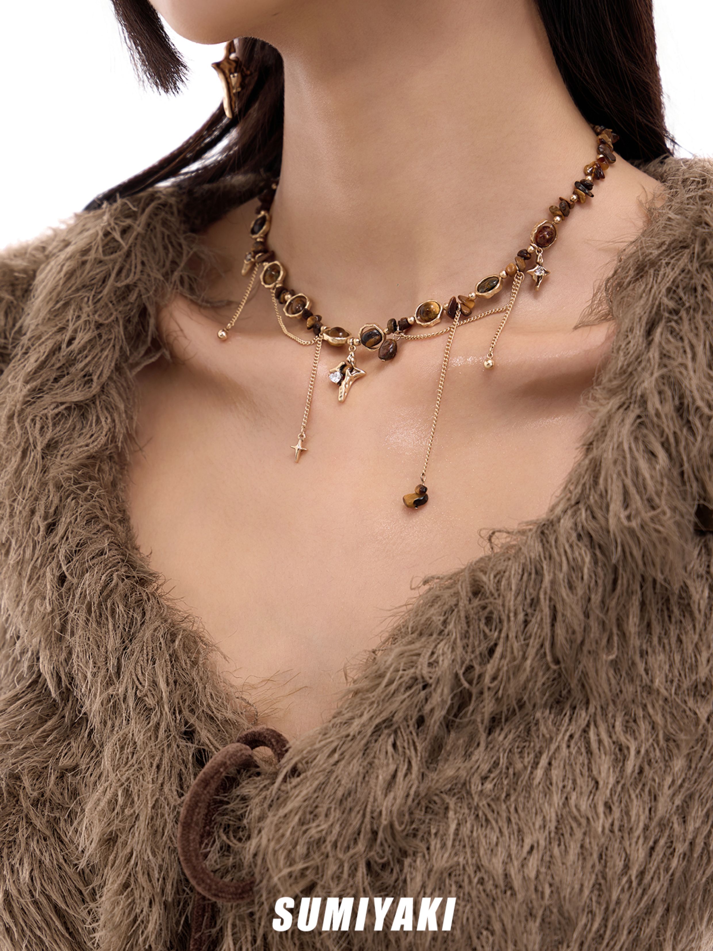 Sumiyaki Retro Yadan Style Beaded Tiger Eye Stone Star Necklace with Tassel Design Sweater Chain Couple Gift
