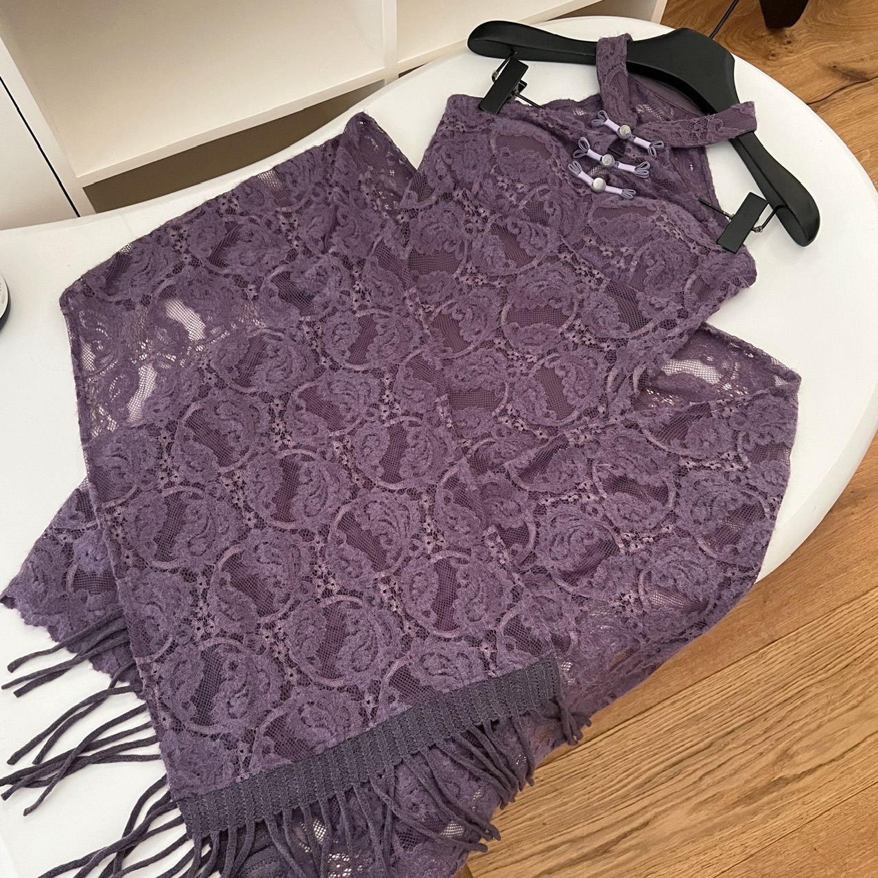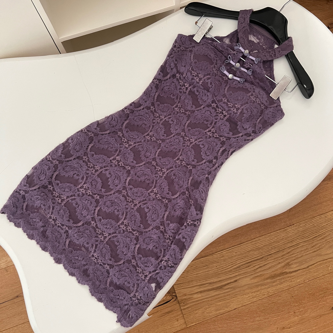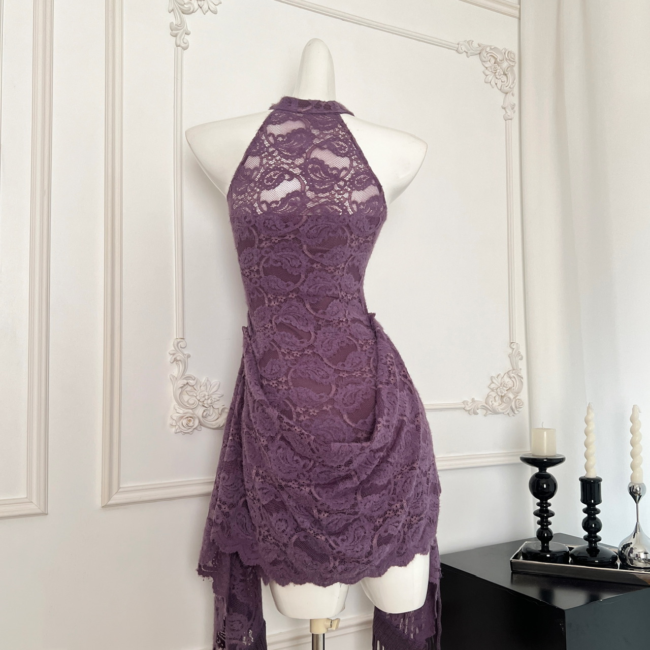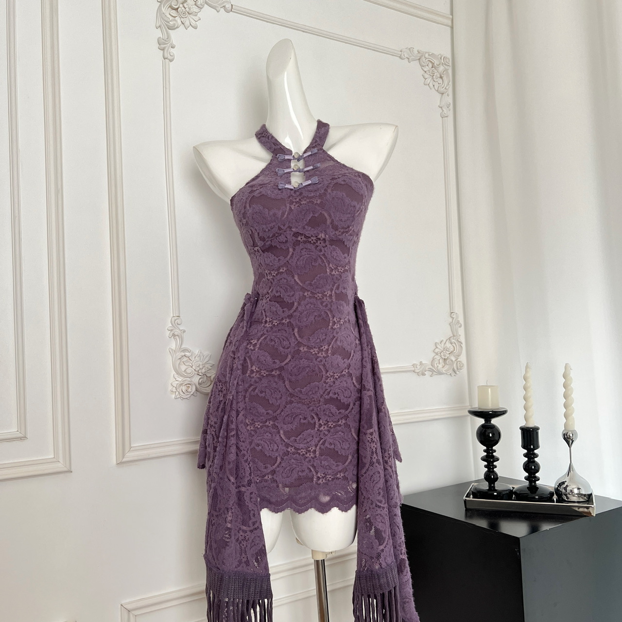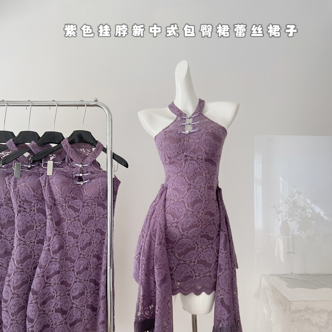 Peach LAOSHU Purple Halter Neck Dress for Women 2025 Spring New Style New Chinese Style Bodycon Dress Lace Dress