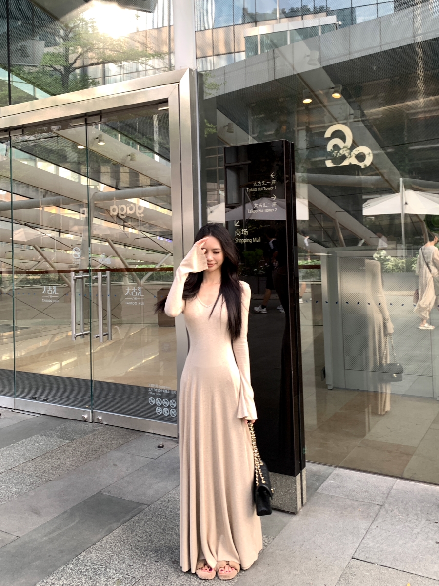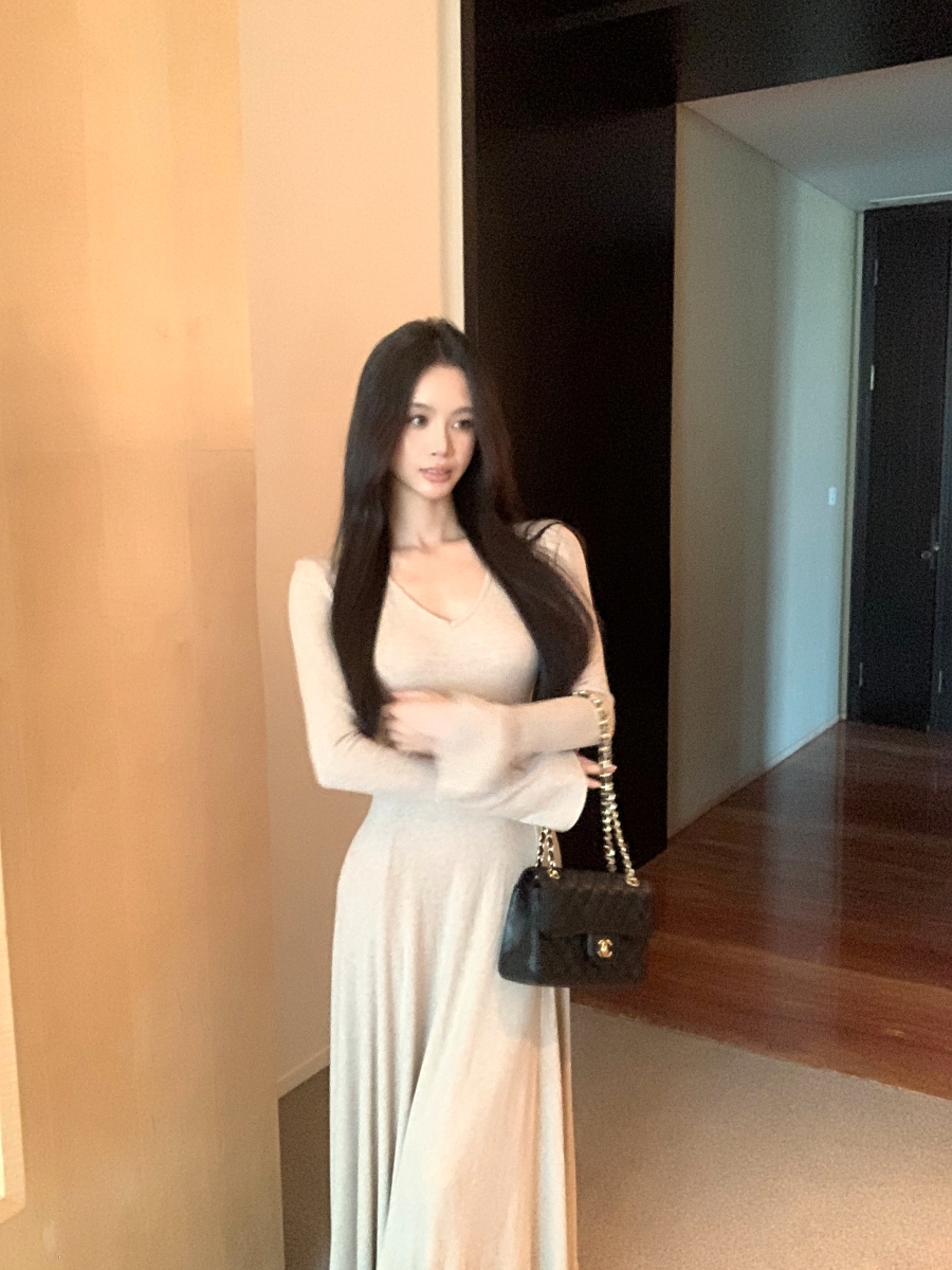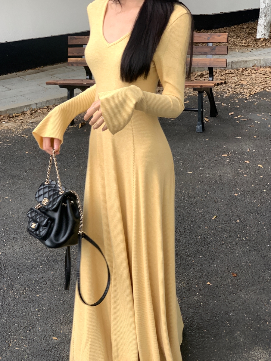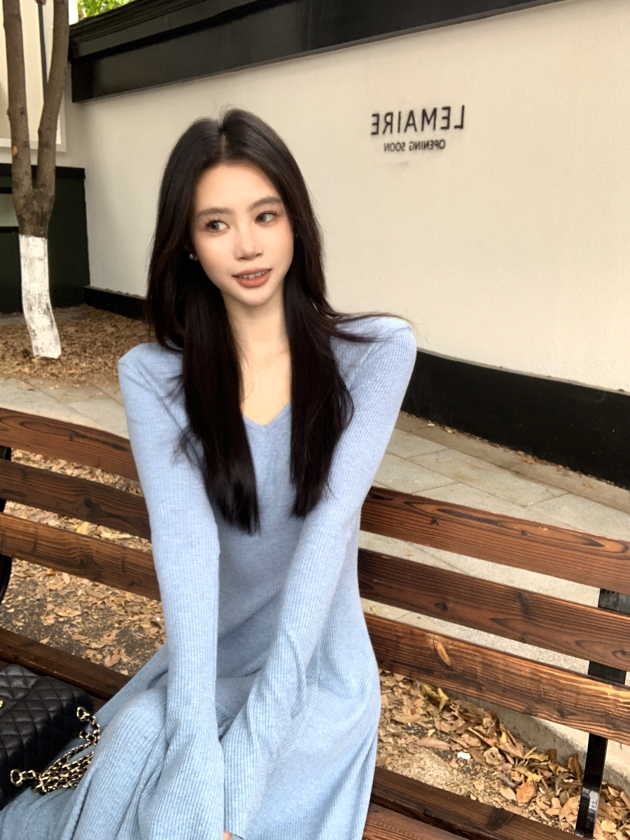 Gentle Style V Neck Long-Sleeved Knitted Dress for Women in Autum Black Sexy Waist Slimming Long Skirt