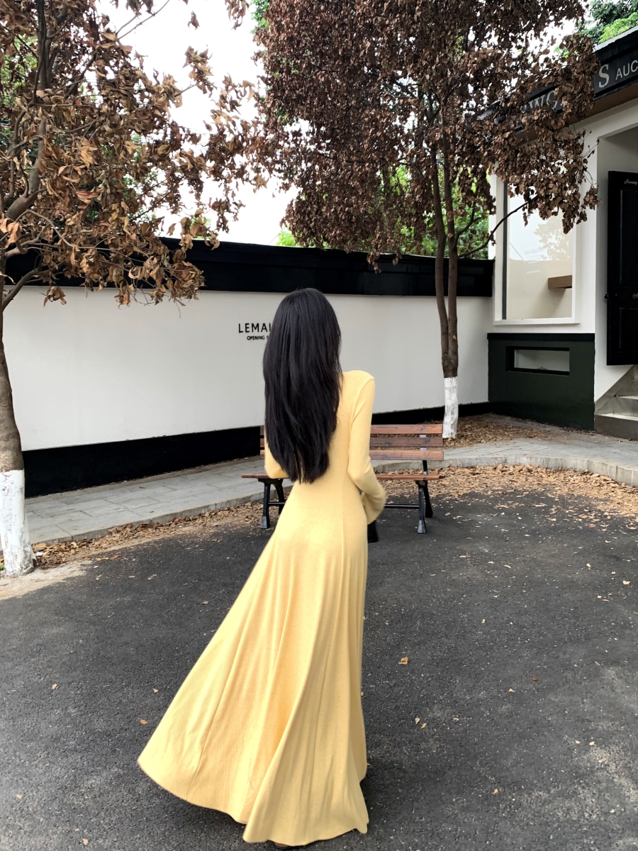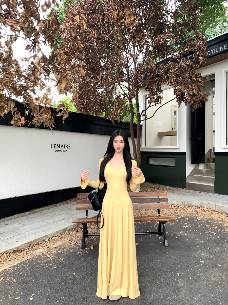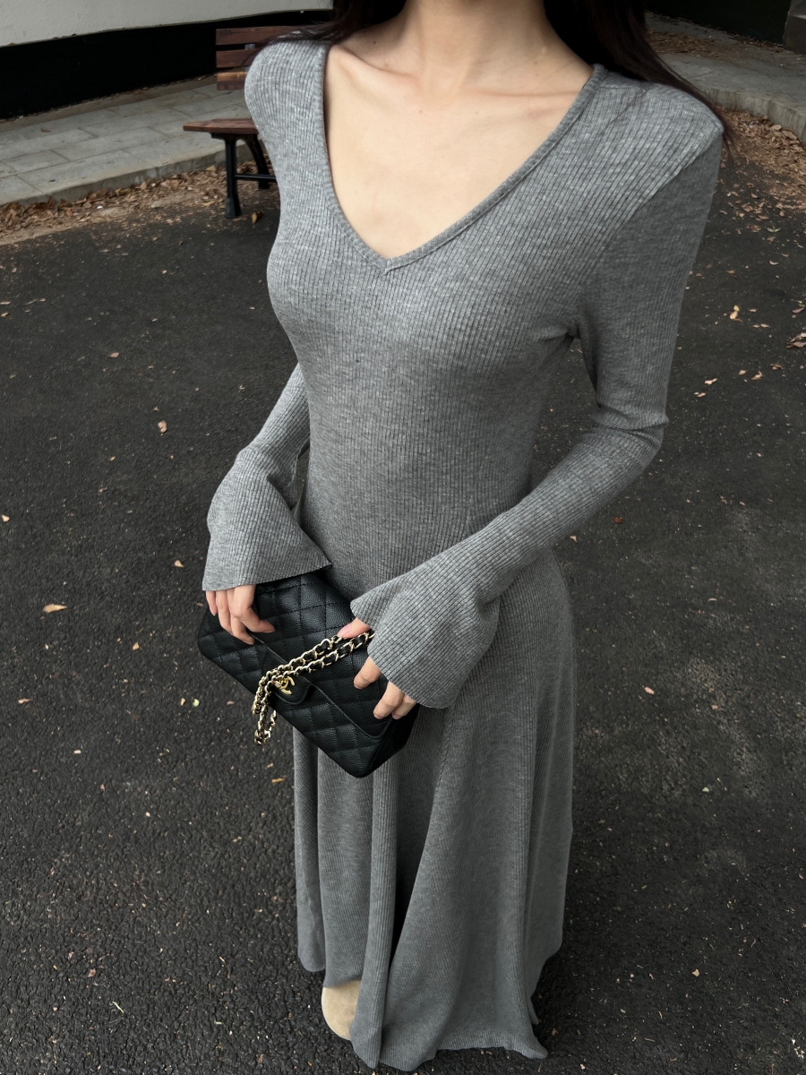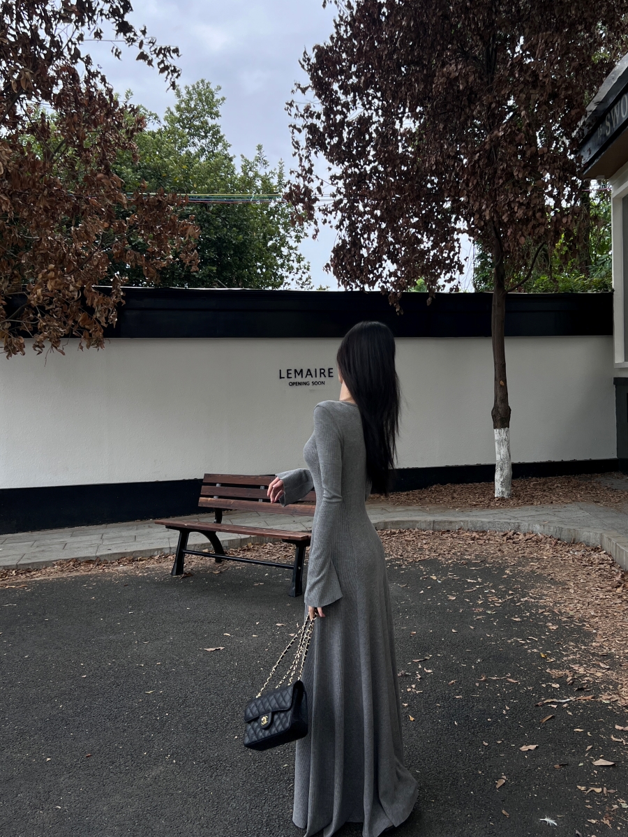 Gentle Style V Neck Long-Sleeved Knitted Dress for Women in Autum Black Sexy Waist Slimming Long Skirt