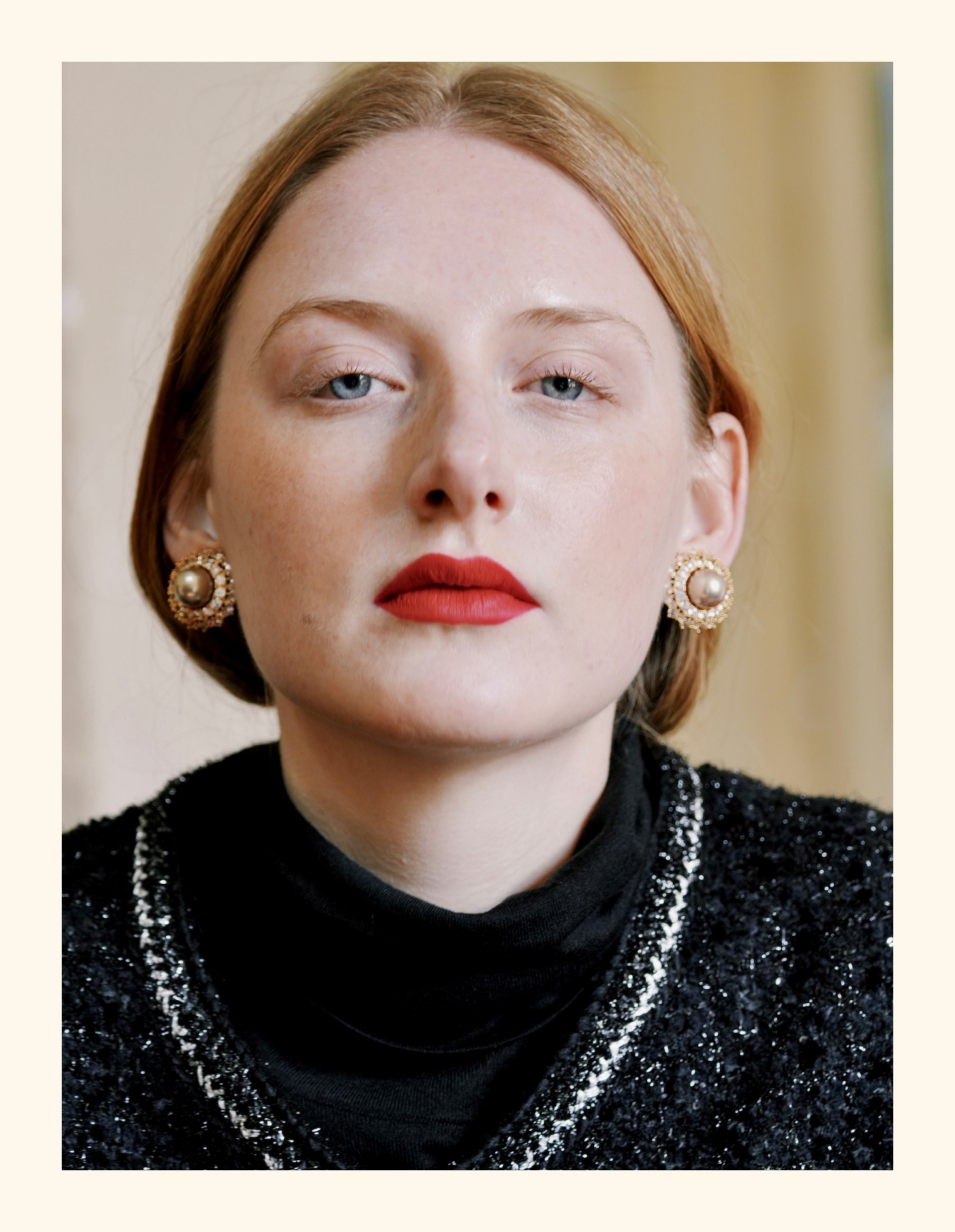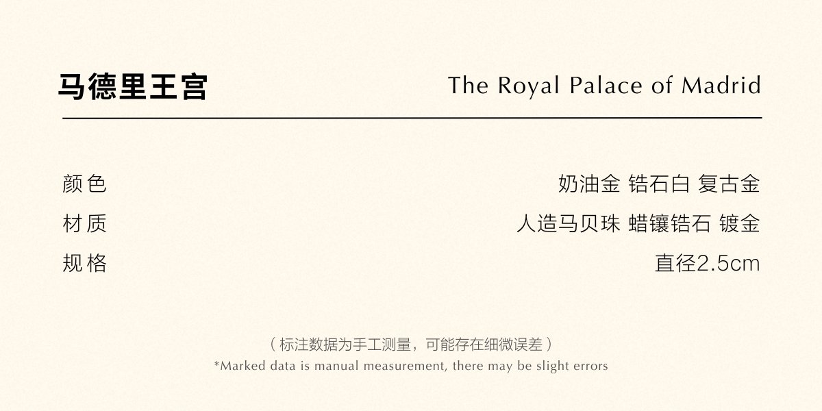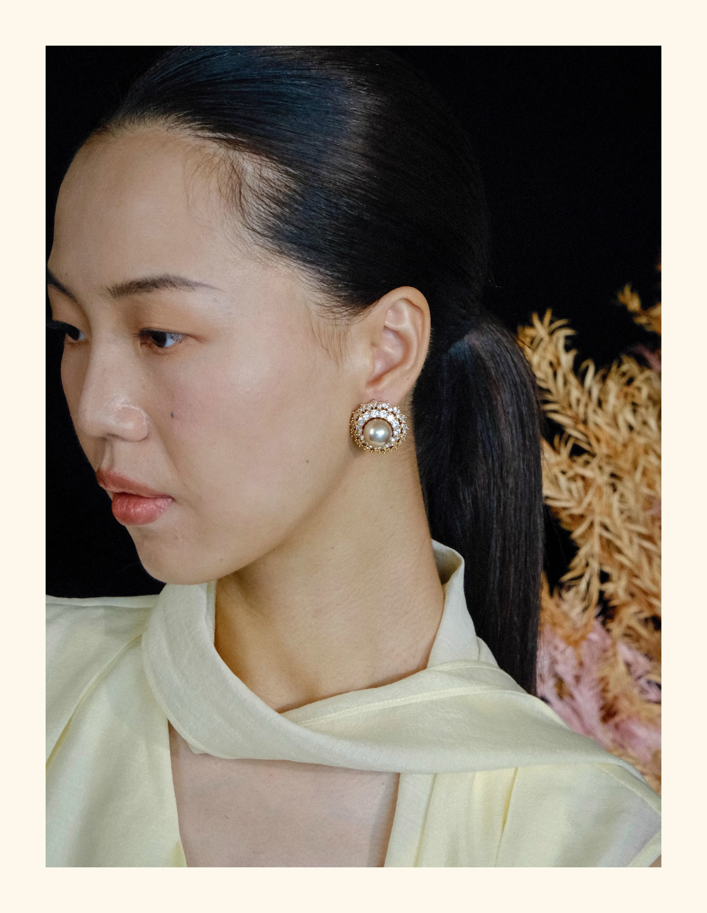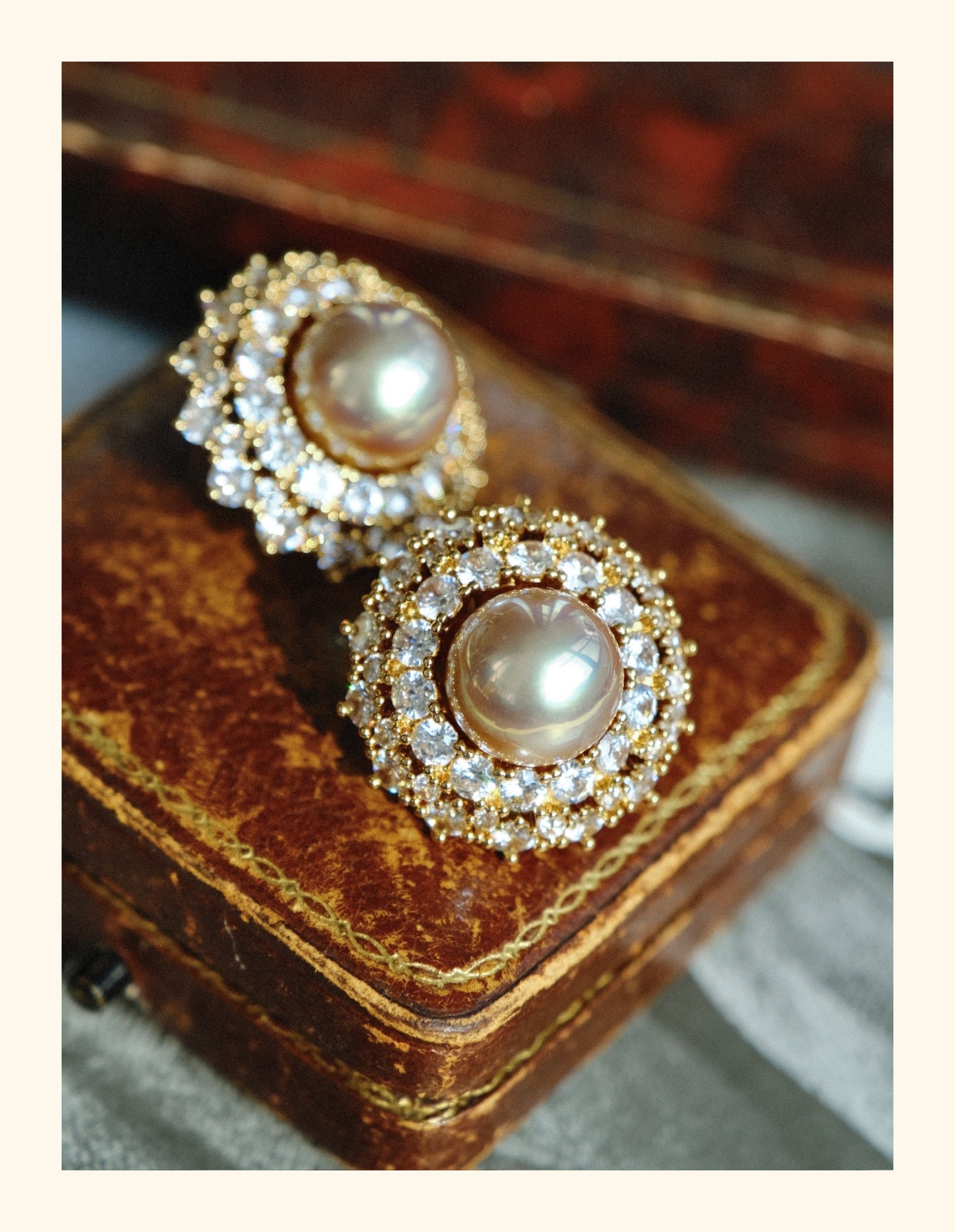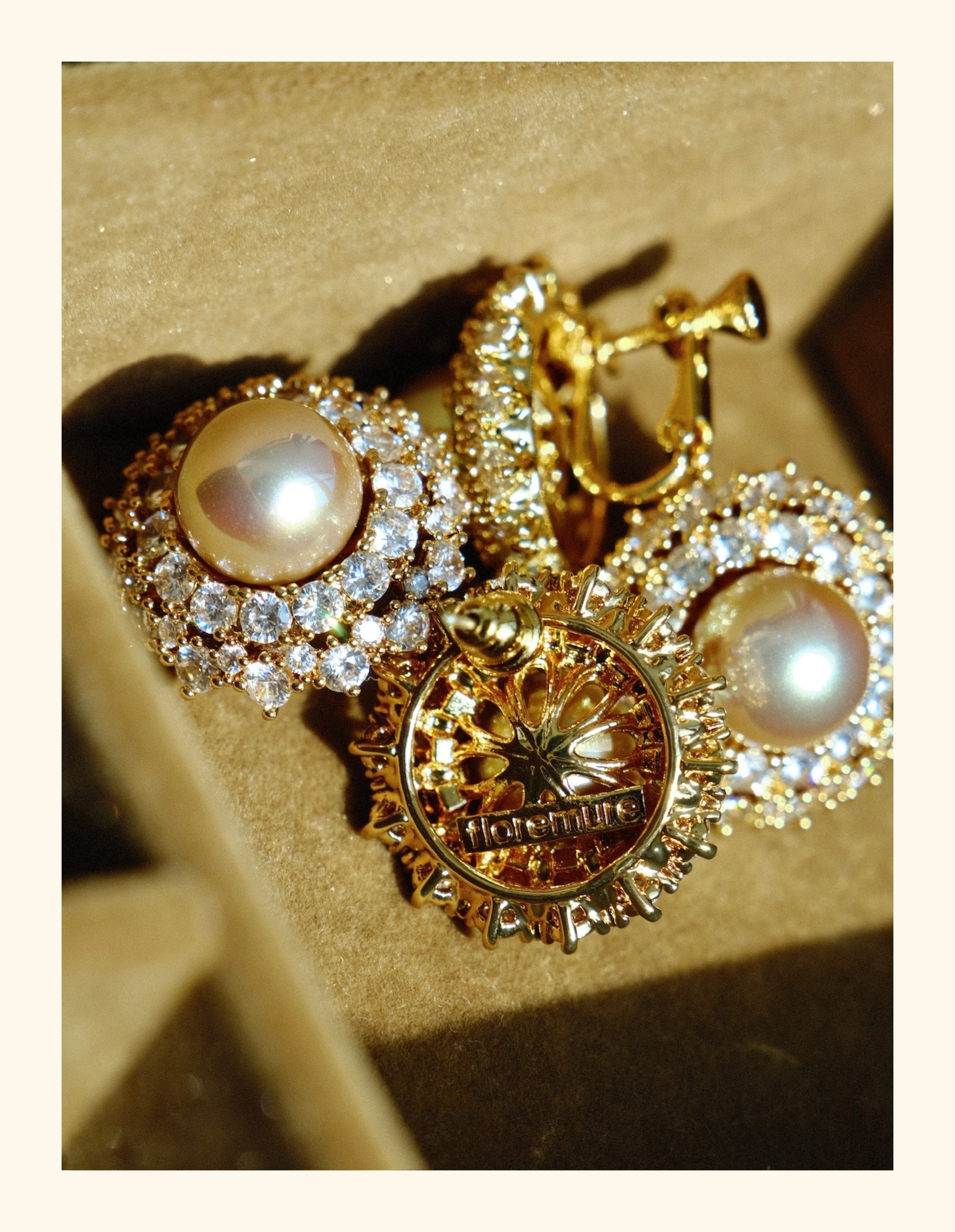 Antique Line "Royal Palace of Madrid" Hw Cream Gold Mother-Of-Pearl Earrings Fully Encrusted with Zircon, Luxurious Palace-Style Ear Clips