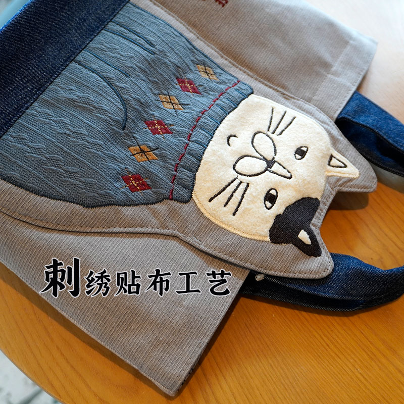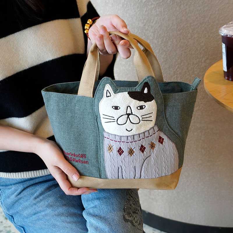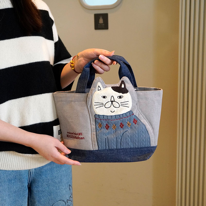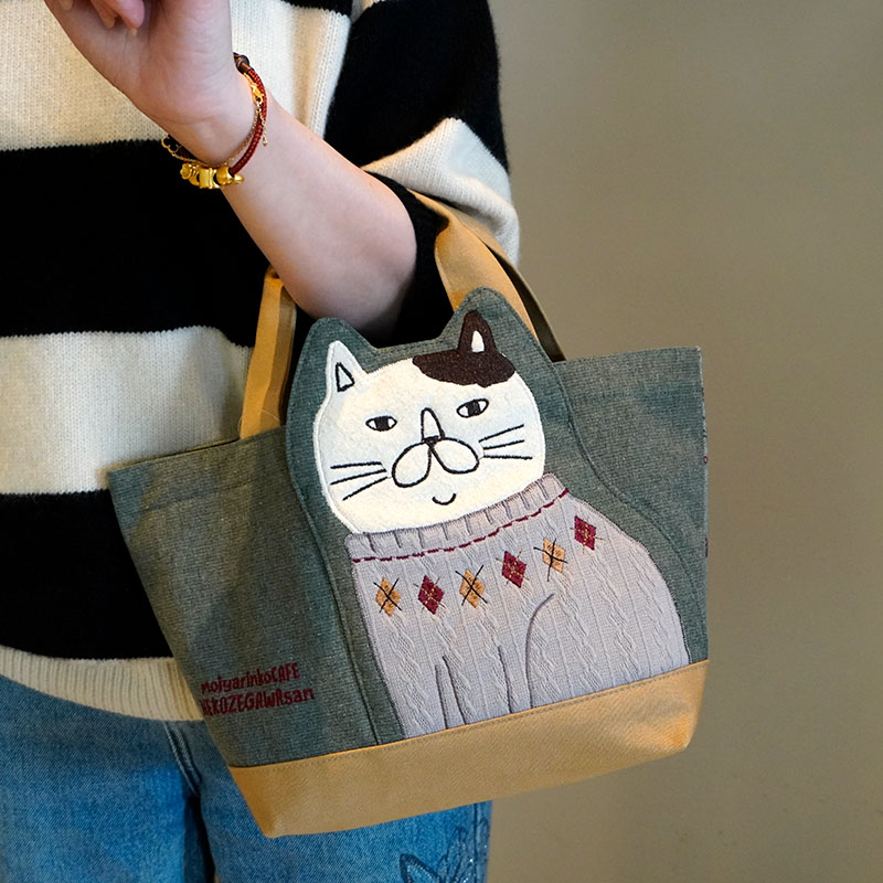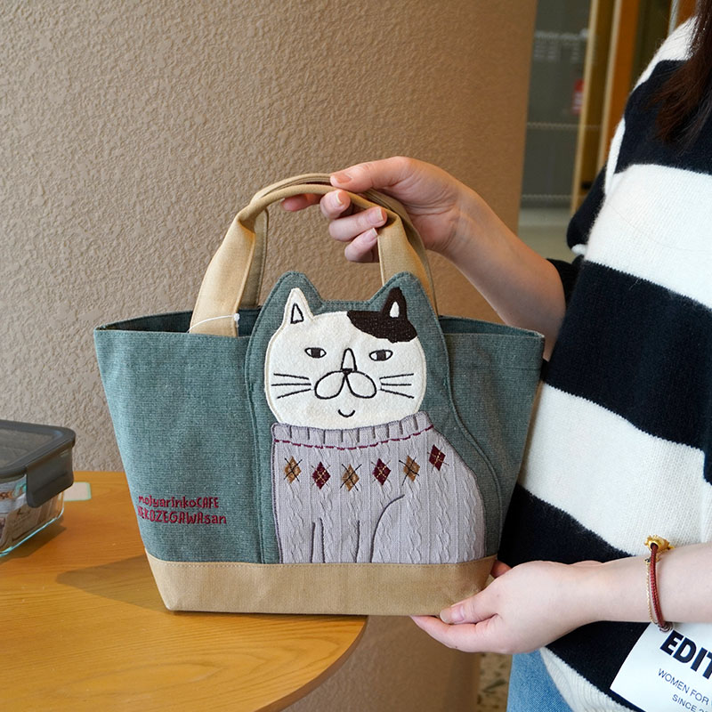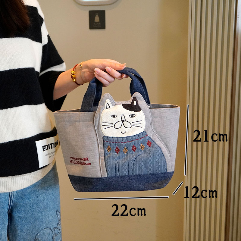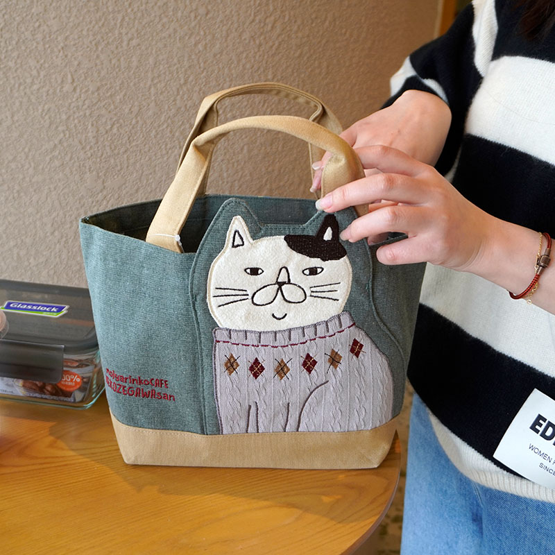 Japanese-Style Cute Heavy-Duty Patchwork Embroidered Sweater Cat Large-Capacity Zipper Lunch Box Bag for Commuting to Work