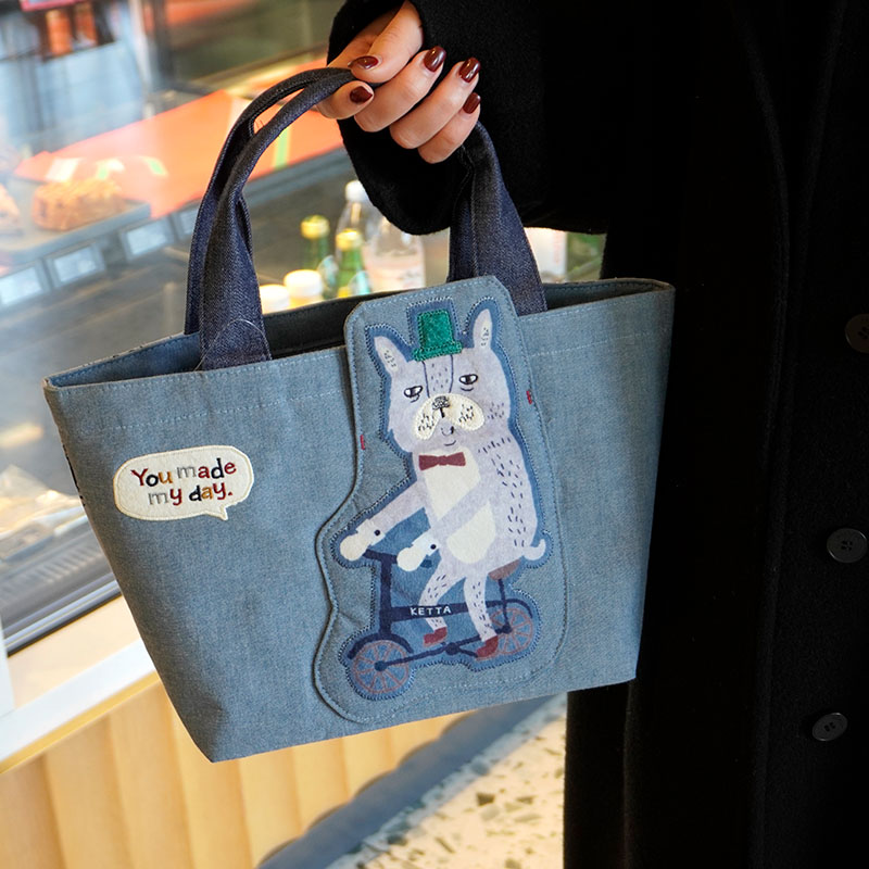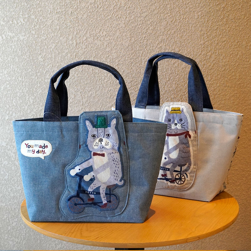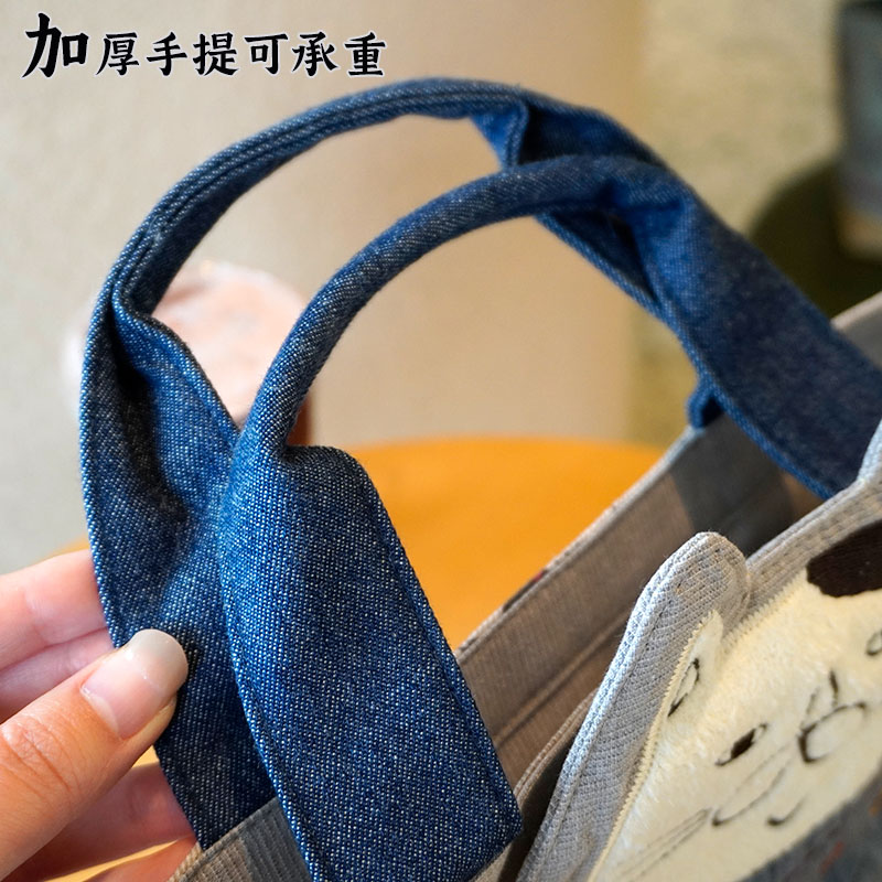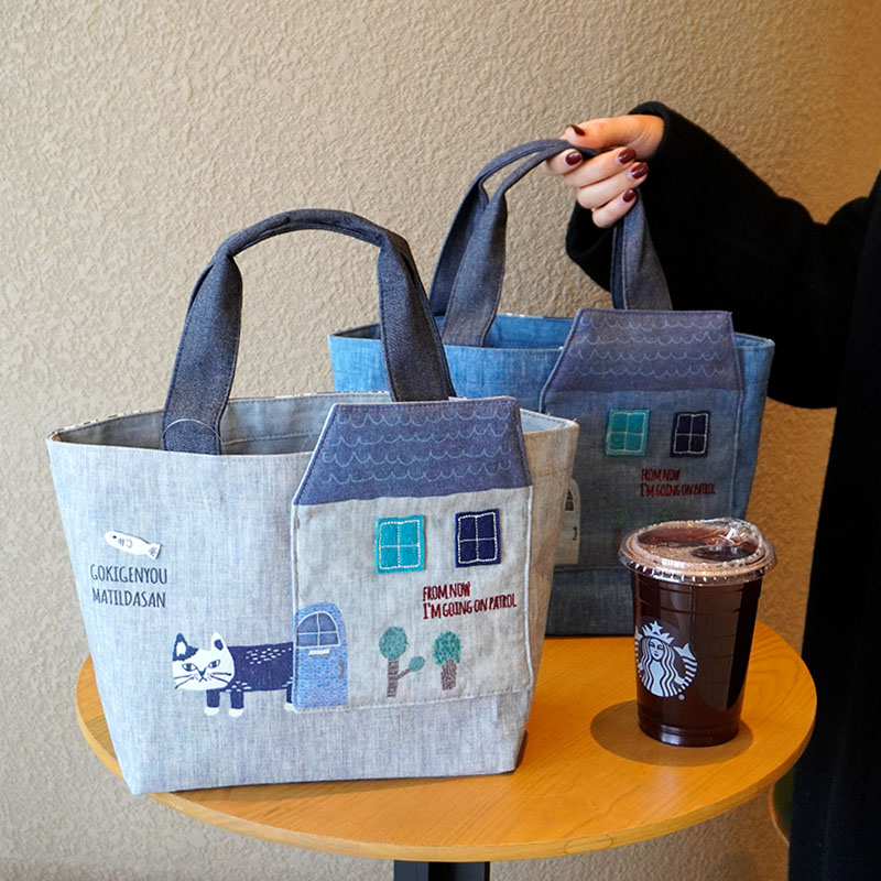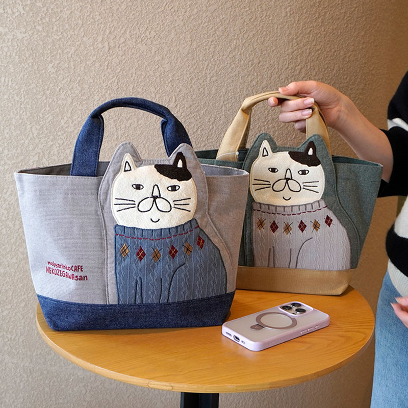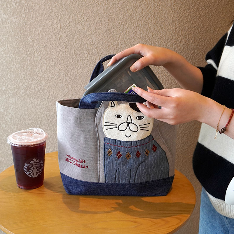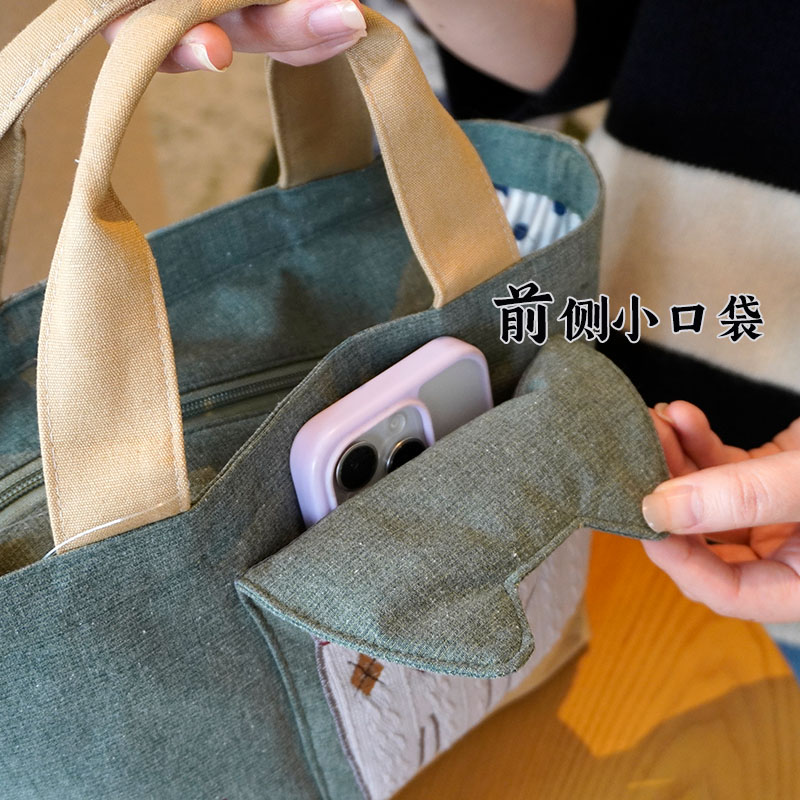 Japanese-Style Cute Heavy-Duty Patchwork Embroidered Sweater Cat Large-Capacity Zipper Lunch Box Bag for Commuting to Work