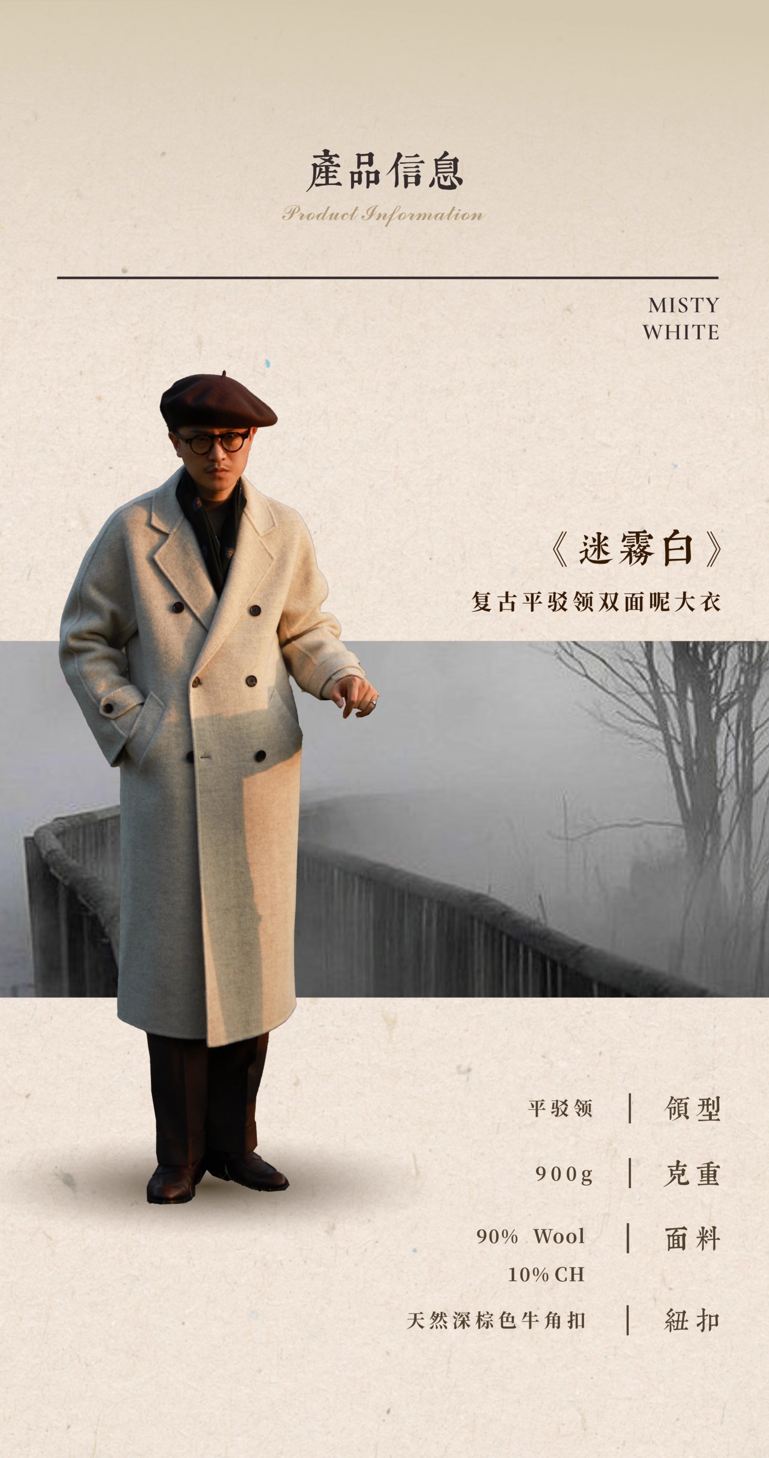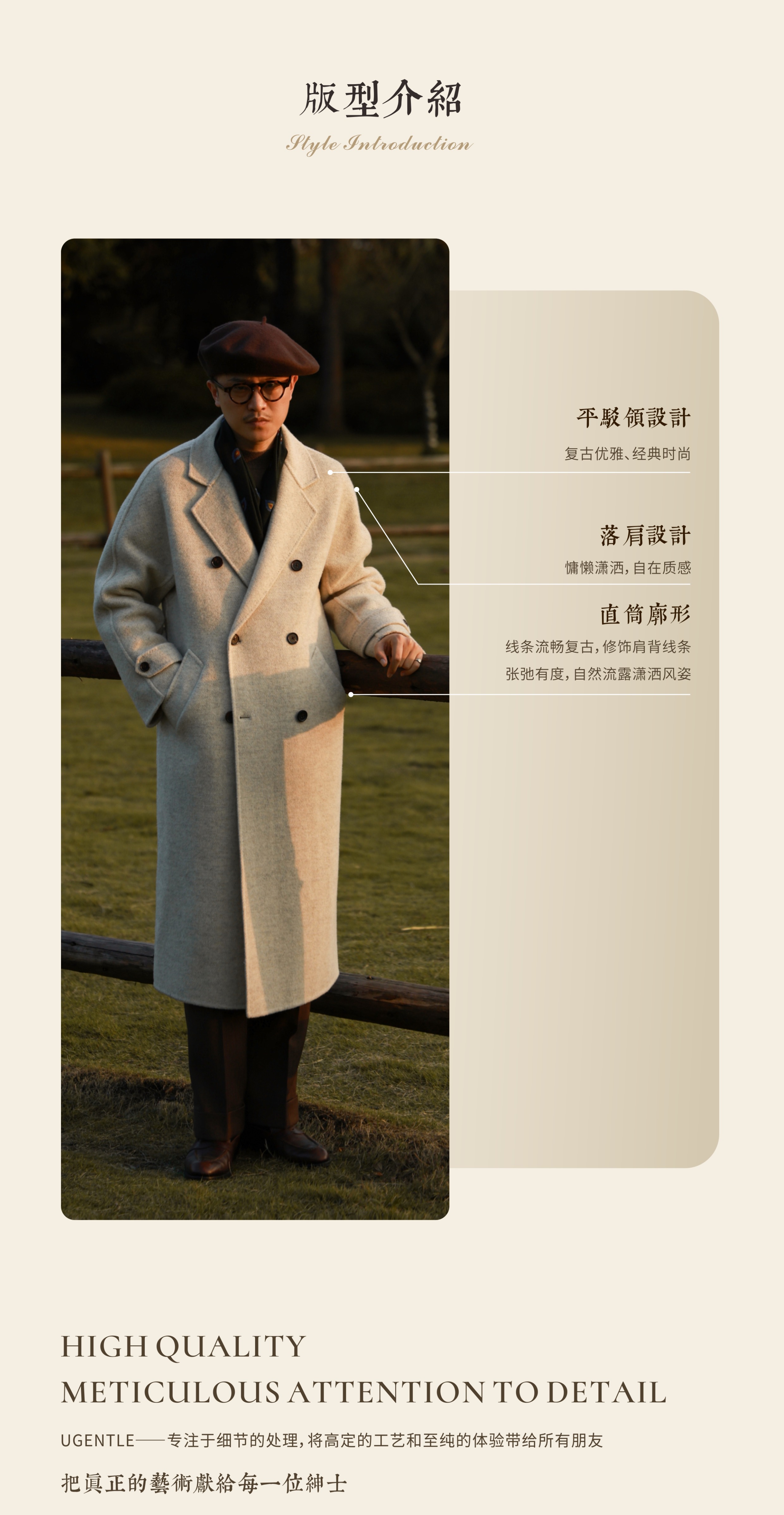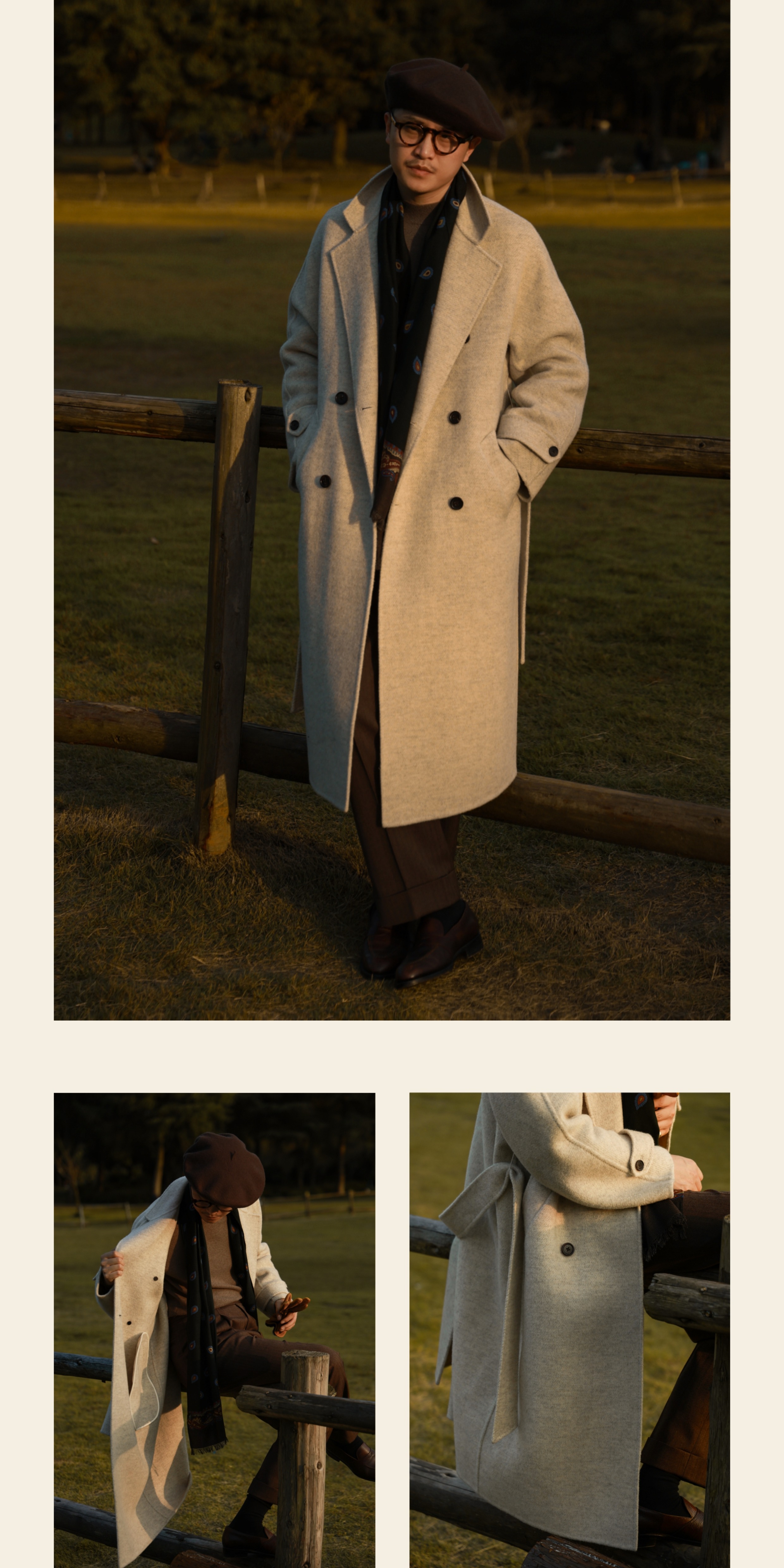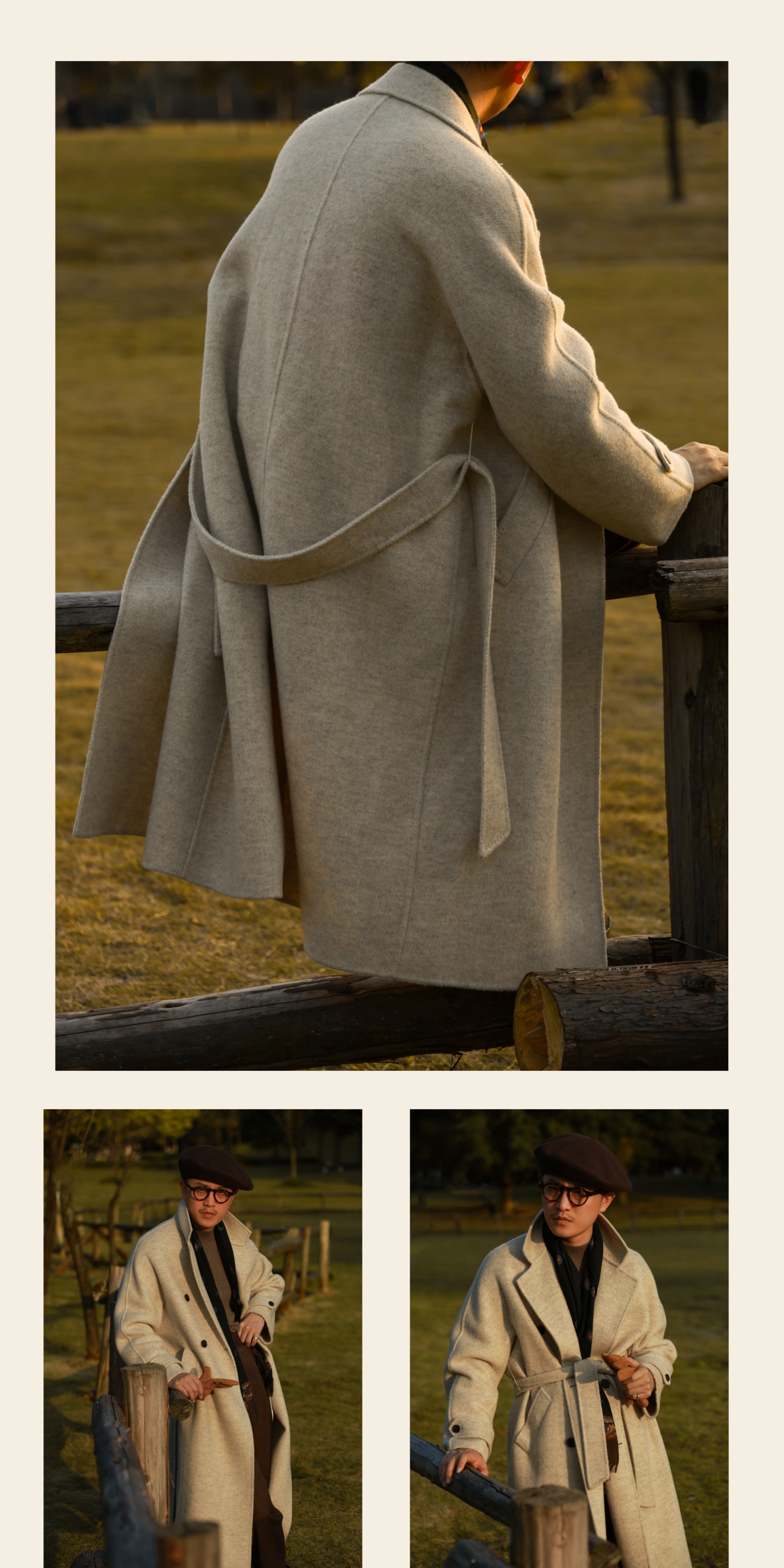 Ugentle Men's Winter Camel Wool'Misty White' Belted Double-Breasted Handmade Double-Sided Wool Coat