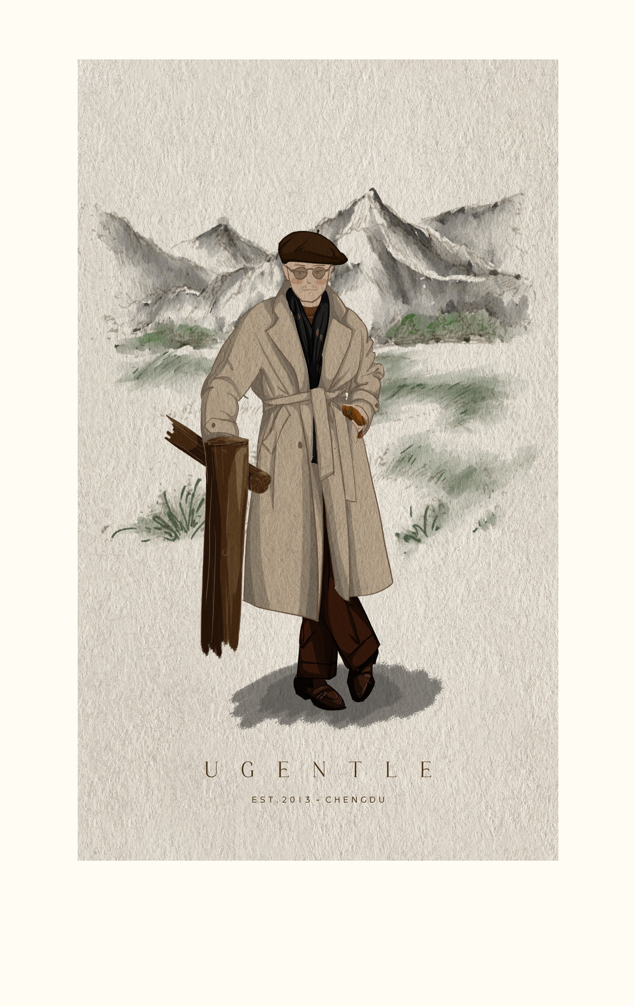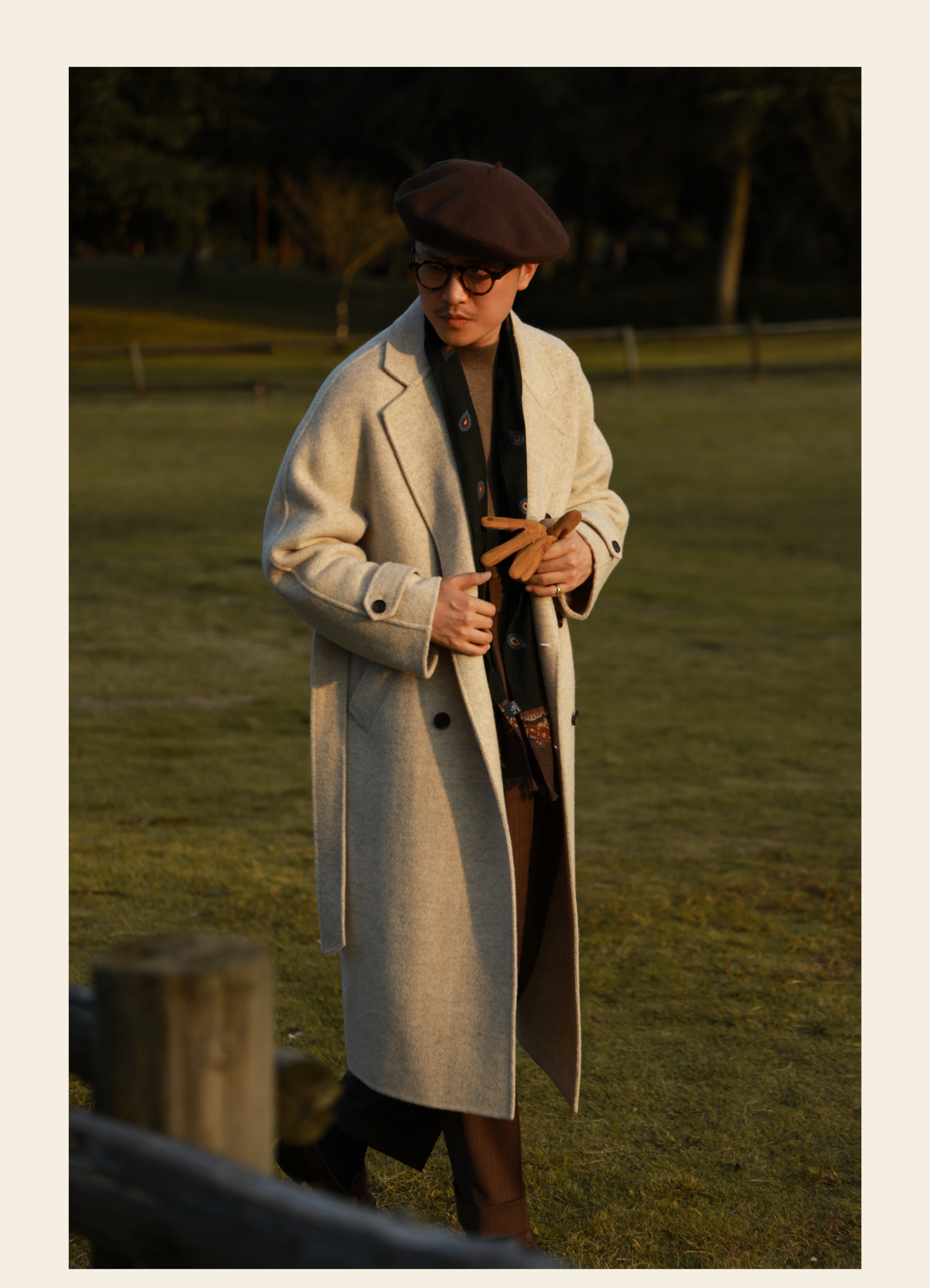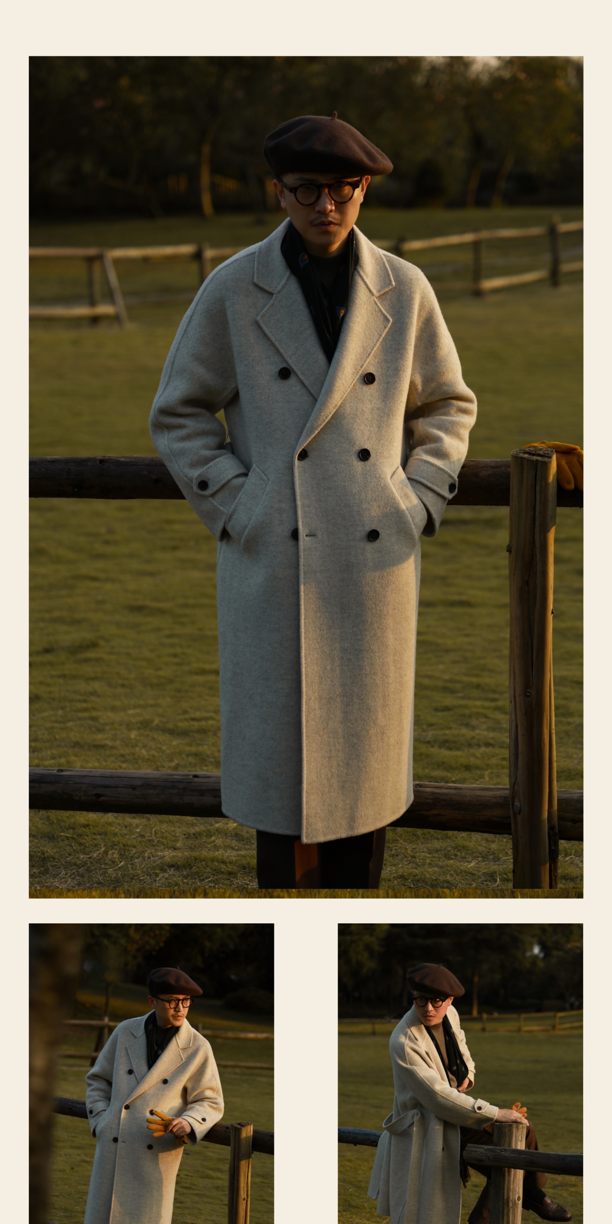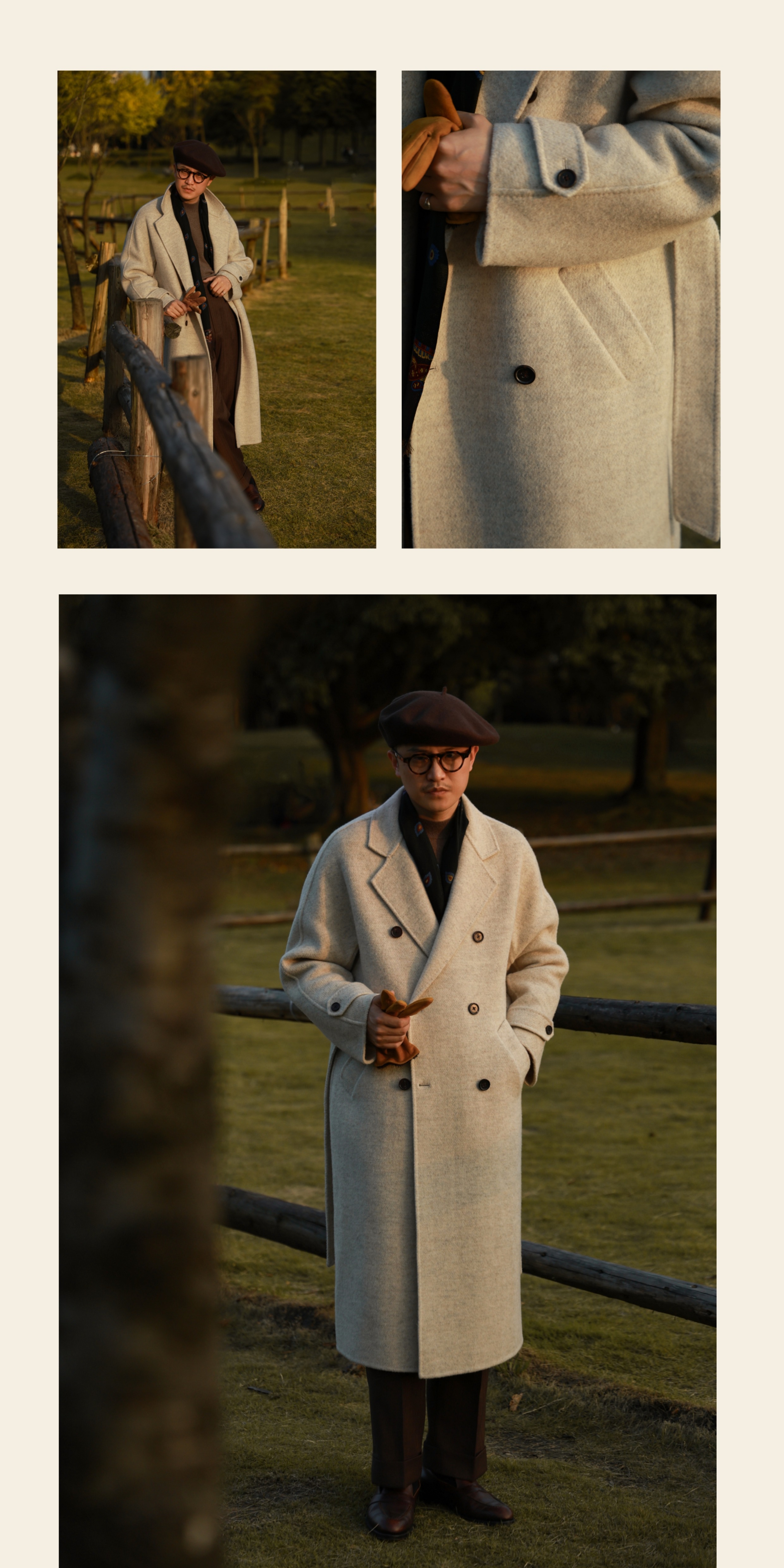 Ugentle Men's Winter Camel Wool'Misty White' Belted Double-Breasted Handmade Double-Sided Wool Coat