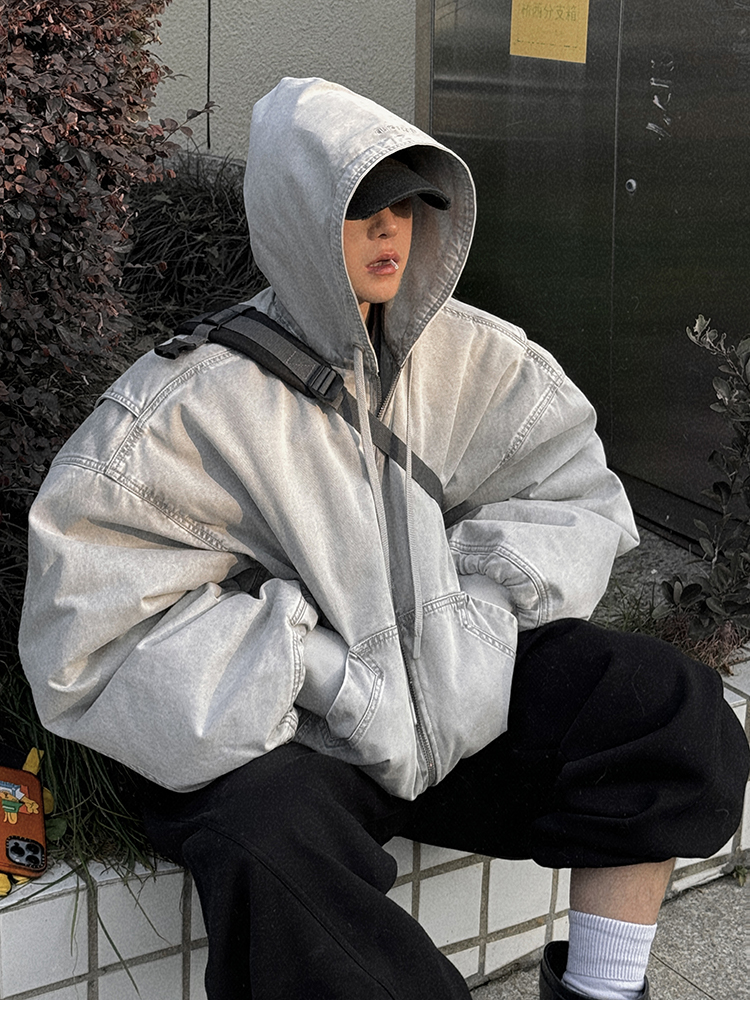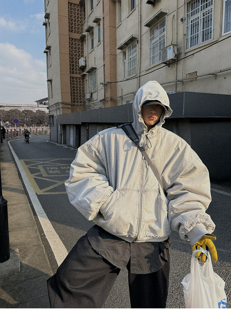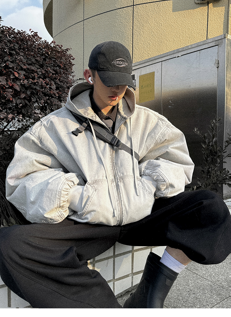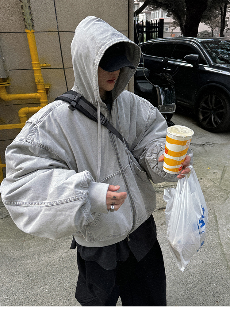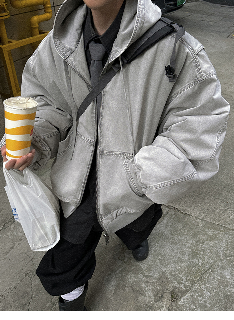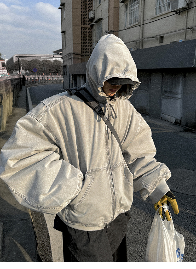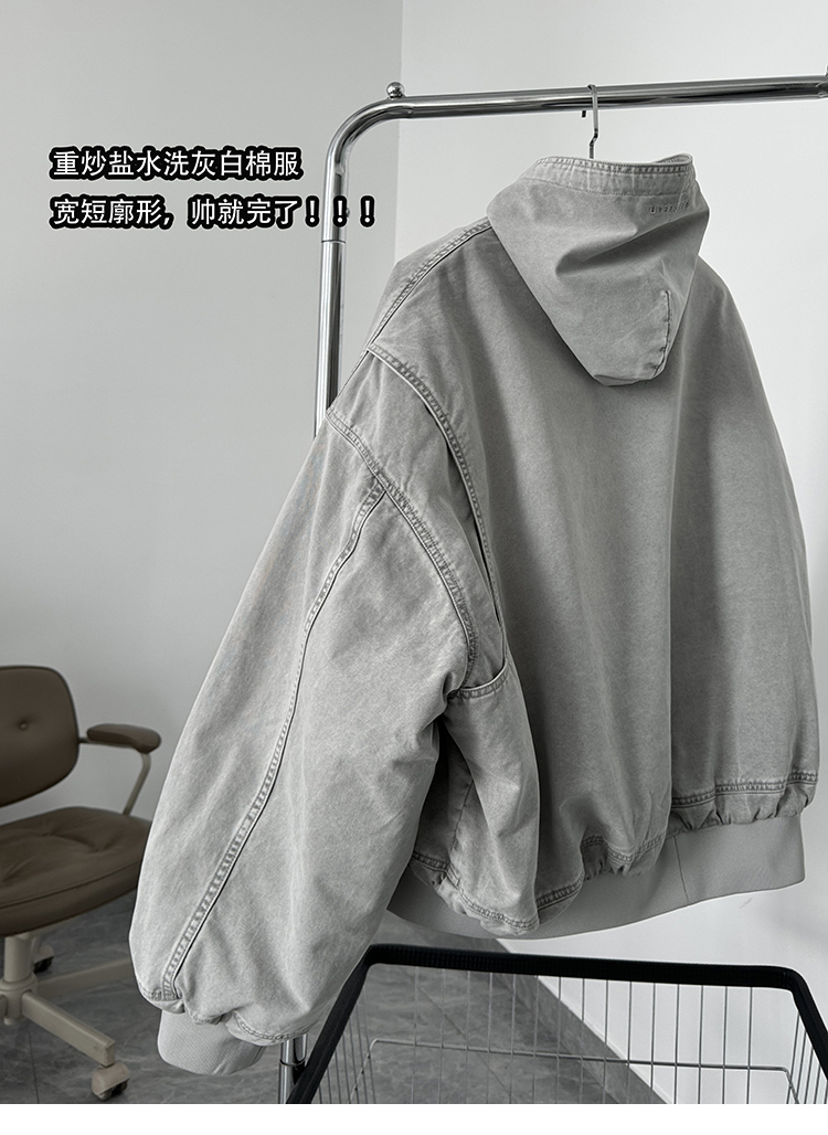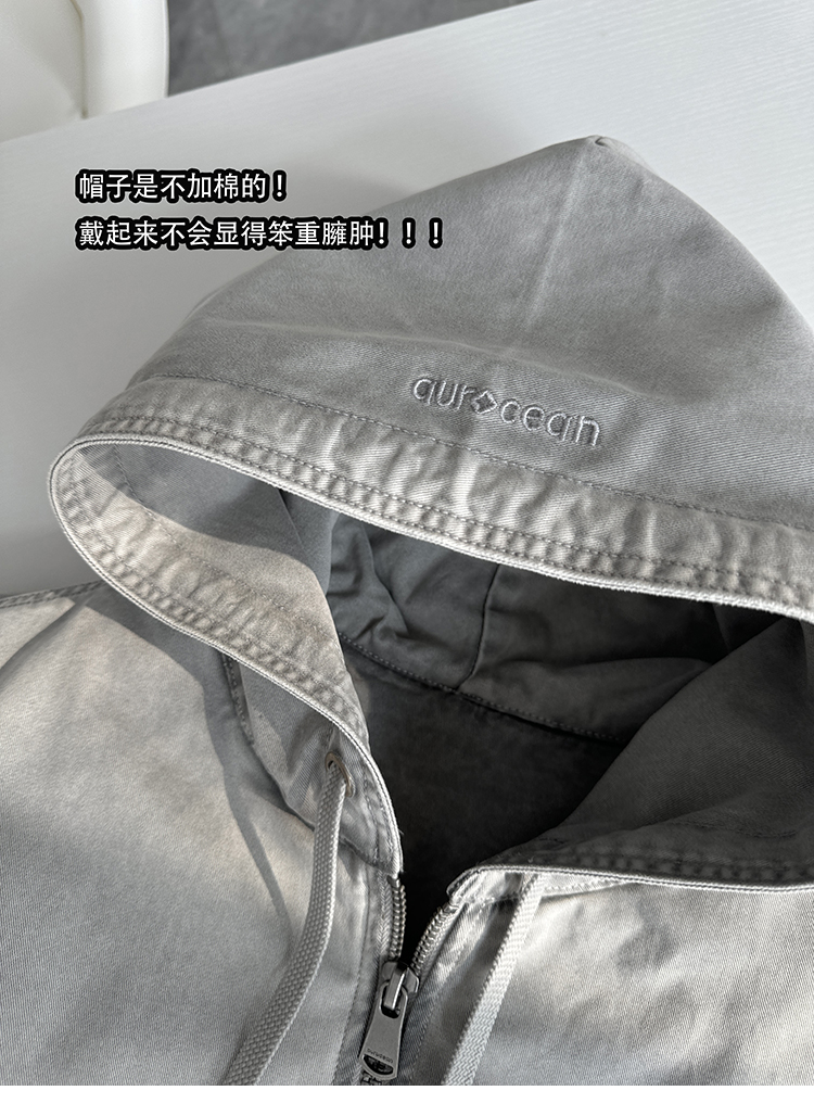 Aurocean Heavily Washed Salt Gray-White Wide Short Hooded Cotton Jacket, Washed Pure Cotton Vintage-Style Thickened Warm Cotton Coat