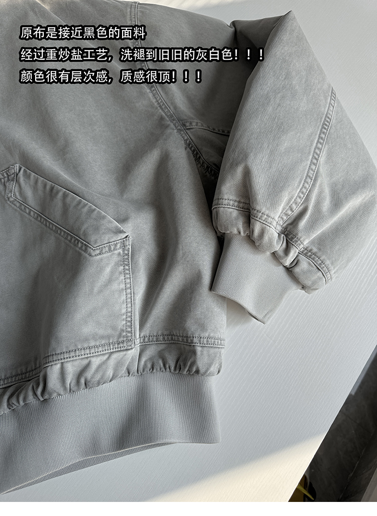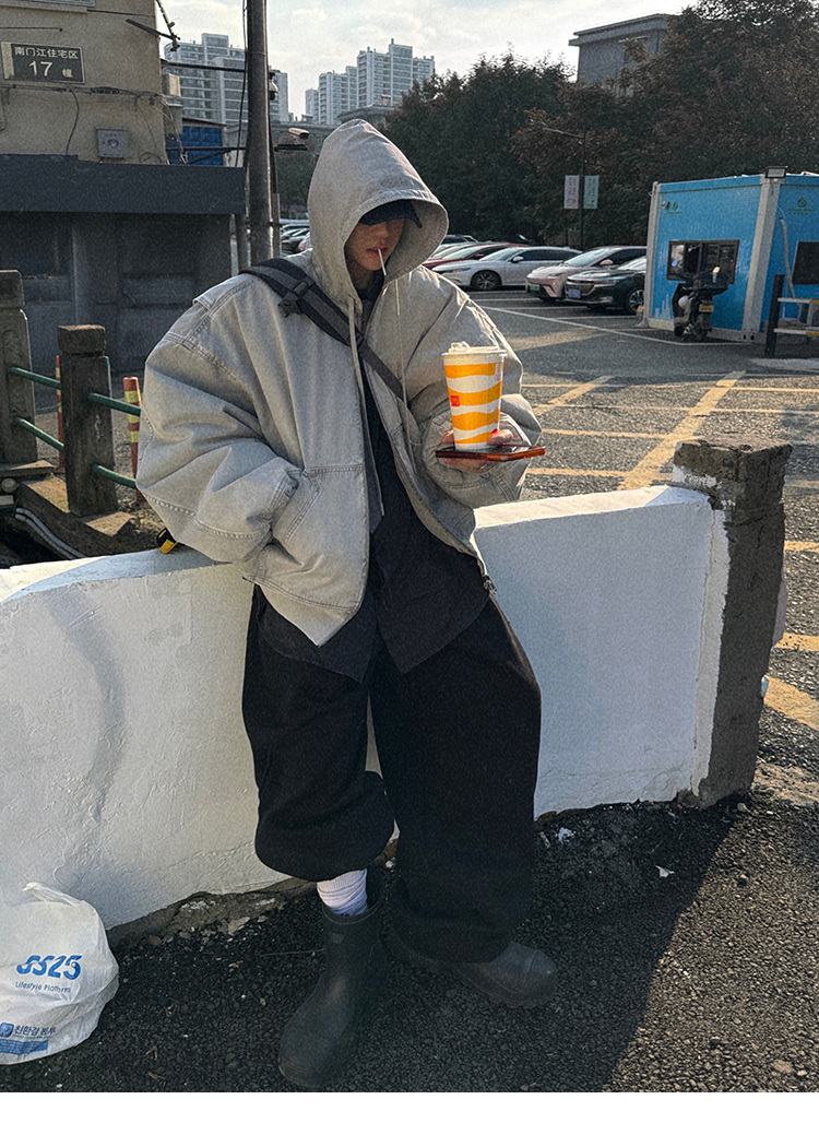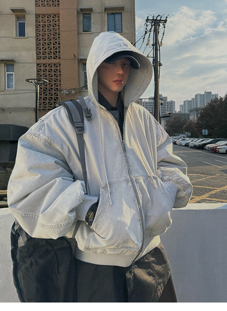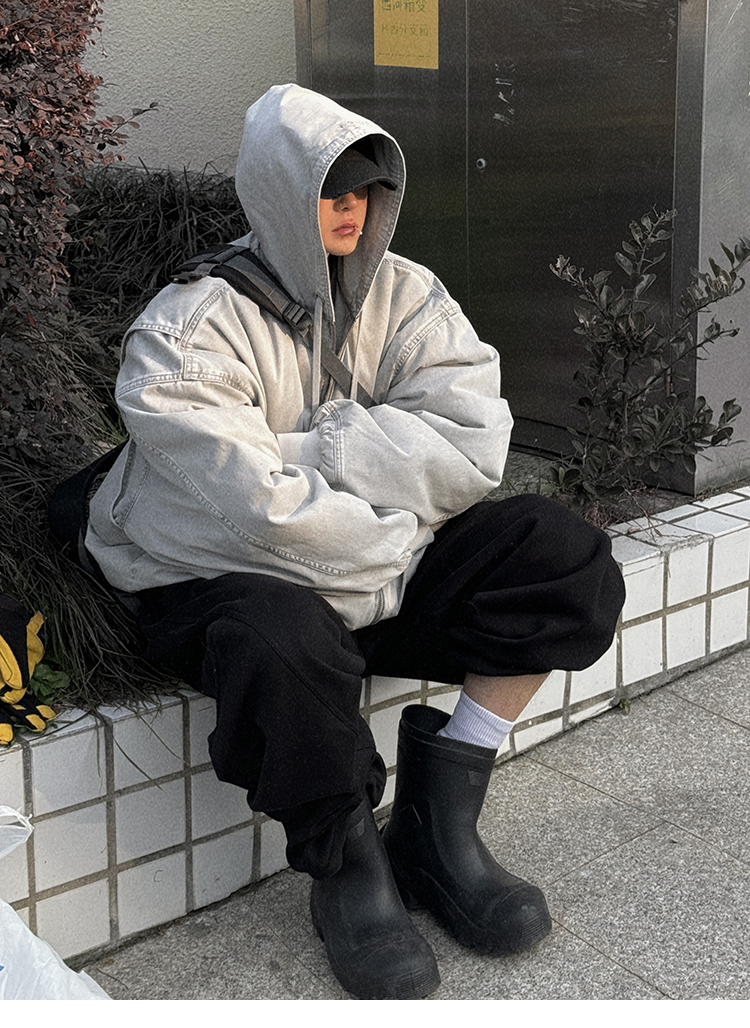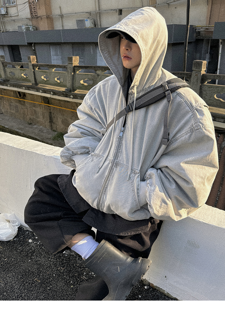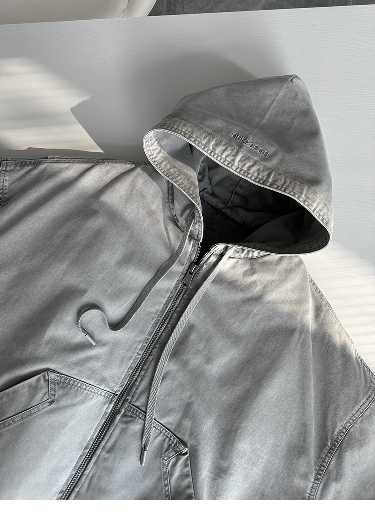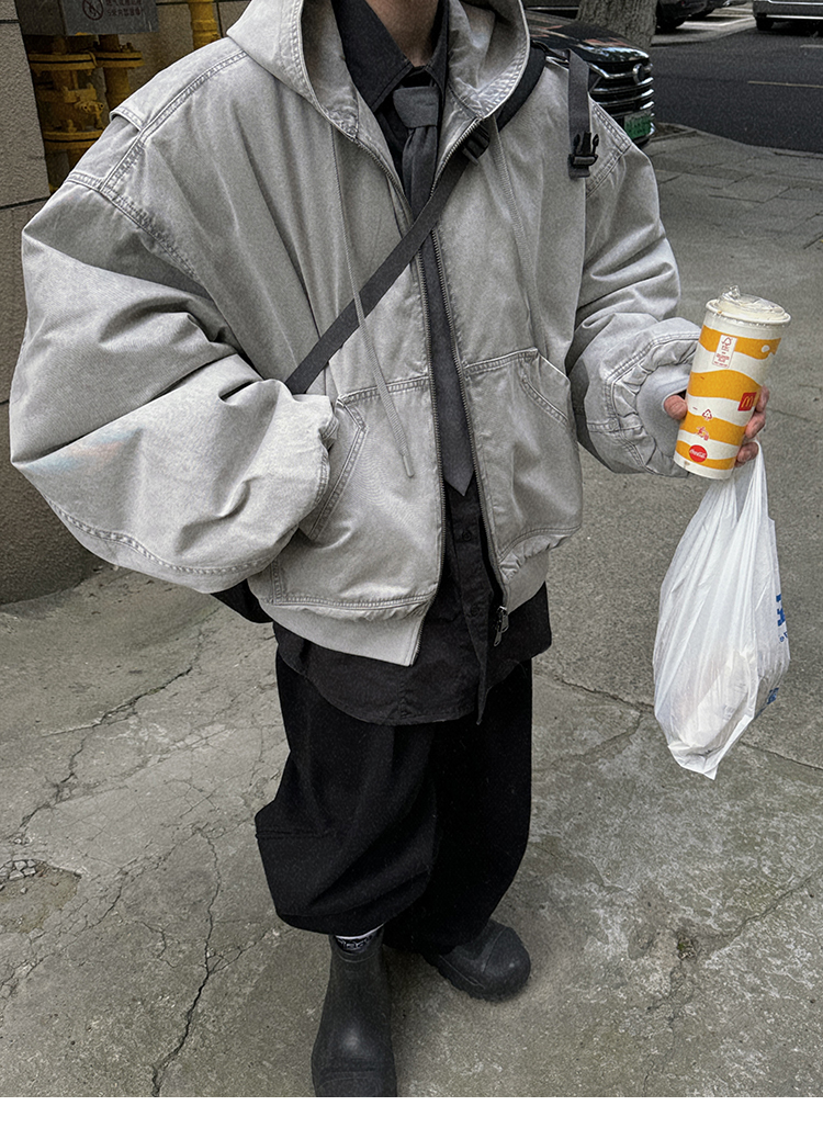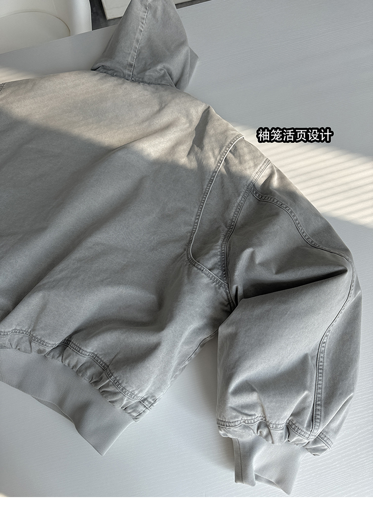 Aurocean Heavily Washed Salt Gray-White Wide Short Hooded Cotton Jacket, Washed Pure Cotton Vintage-Style Thickened Warm Cotton Coat