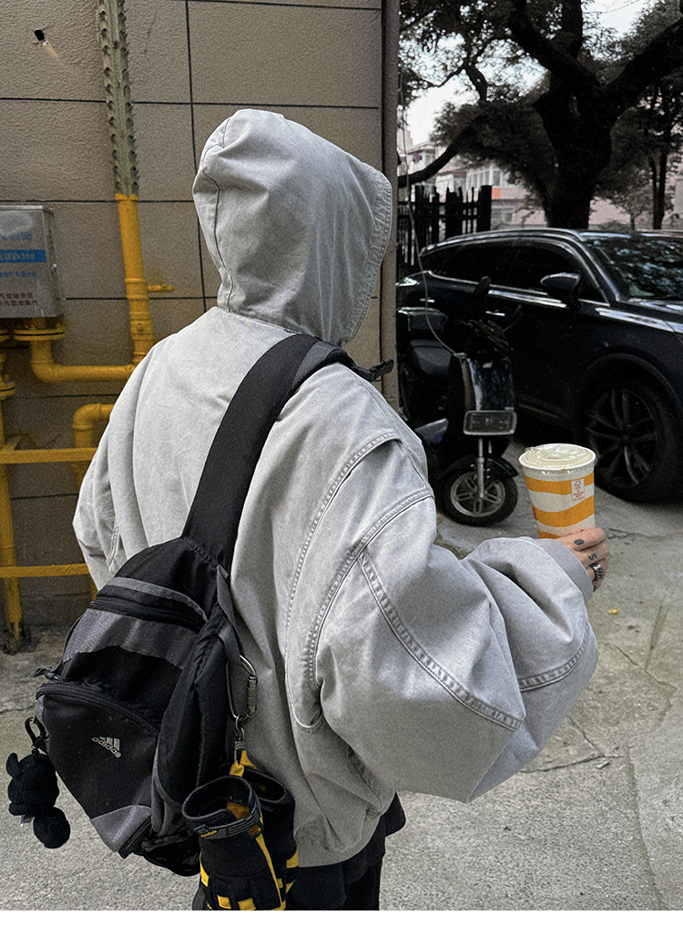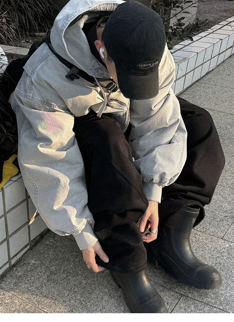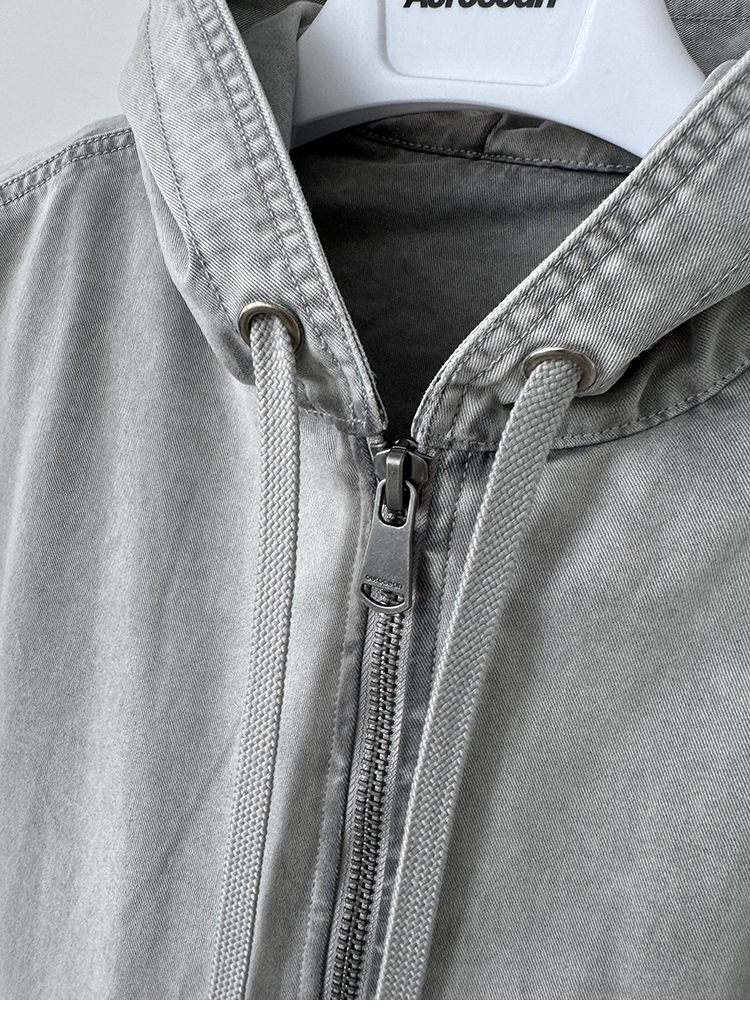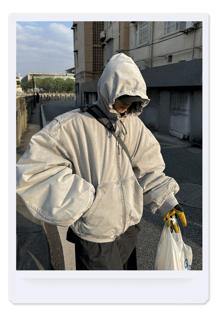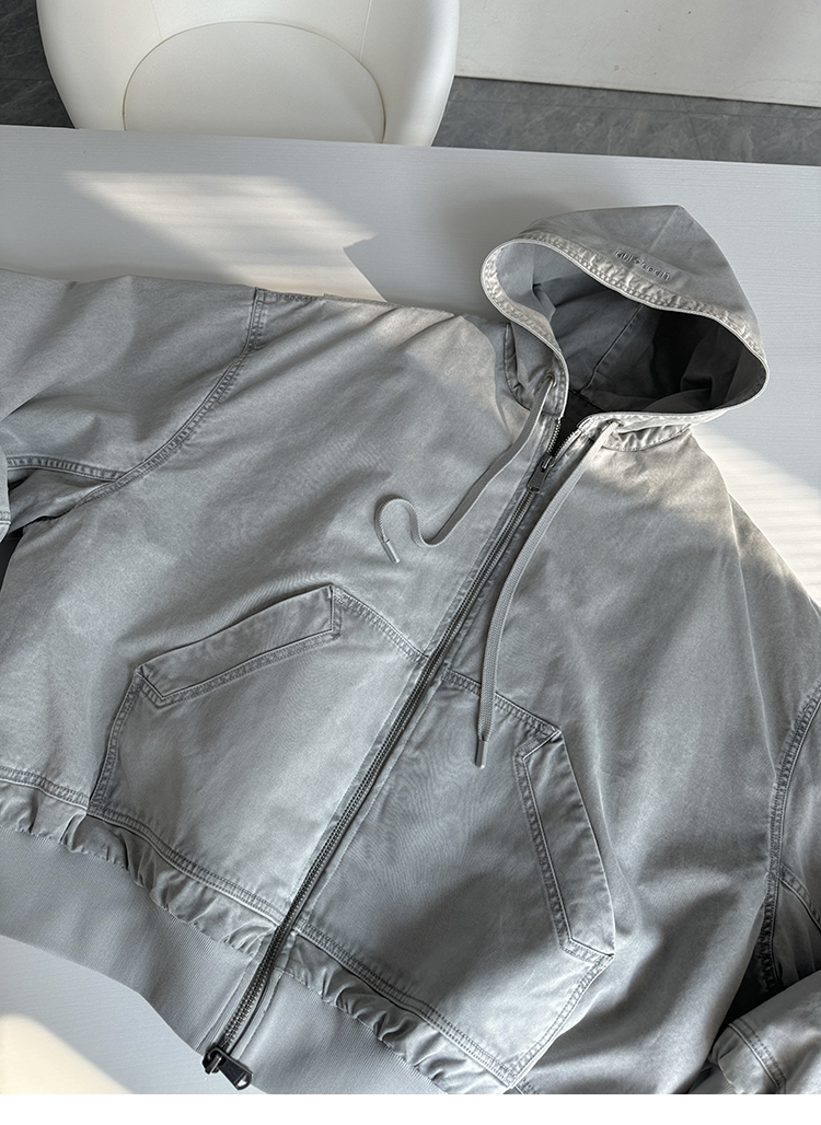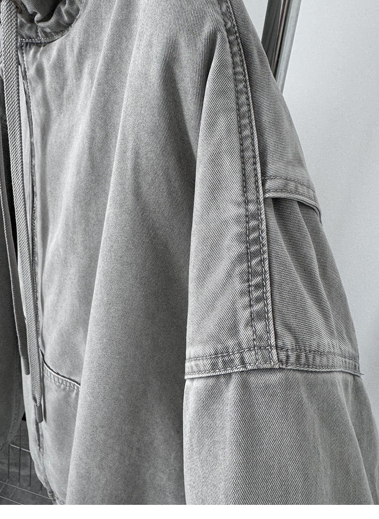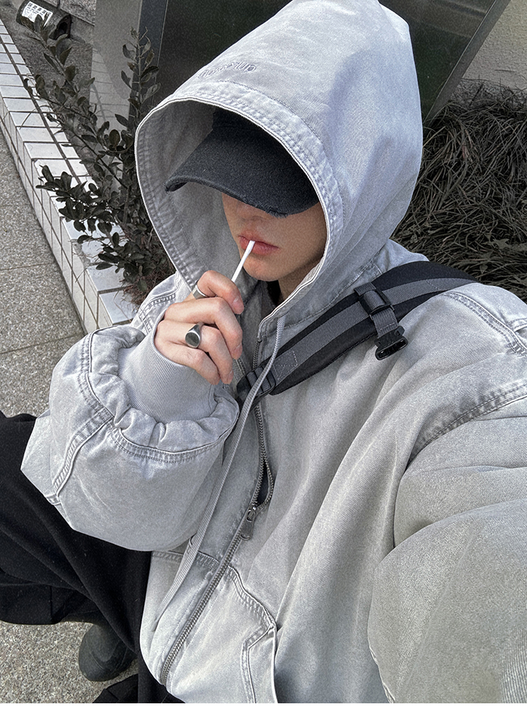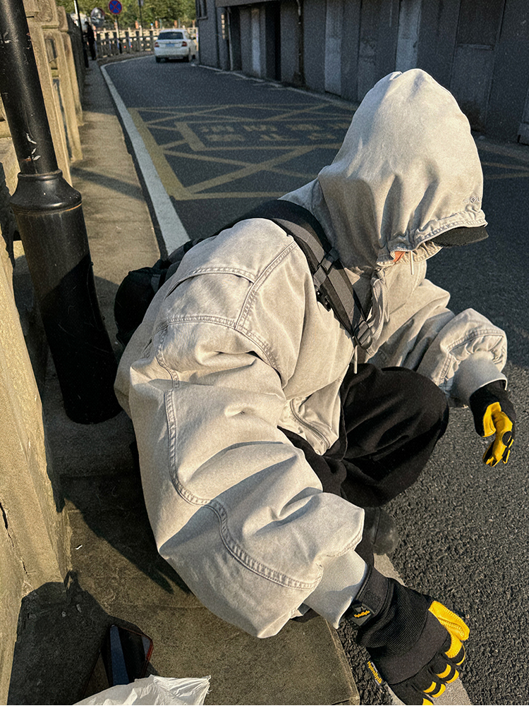 Aurocean Heavily Washed Salt Gray-White Wide Short Hooded Cotton Jacket, Washed Pure Cotton Vintage-Style Thickened Warm Cotton Coat