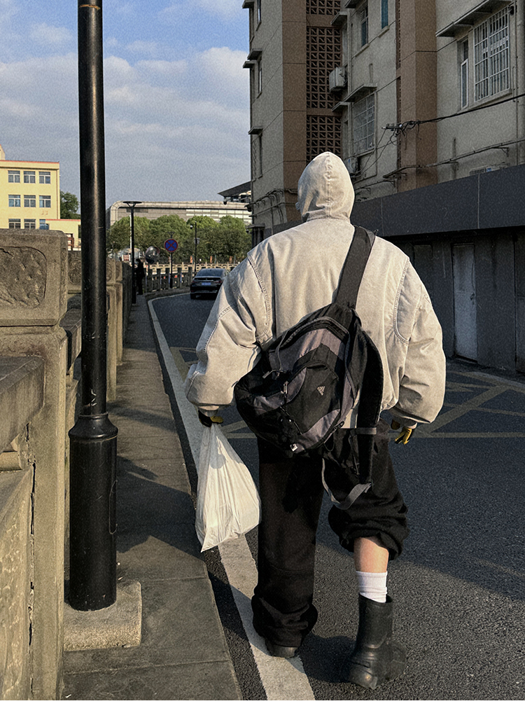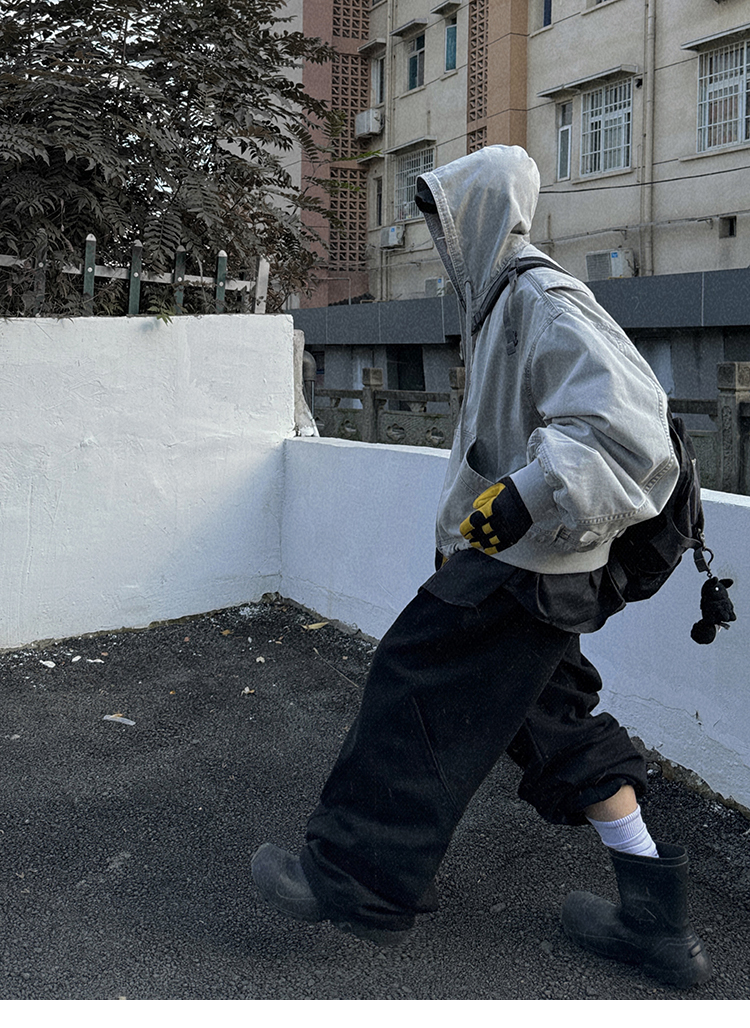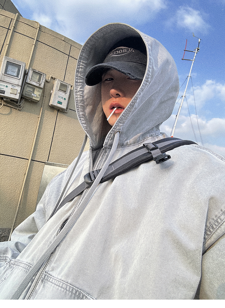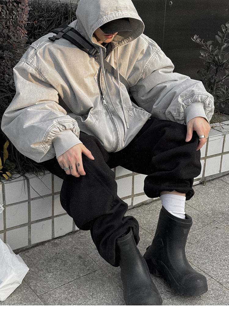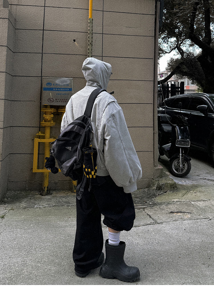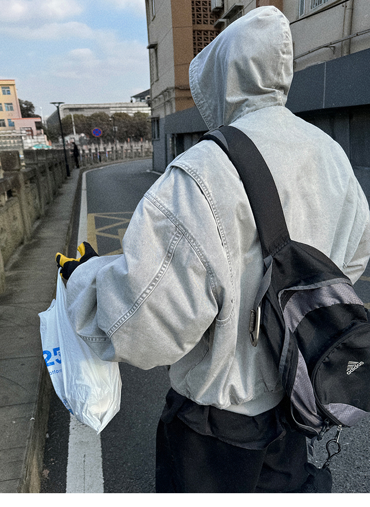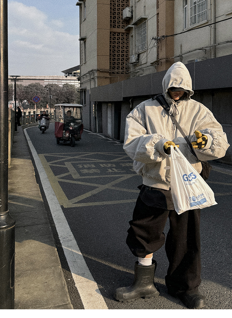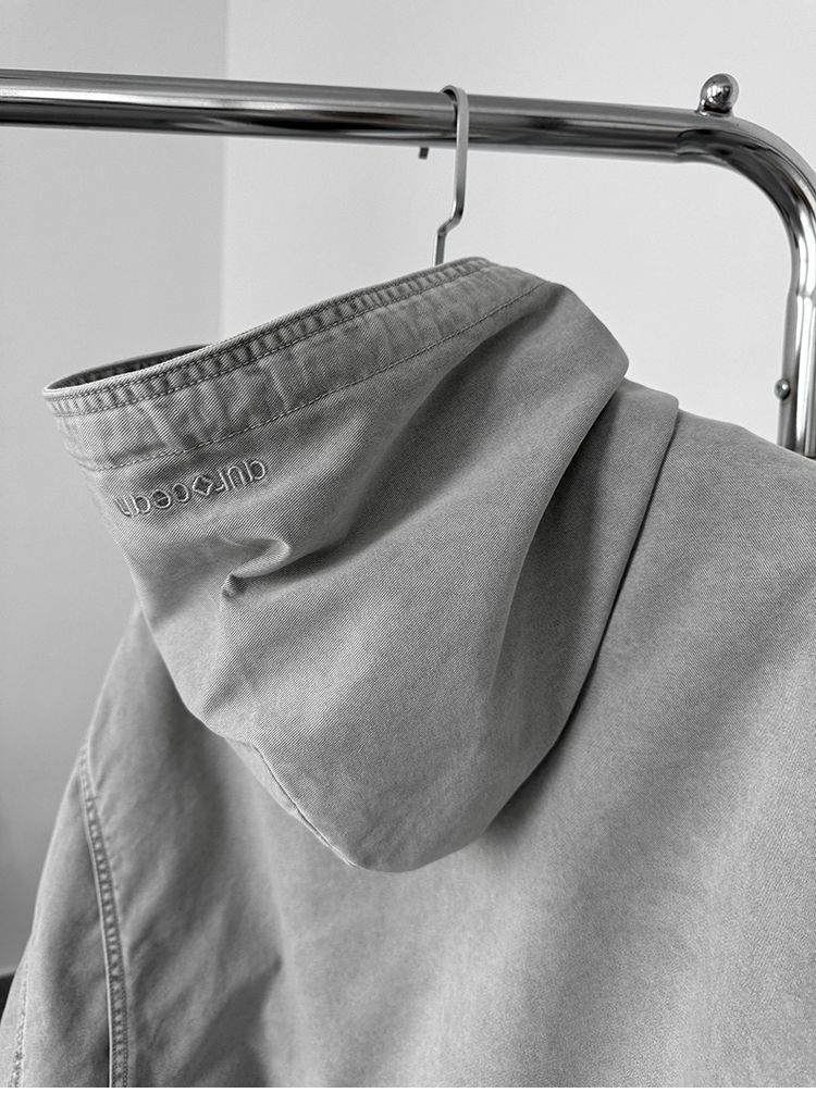 Aurocean Heavily Washed Salt Gray-White Wide Short Hooded Cotton Jacket, Washed Pure Cotton Vintage-Style Thickened Warm Cotton Coat
